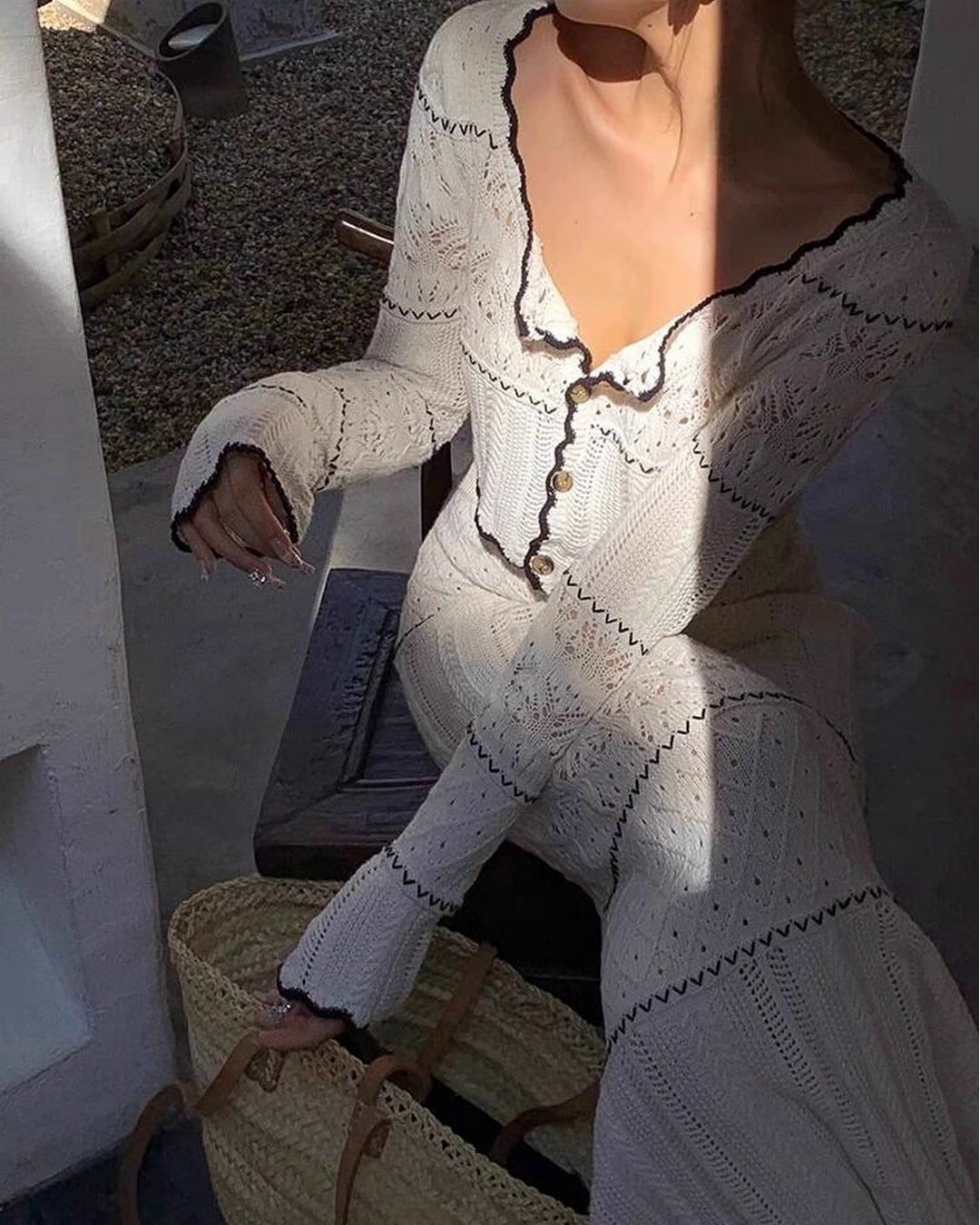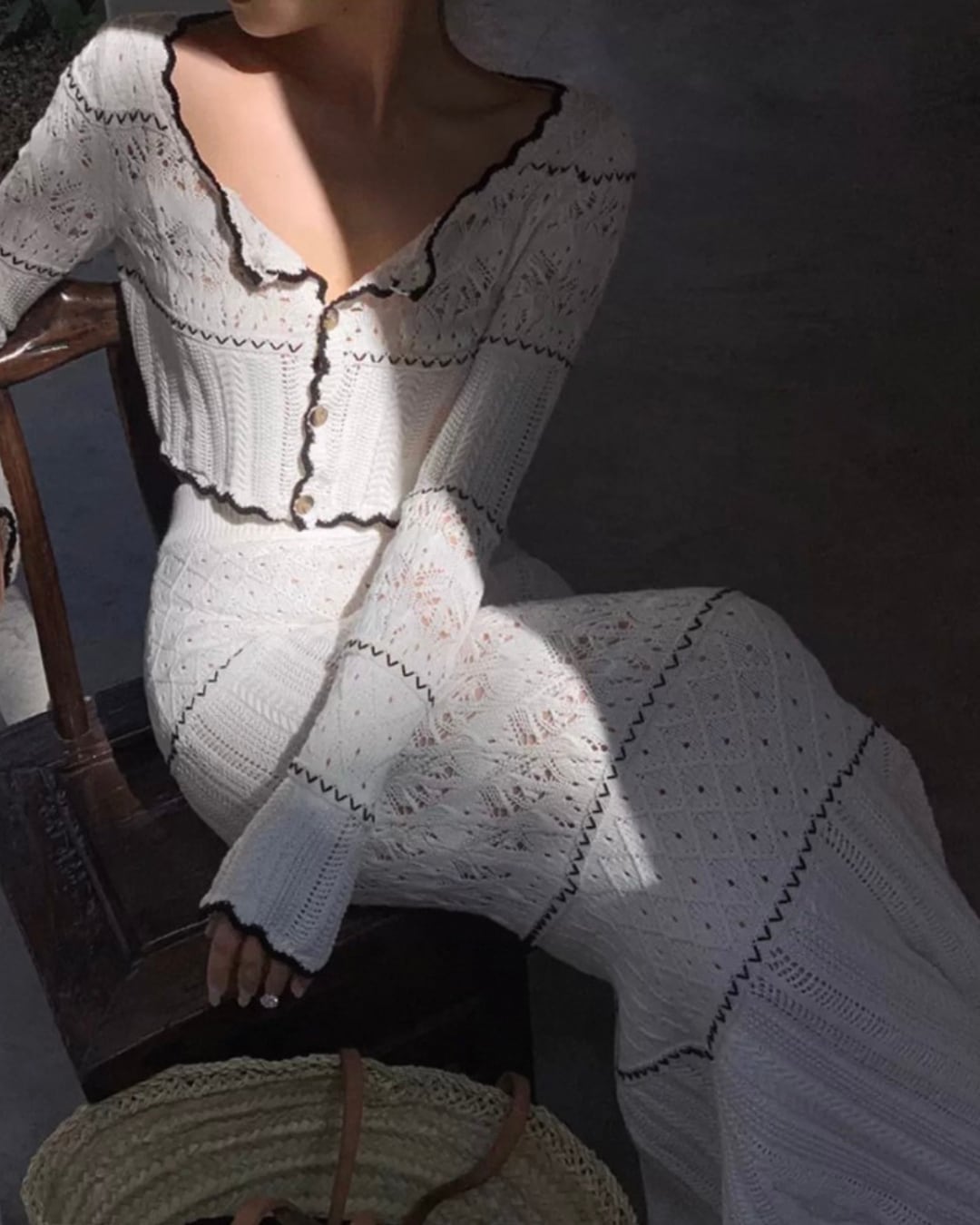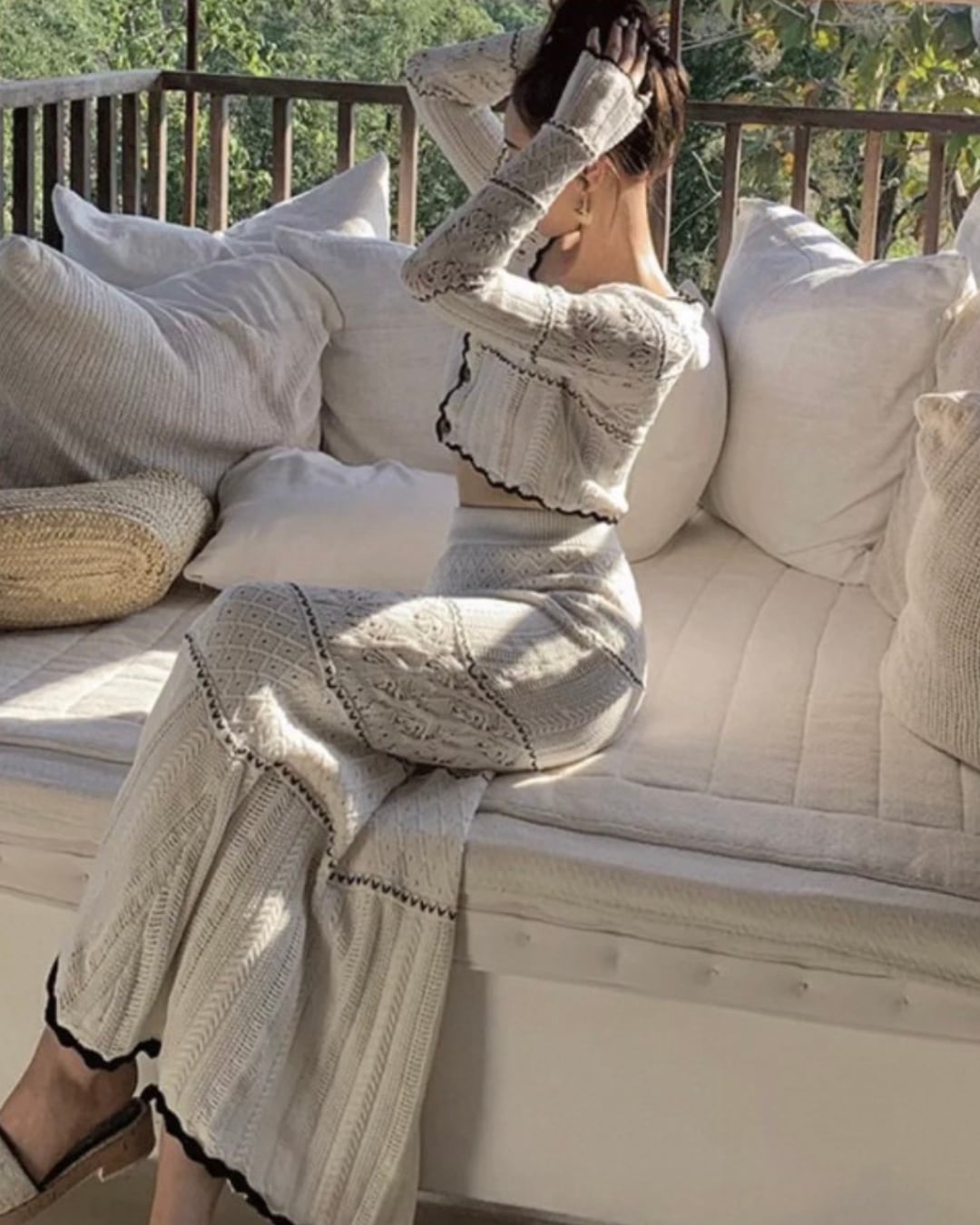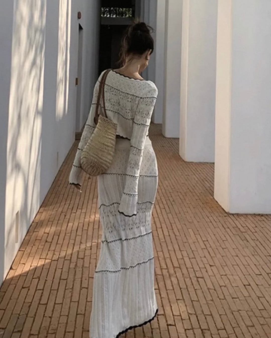 大人の女性にぴったりな、ニットトップスとスカートのセットアップ。シンプルでありながらもセンスを感じさせるデザインは、デイリーユースにも特別なシーンにも使える万能アイテムです。