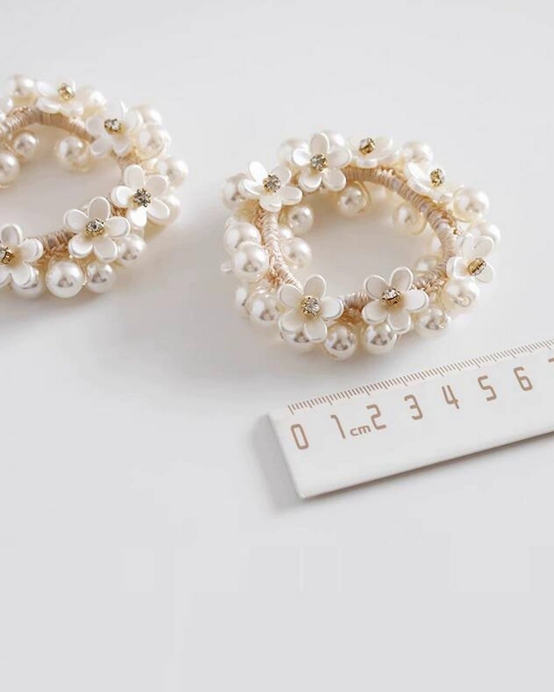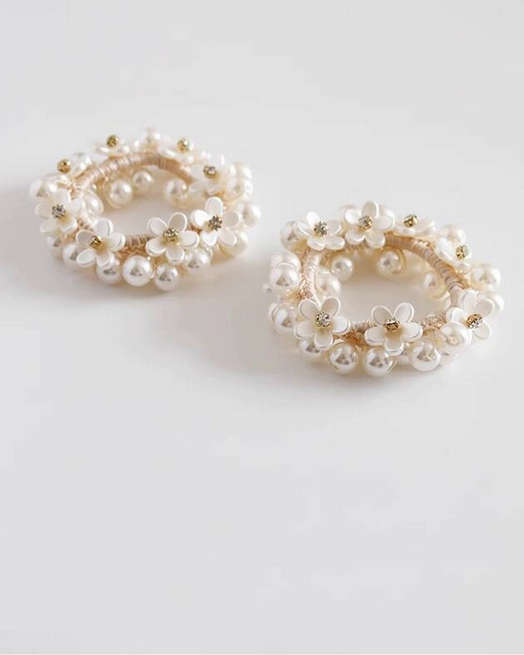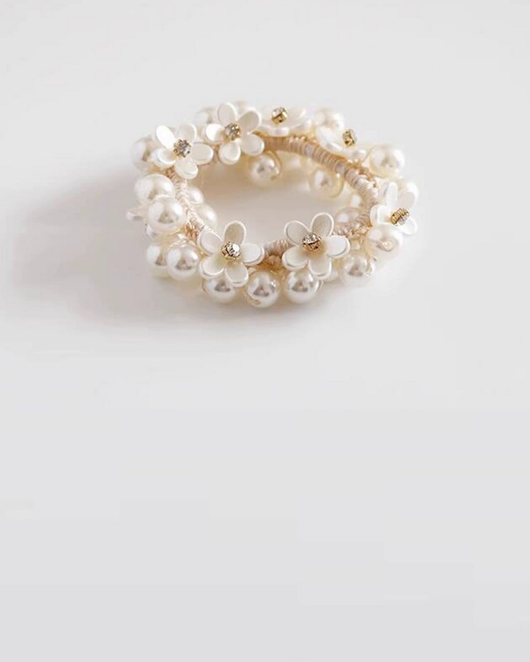 フェイクパールと小花モチーフがたっぷりあしらわれた華やかなシュシュ。きらりと光るストーンが上品さを添え、ひとつ結びにプラスするだけでぐっと華やかな印象に。パーティーや特別な日のコーデにもおすすめです。