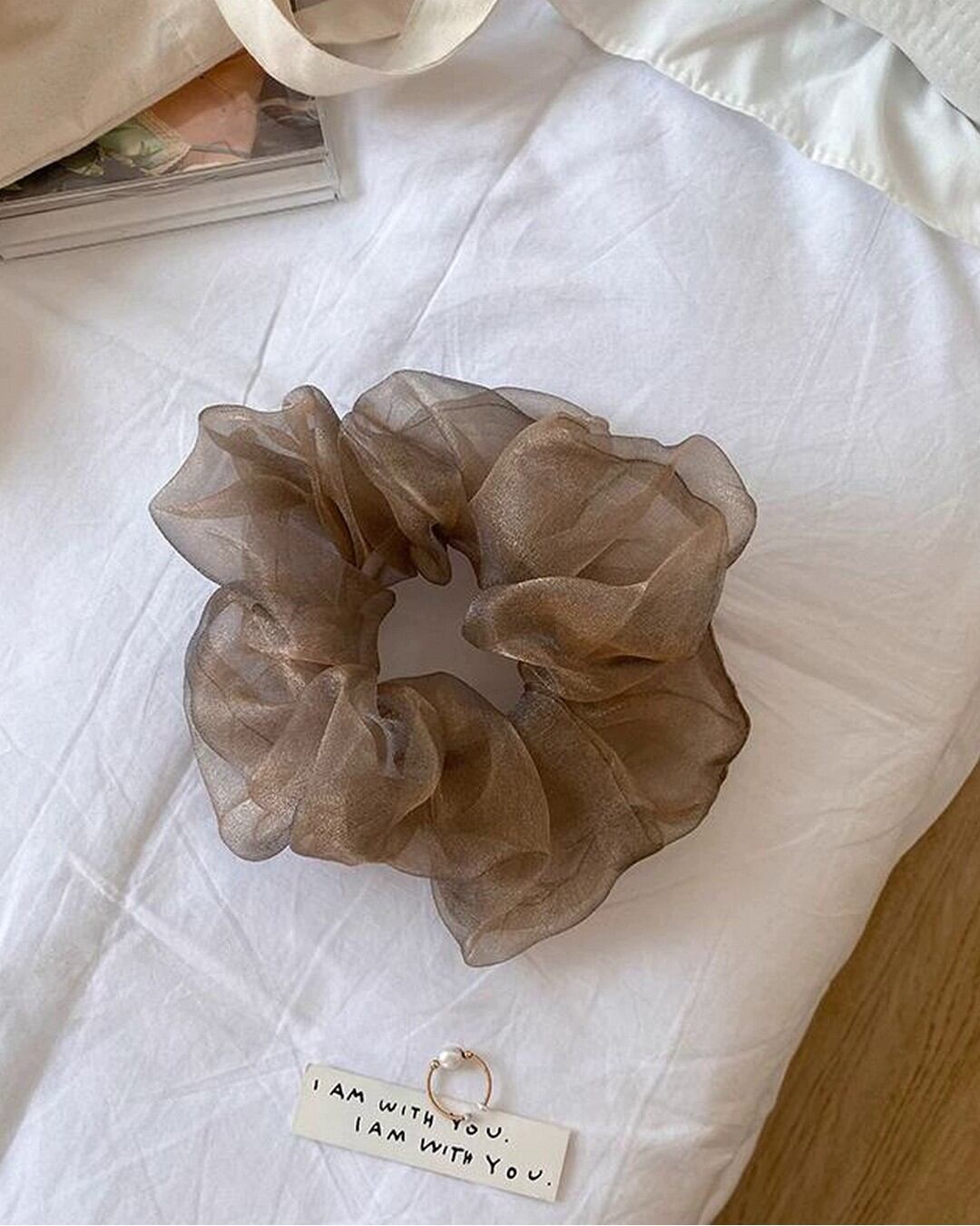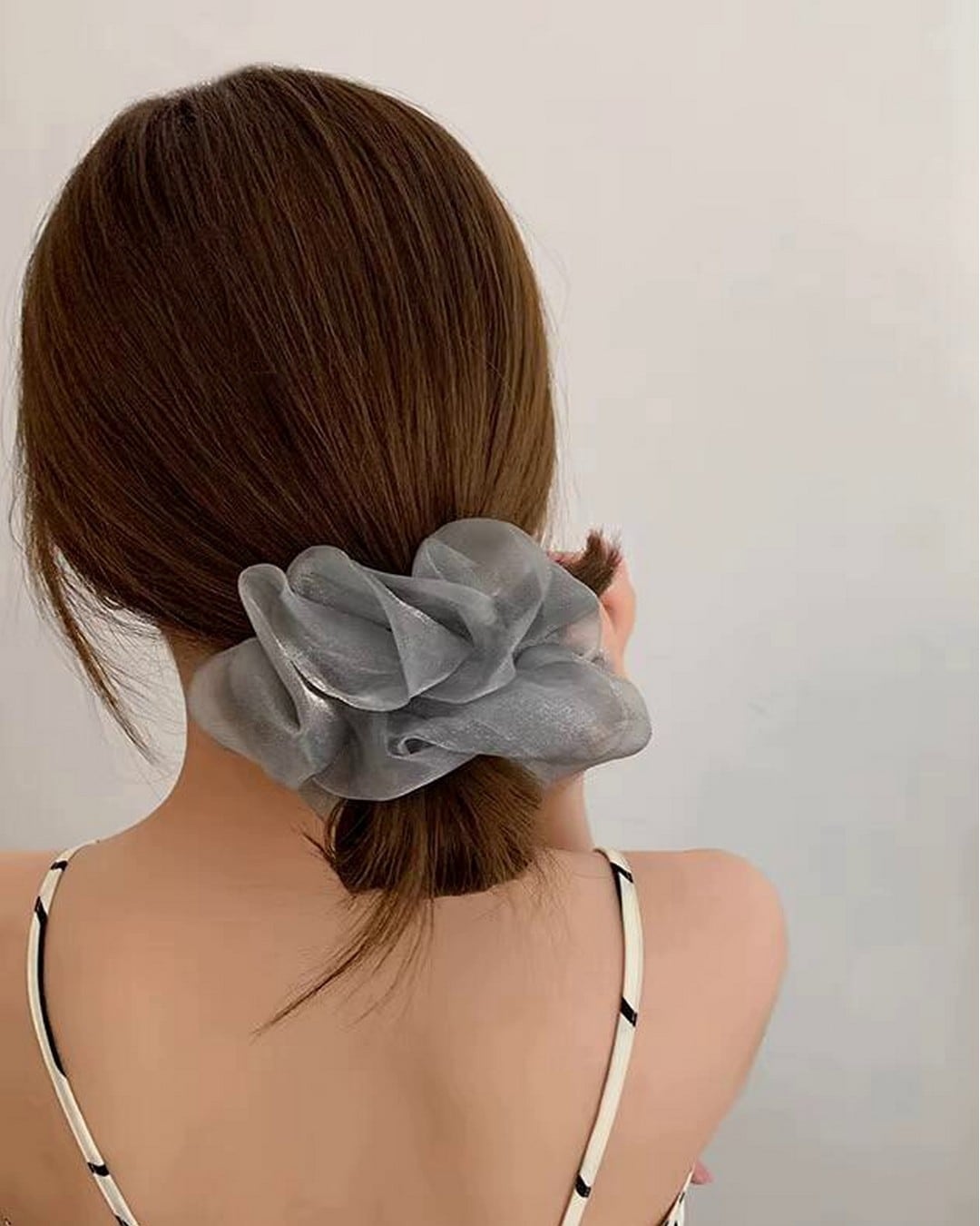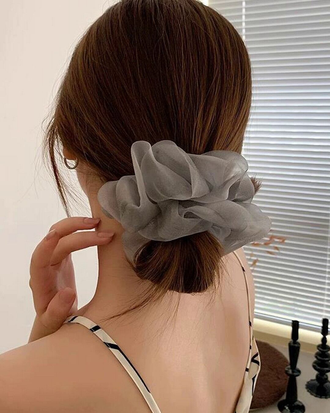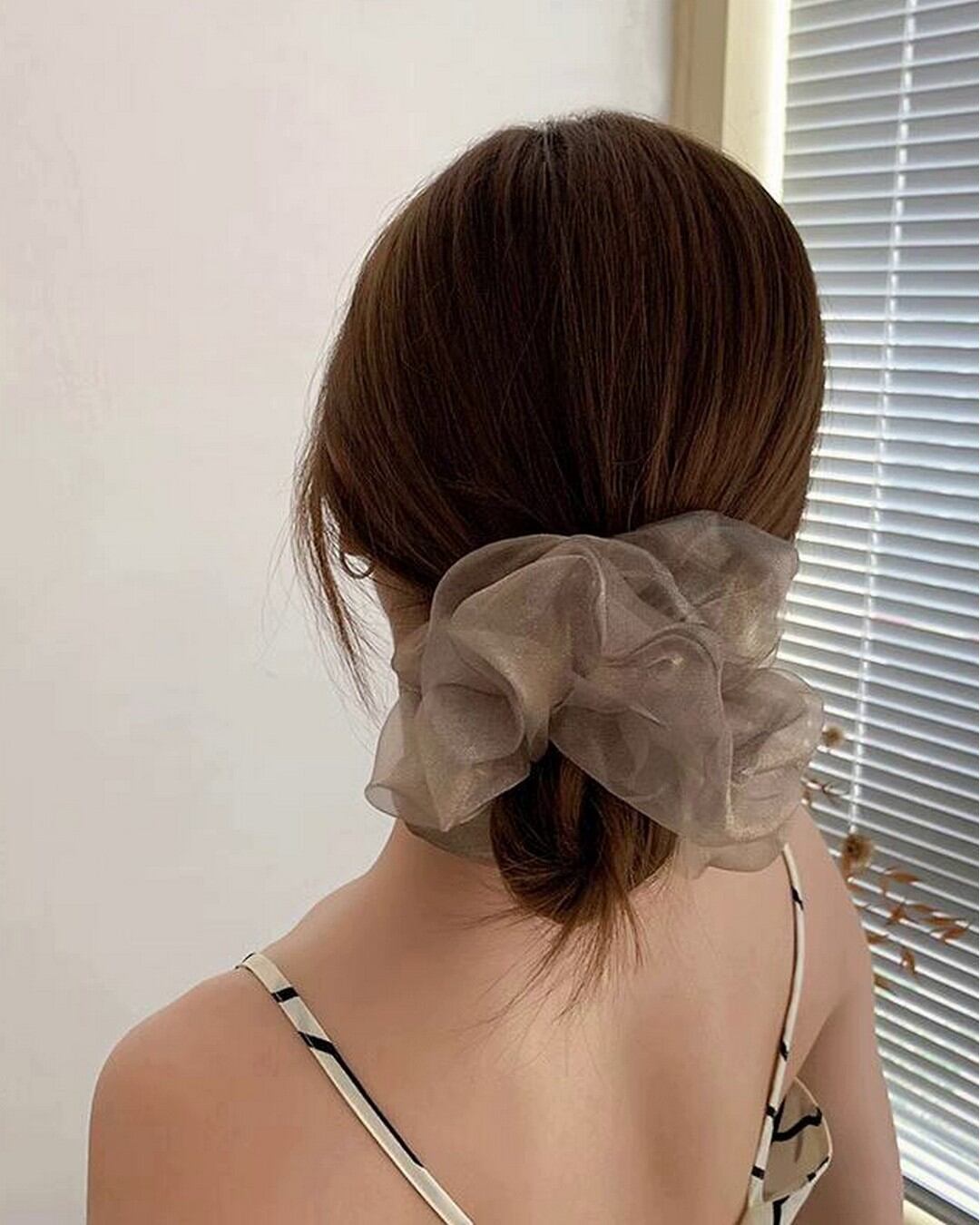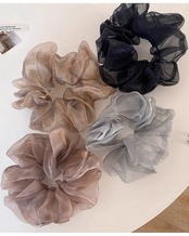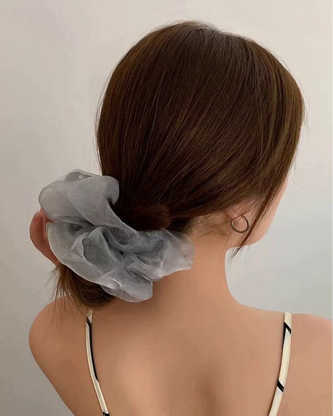 透け感のあるオーガンジー素材がふんわりとした印象を与えるボリュームシュシュ。大きめサイズで存在感があり、まとめ髪のアクセントや手首に着けるアクセ感覚にもぴったり。上品なくすみカラーで大人ガーリーな雰囲気に。