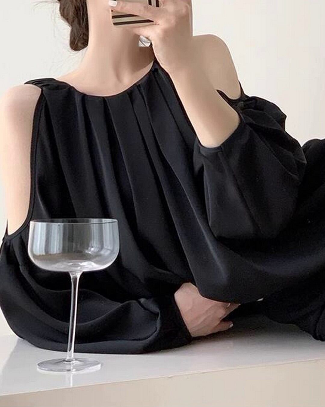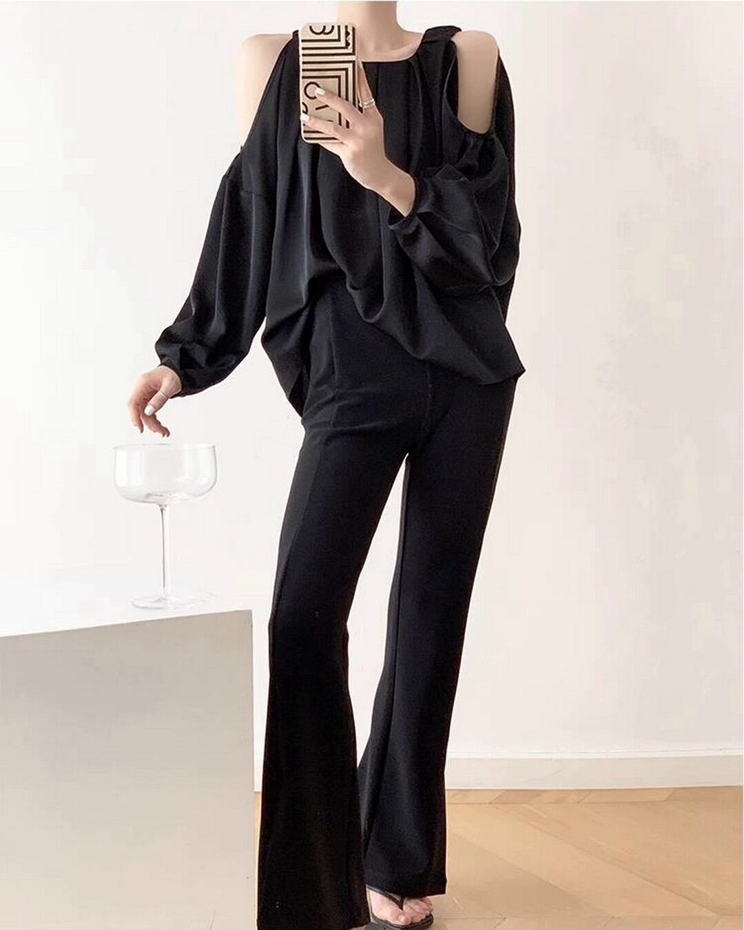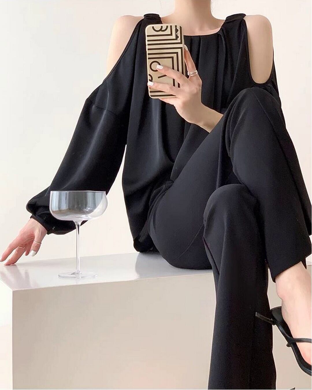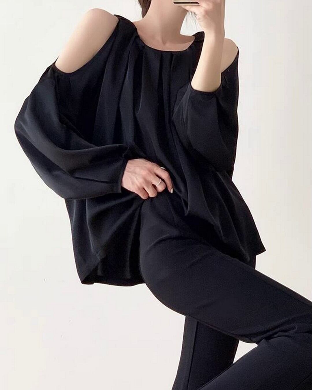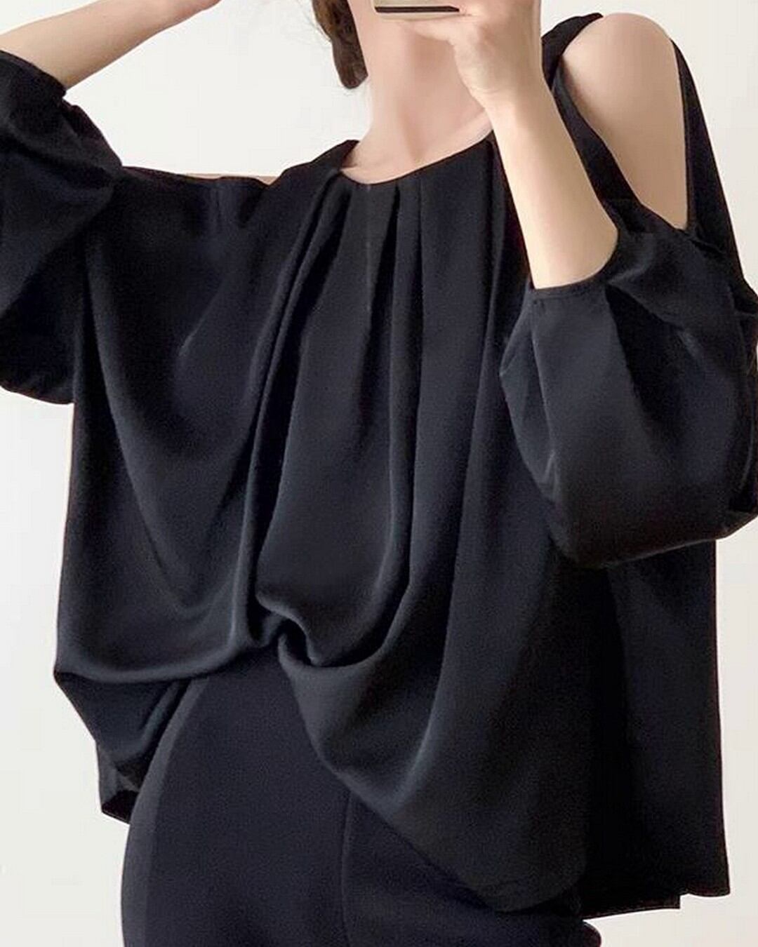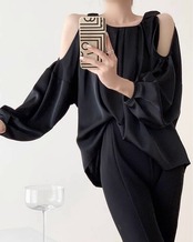肩の大胆なスリットデザインが目を引く、モード感たっぷりのボリュームブラウス。しなやかな落ち感のある素材で、エレガントさと抜け感を同時に演出します。ゆるやかなシルエットとドロップショルダーがこなれ感を生み、パンツスタイルと相性抜群◎デイリーにもディナーにも使える、洗練された大人のための一枚です♡