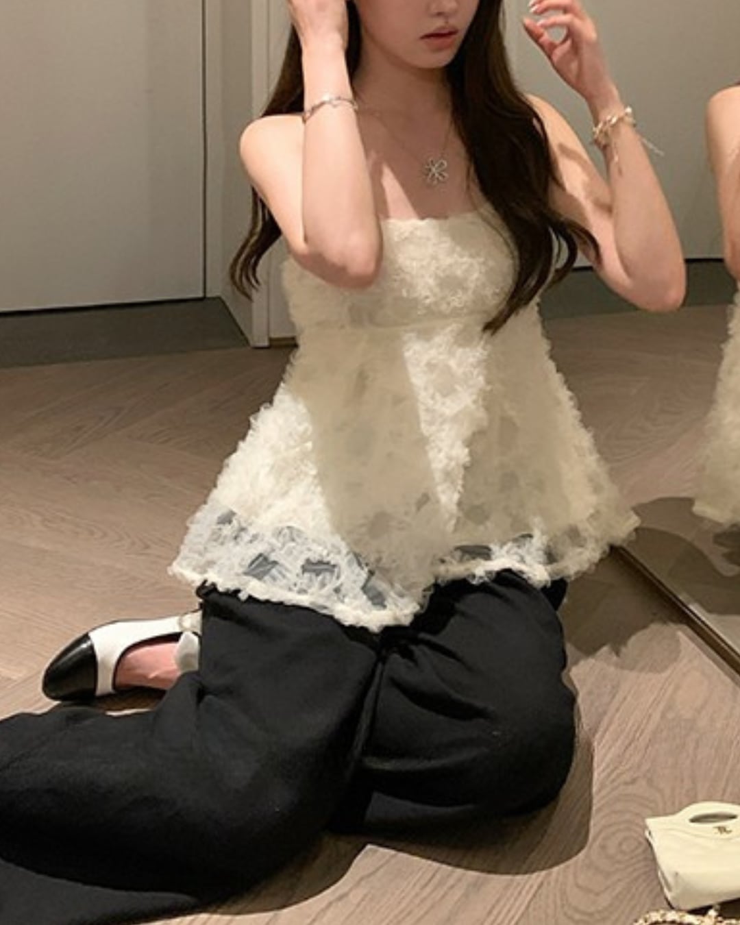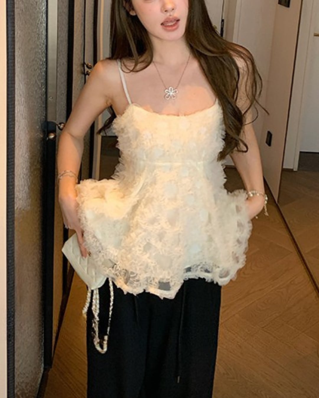 #チュールトップス #キャミソール #フレアシルエット #立体フラワー #ガーリーコーデ #大人ガーリー