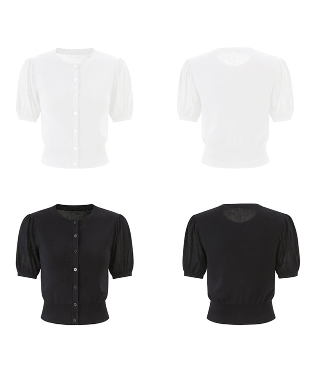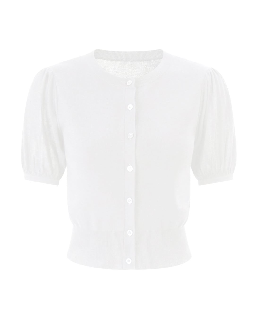 丸みのあるパフスリーブがフェミニンさを演出する、半袖のニットカーディガン。すっきりとしたクルーネックとフロントボタンで、どこかクラシカルなムードも漂う一枚です。ボディには柔らかく光沢感のあるライスール素材を使用し、袖はほんのりシアーな質感で涼しげな印象に。スカートにもパンツにも合わせやすい、シンプルながら存在感のあるアイテムです。