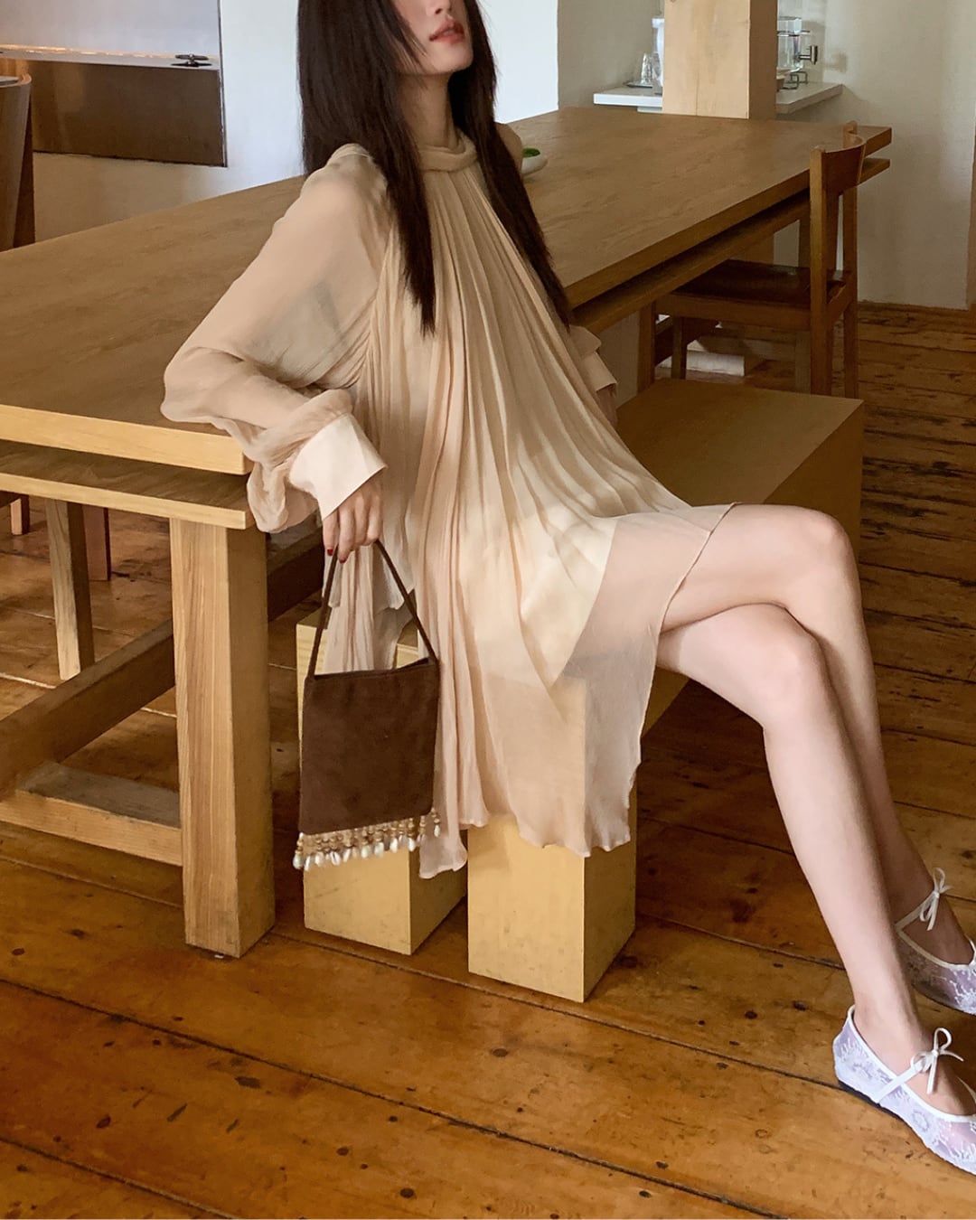 軽やかでエアリーな質感が魅力のプリーツデザインワンピース。落ち感のある立体シルエットが自然と体型をカバーしつつ、華奢な印象を演出。肩のラインに沿ったナチュラルなドロップショルダーと、動きに合わせて揺れる不規則なプリーツが、知的で上品な女性らしさを引き立てます。