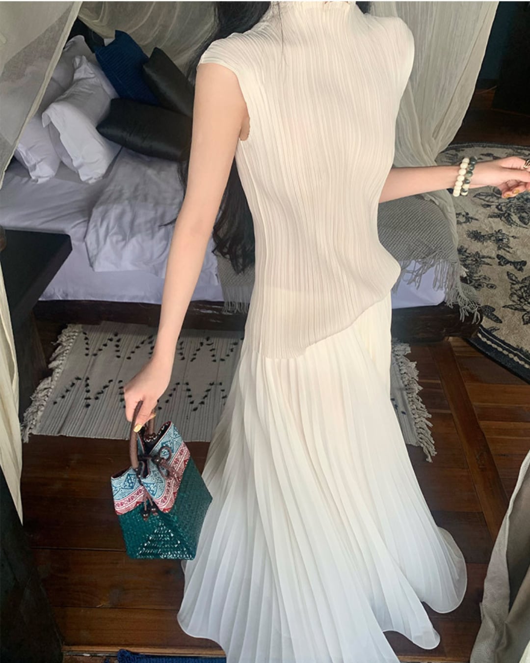 #プリーツスカート #ロングスカート #シアー素材 #アイボリーコーデ #ウエストゴム
