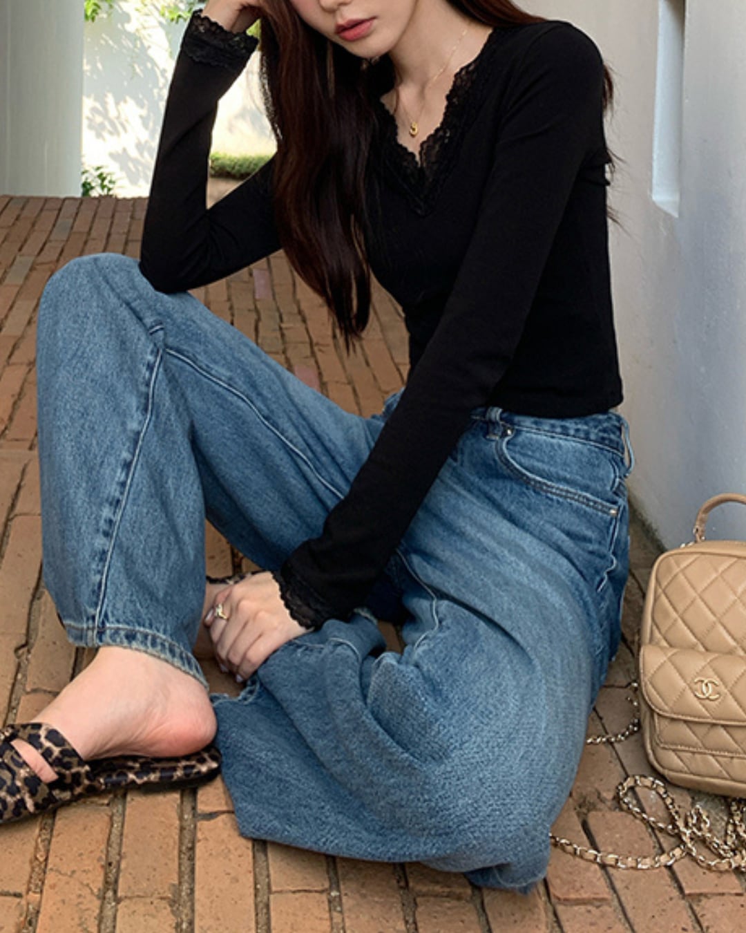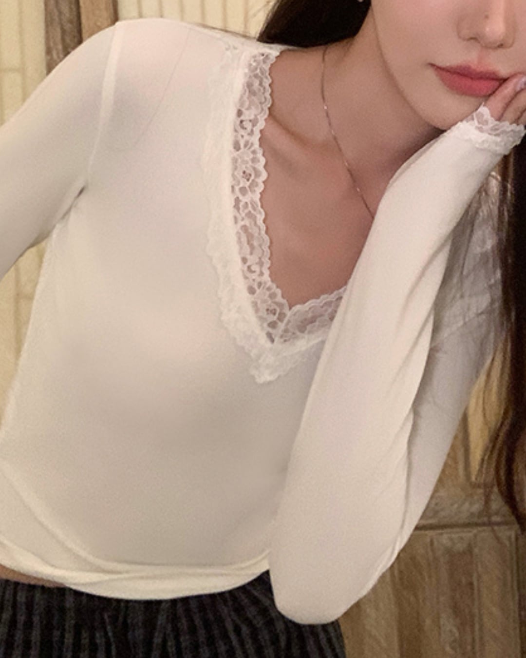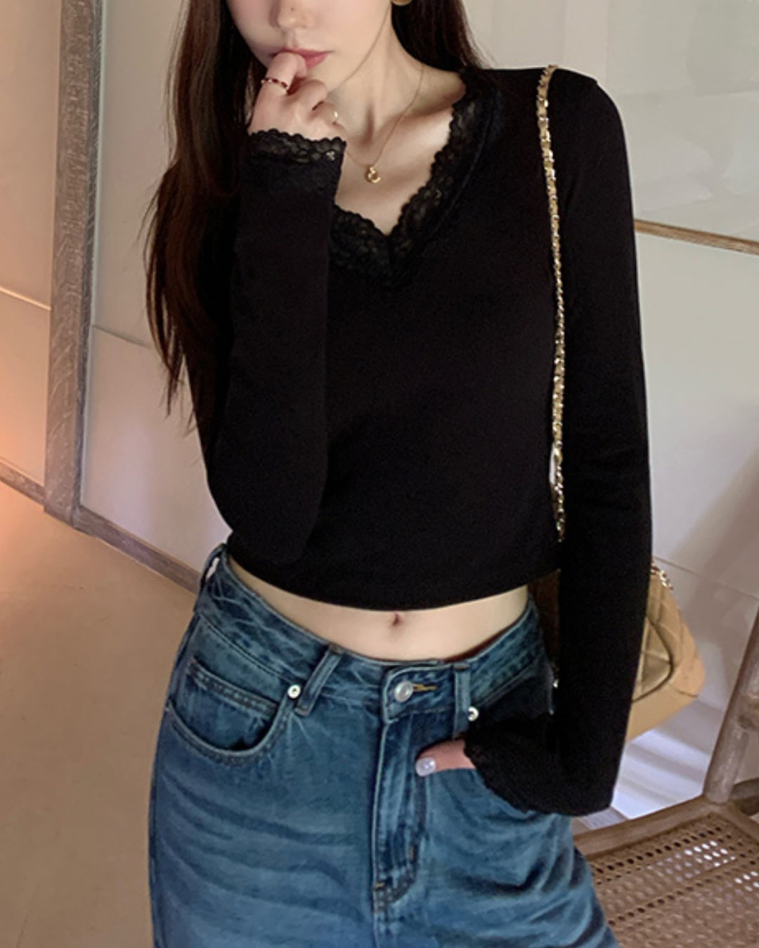 胸元と袖口に繊細なレースをあしらったフェミニンなVネックカットソー。程よく体にフィットするリブ素材で、1枚でもインナーとしても着回し力抜群のアイテムです。デコルテを綺麗に見せてくれるVネックと、さりげないレースが大人可愛さを演出。カジュアルなデニムとも相性が良く、デイリー使いからお出かけコーデまで幅広く活躍します。ブラックとアイボリーの2色展開で、どちらも持っておきたくなる万能トップスです。