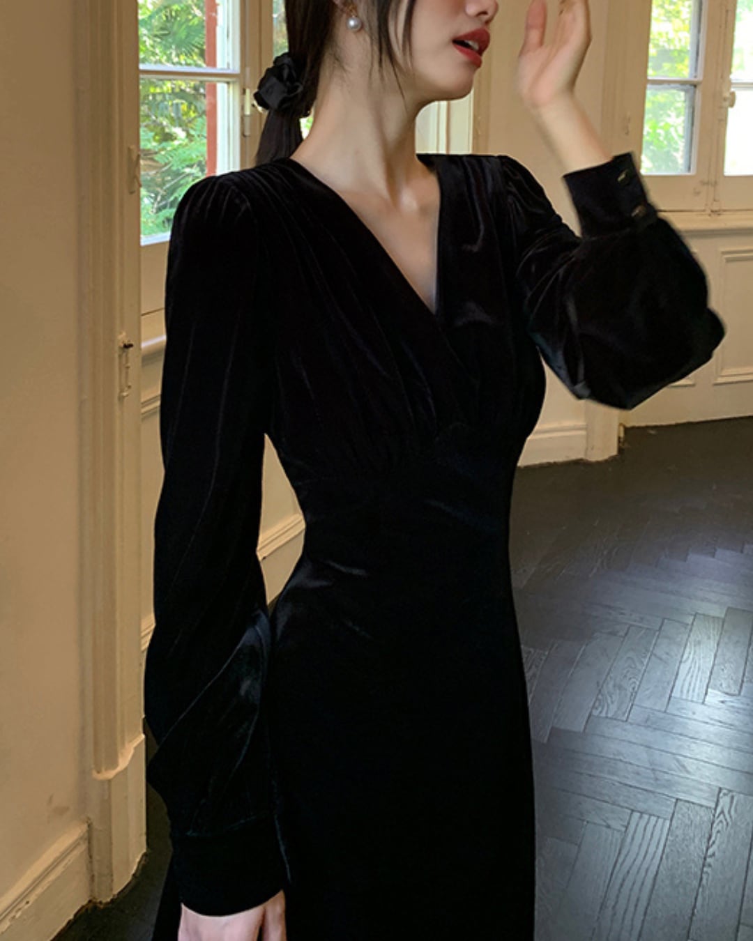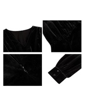 柔らかな光沢感が上品な印象を与えるベロア素材のロングワンピース。胸元は美しいドレープが入ったVネックデザインで、デコルテを綺麗に見せてくれます。ウエストの切り替えラインがスタイルアップを叶え、長めの丈感が大人っぽさを演出。袖口にはさりげないボタンをあしらい、クラシカルなムードをプラス。デートやお食事会など、ちょっとした特別な日に着たい1着です。