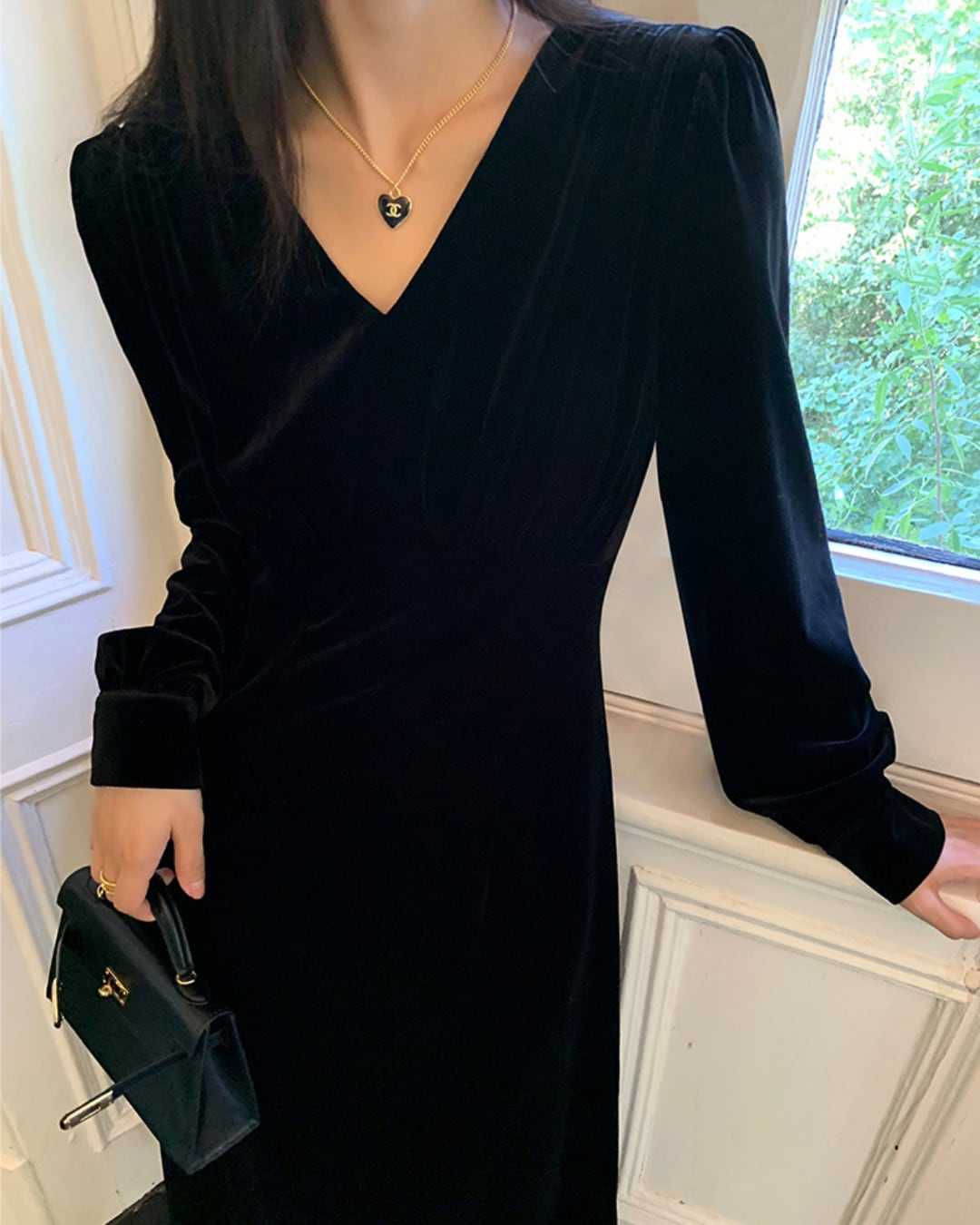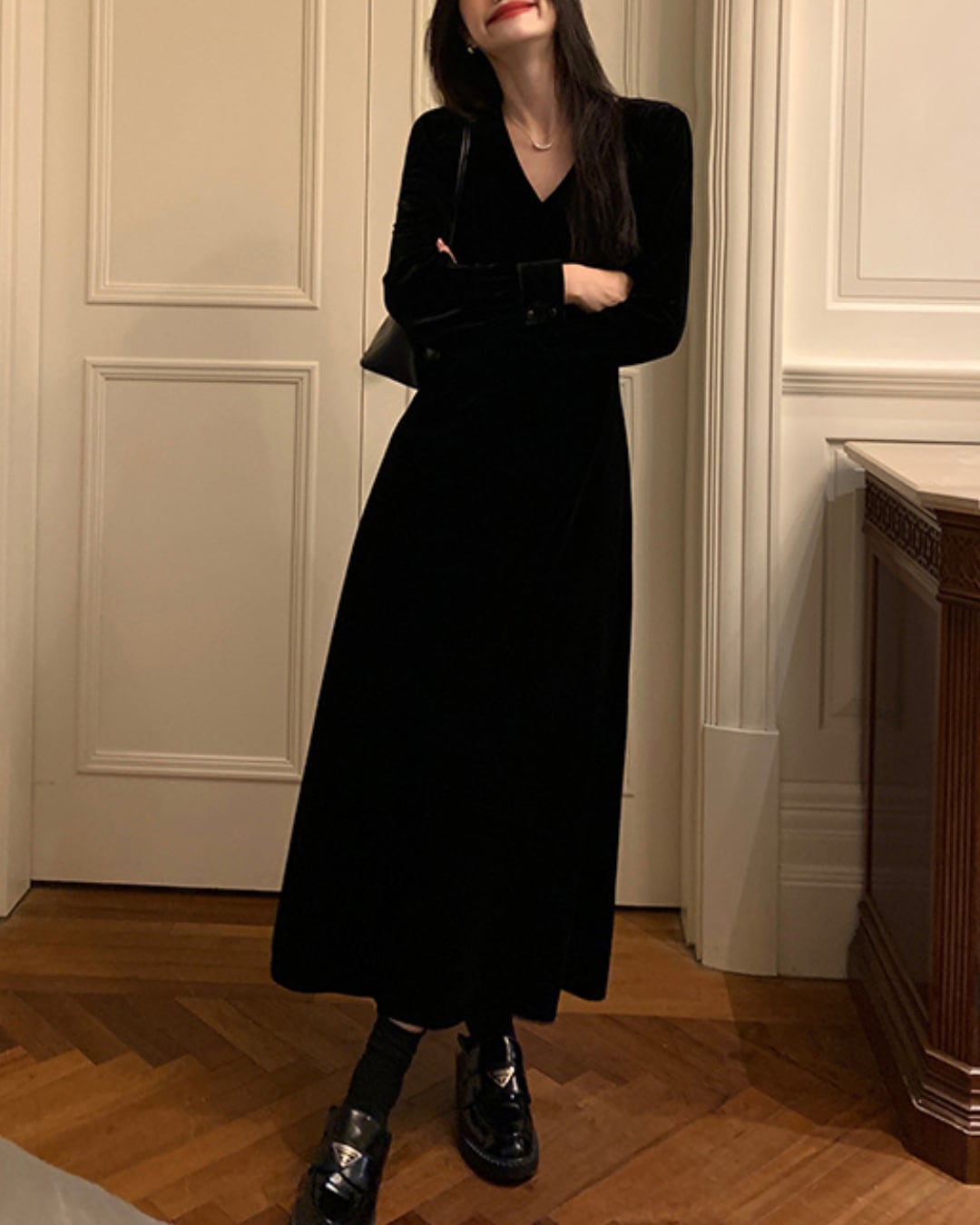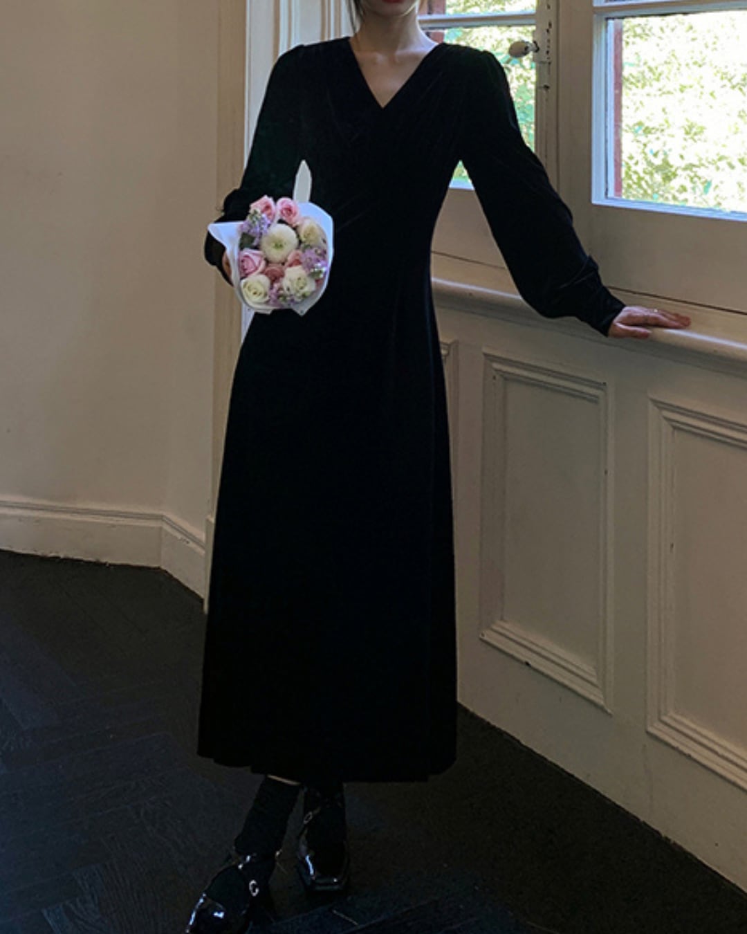 #ベロアワンピース #Vネック #上品コーデ #スタイルアップ #大人ガーリー #クラシカルムード #ロングワンピース