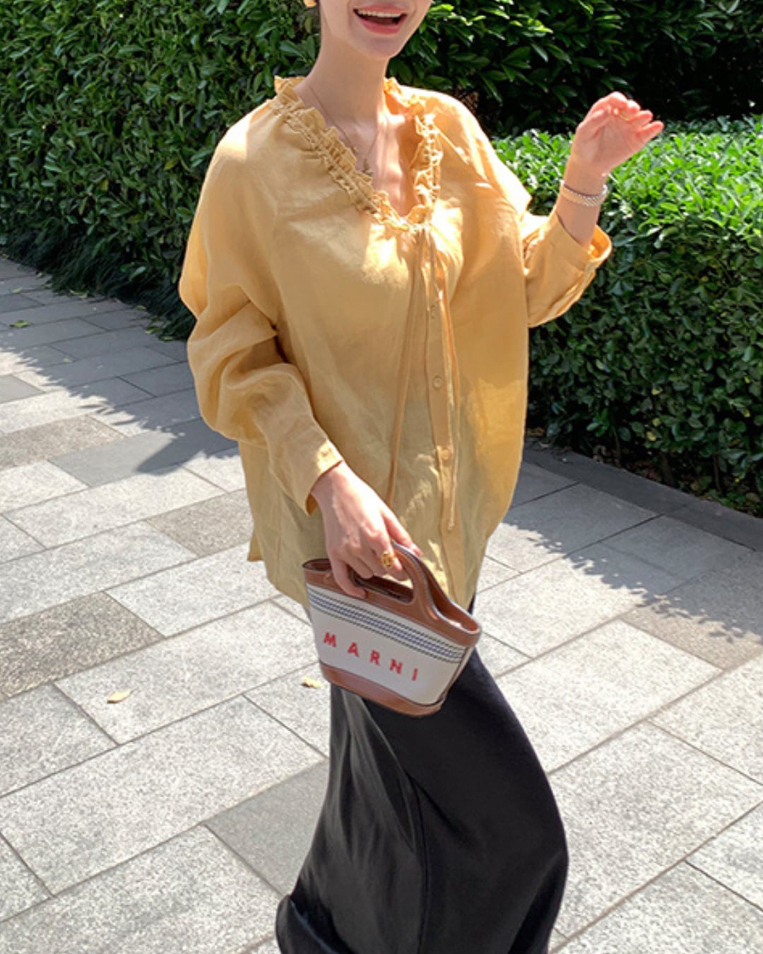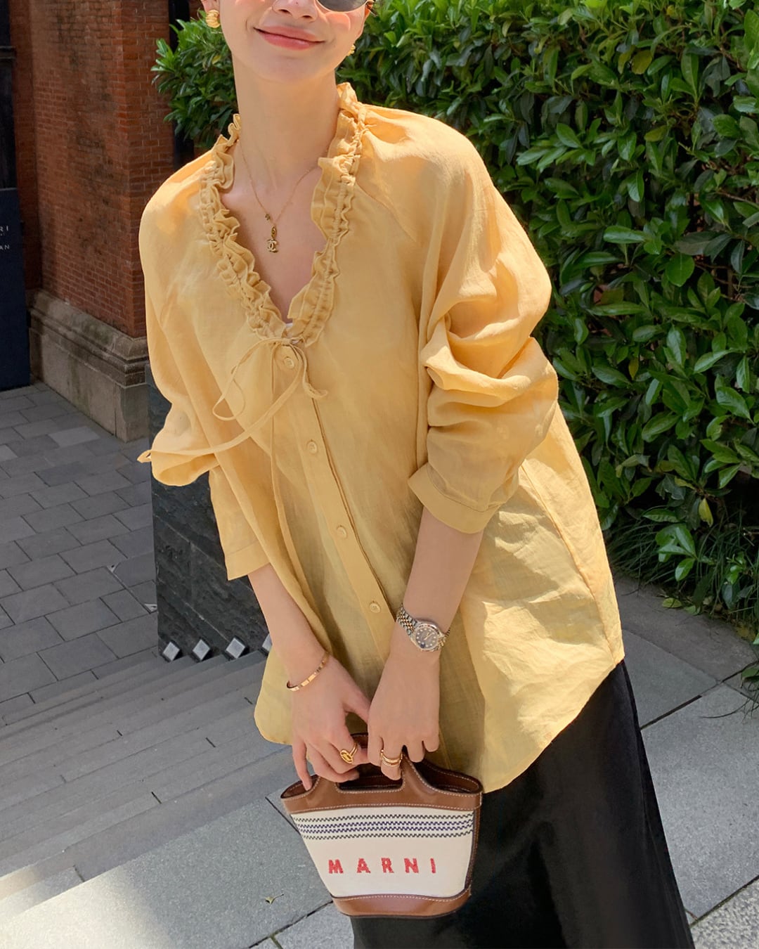 ナチュラルな風合いが魅力の100%リネン素材ブラウス。ネックラインには華奢なフリルを施し、女性らしい可憐な印象に仕上げました。胸元のリボンがアクセントになり、前開きデザインで羽織りとしても着回せる万能アイテム。さらっと快適な着心地で、パンツにもスカートにも相性抜群です。