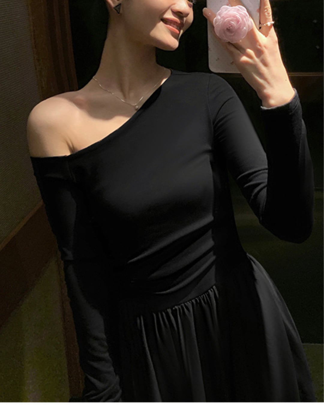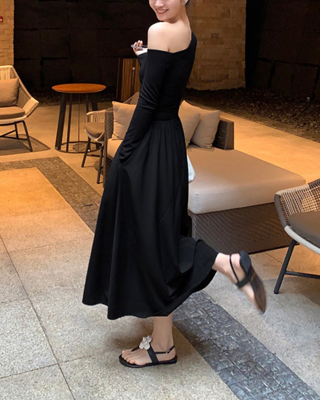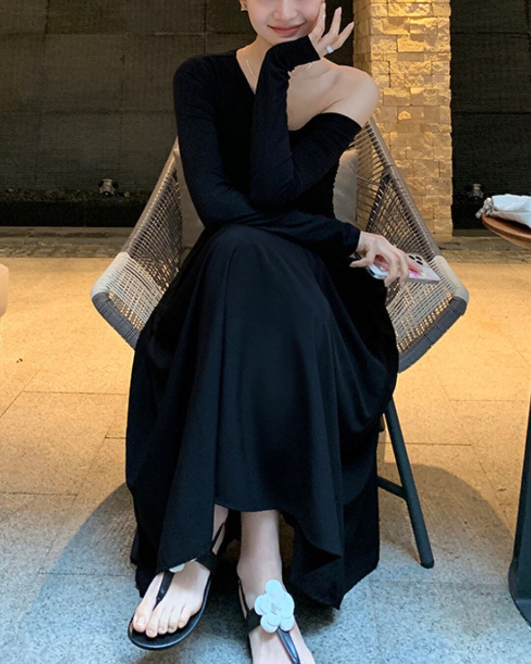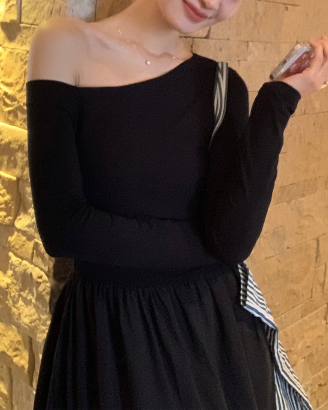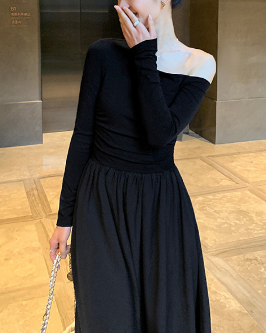 #アシンメトリー #オフショルダー #ブラックワンピース #大人ガーリー #フェミニンコーデ #ウエストゴム #フレアスカート #ポケット付き