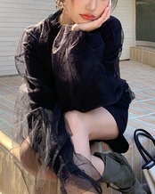 #シアースリーブ #レイヤード風トップス #ブラックコーデ #フェミニンカジュアル #大人ガーリー #丸首トップス #体型カバー #ゆったりシルエット
