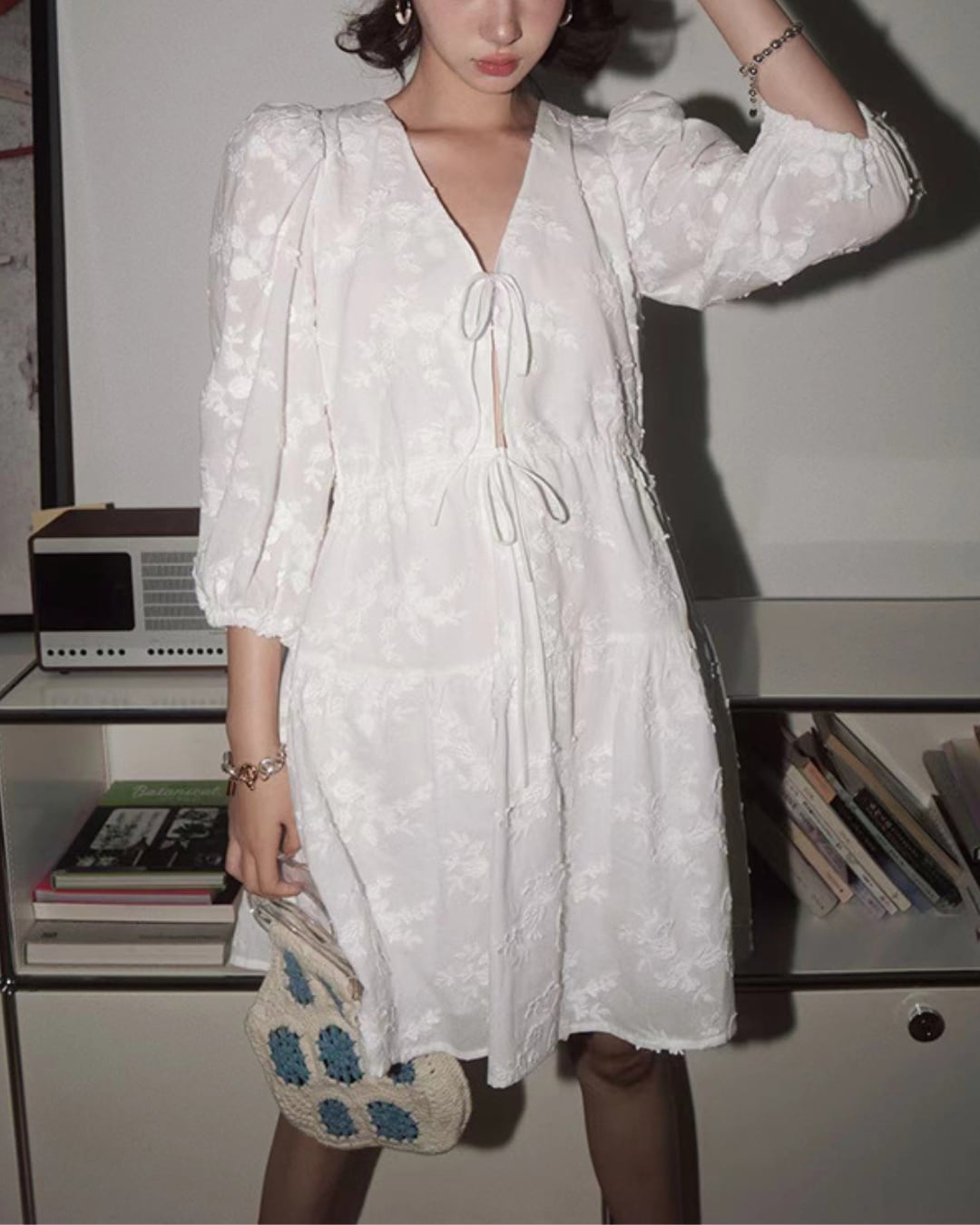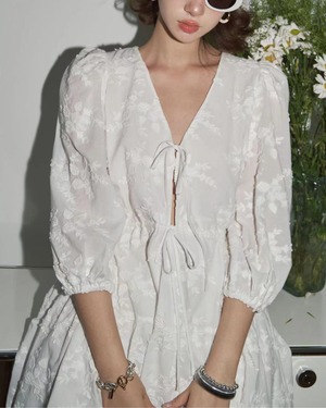 #ホワイトワンピース #刺繍ワンピ #綿100ワンピース #フロントリボン #ガーリーコーデ #ナチュラルフェミニン #大人可愛い