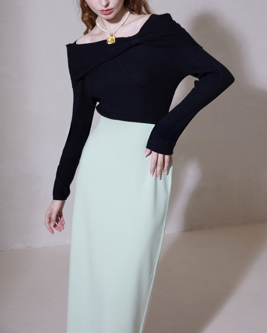 #リボントップス #オフショルダー #大人ガーリー #春秋コーデ #ニットコーデ #着回し力抜群