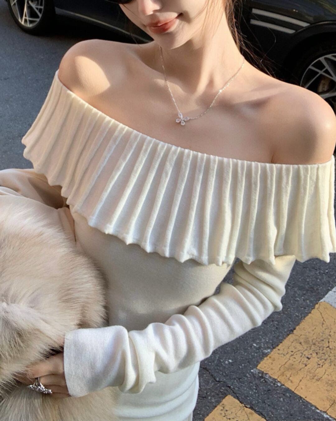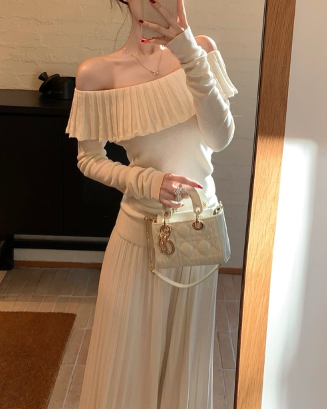 #オフショル #プリーツ #ホワイトコーデ #デートコーデ #大人ガーリー #リブニット #韓国ファッション