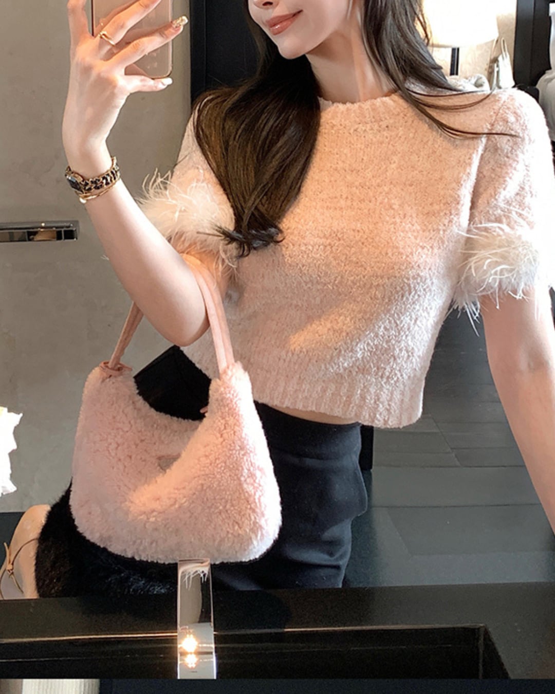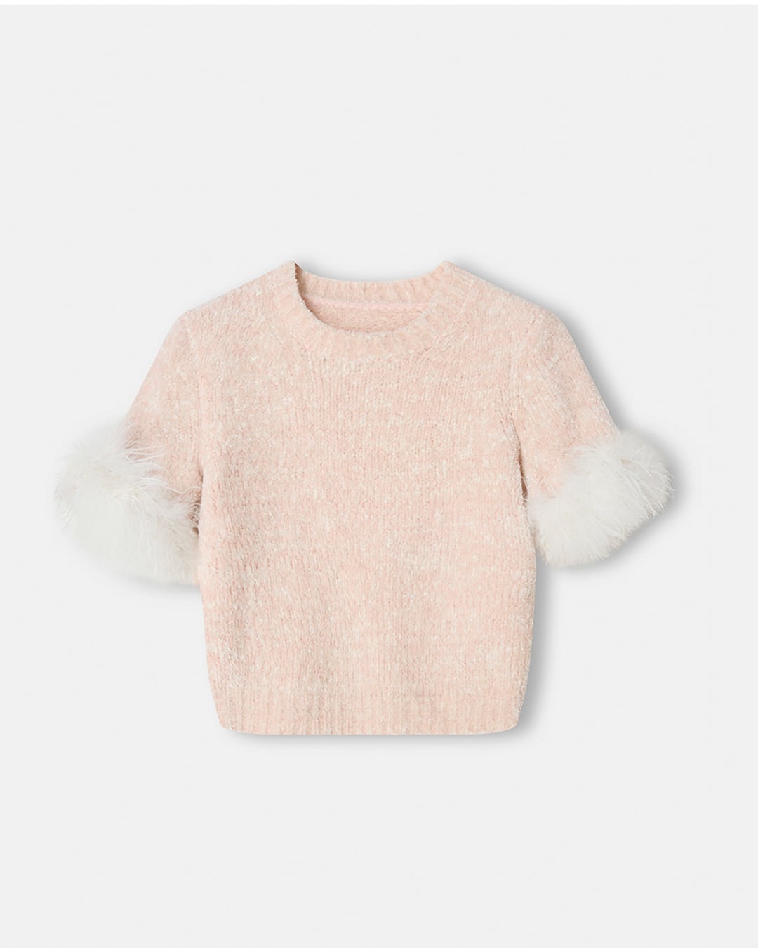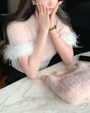 ふわふわの質感が女の子らしさを引き立てるニットトップス。袖口には繊細なオーストリッチフェザーが施され、動くたびに揺れる華やかなアクセントに。ショート丈のバランスがスタイルアップ効果抜群で、ミニスカートとの相性も◎。甘めフェミニンな印象ながら、大人っぽく着こなせる一枚です。