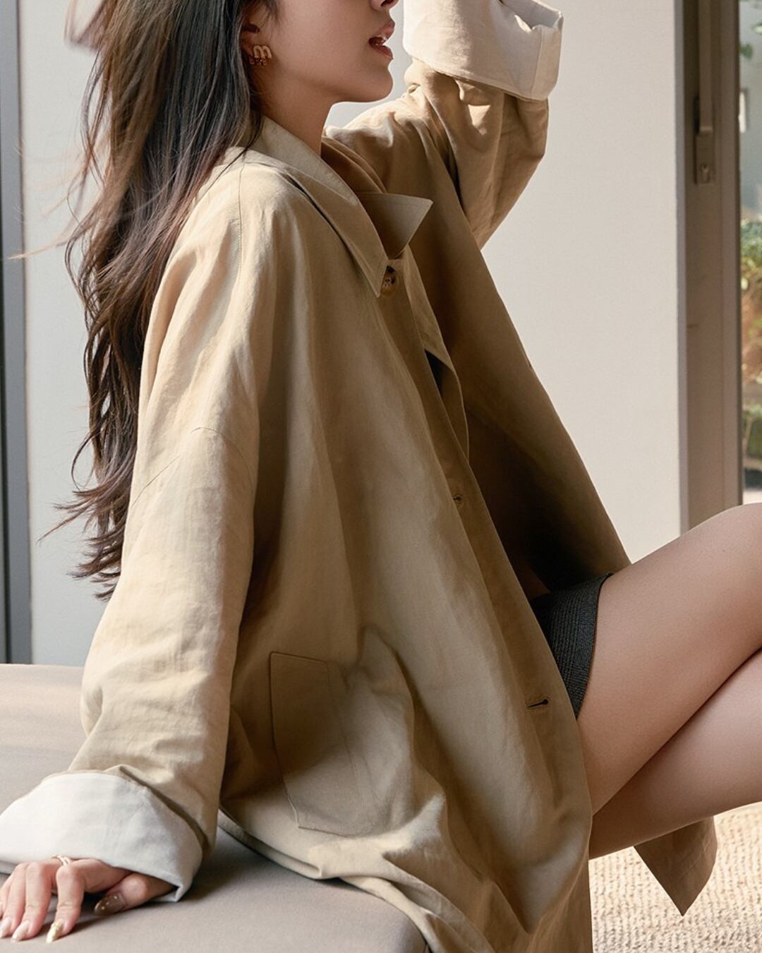 軽やかなリネン混素材で仕立てたオーバーサイズシルエットのステンカラーコート。体を包み込むようなゆったり感と、さらりと羽織れる軽さが魅力です。裏地は肌に優しいコットン100%で、着るほどに柔らかく馴染むのもポイント。シンプルなデザインながらも自然なドロップショルダーと程よいハリ感がこなれ感を演出。ワンピースやスカートにはもちろん、デニムやショートパンツとも相性抜群な大人ガーリーアウターです。