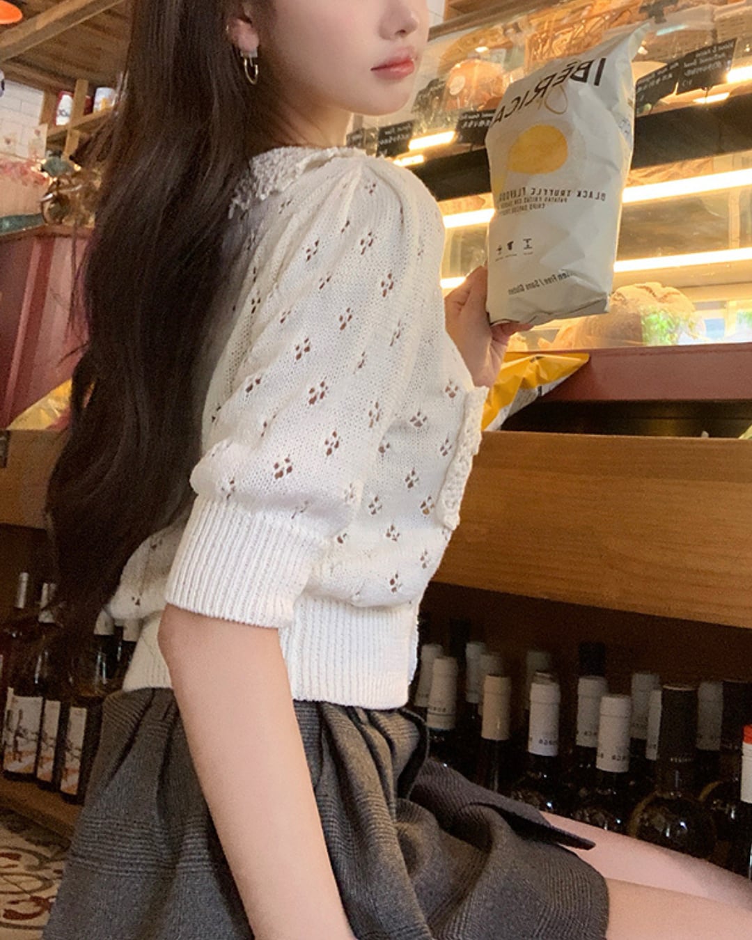 #レースカーディガン #透かし編みニット #リネン混ニット #大人ガーリー #半袖カーディガン #フェミニンコーデ