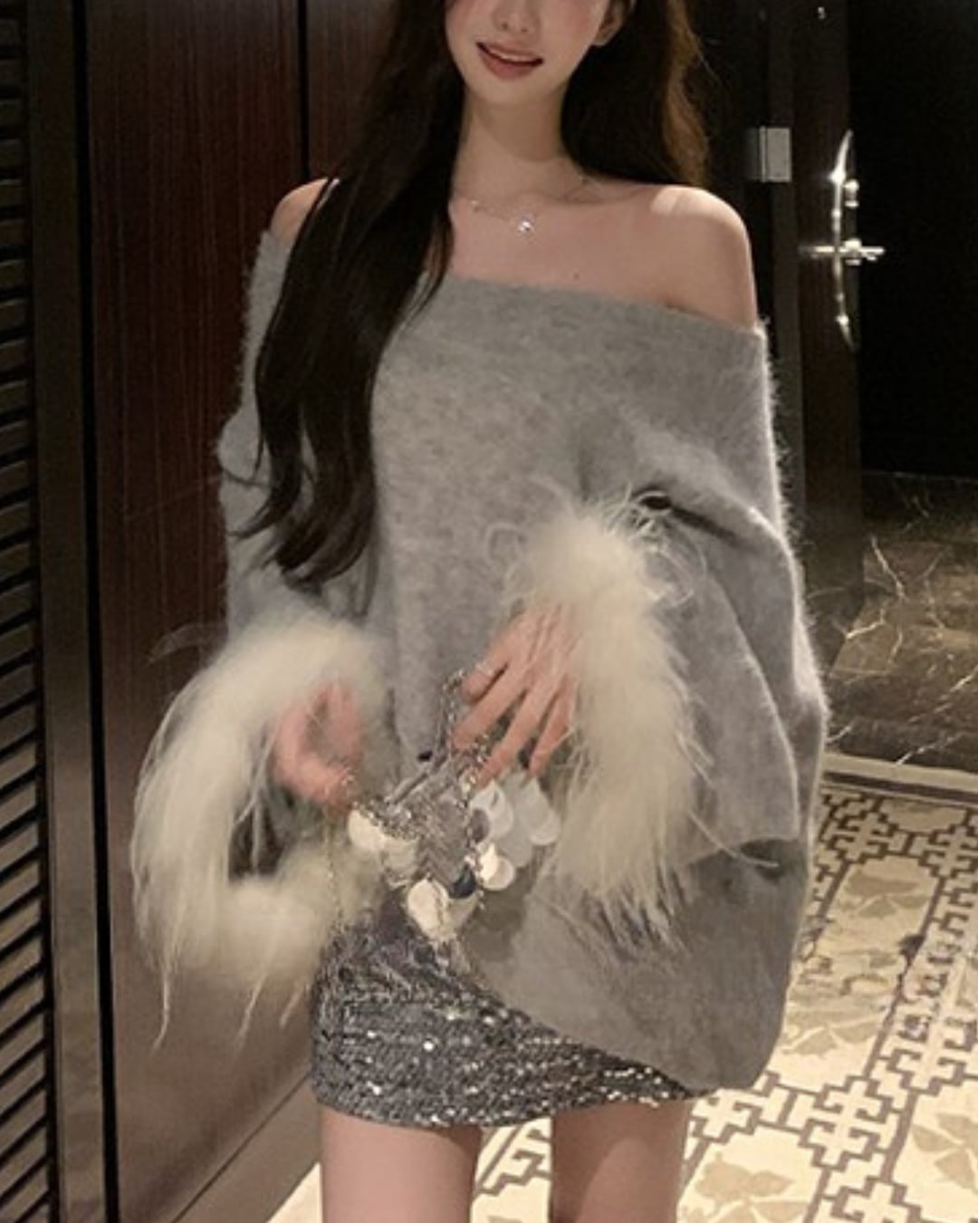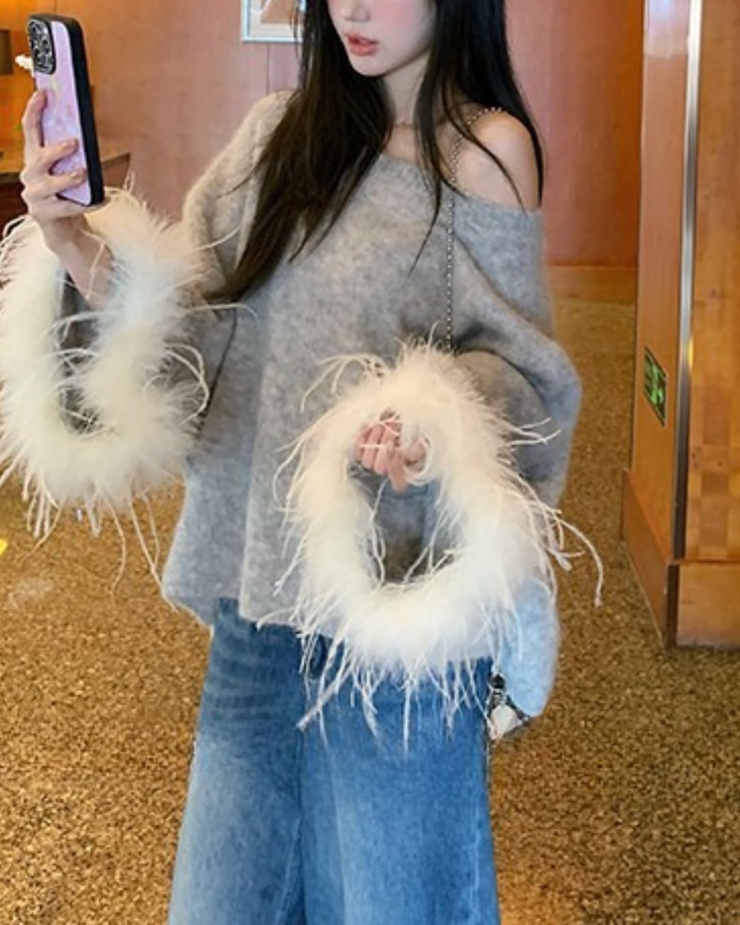 ラグジュアリー感漂うフェザースリーブが目を引く、ゆったりシルエットのオフショルニット。抜け感のある肩見せデザインで、リラックスしつつも大人の色気を感じさせる一枚に仕上がっています。ボトムスにミニスカートやスキニーデニムを合わせるだけで洗練されたスタイリングが完成。