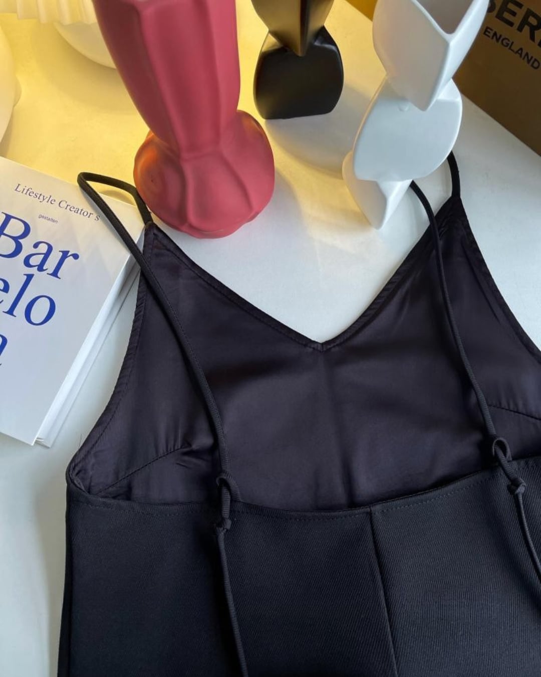 シンプルながらも洗練された印象を与える、Vネックデザインのブラックキャミワンピース。程よく身体のラインを拾う美しいシルエットと落ち感のある素材で、上品さと抜け感を両立。インナー次第でロングシーズン活躍できるのも嬉しいポイント。