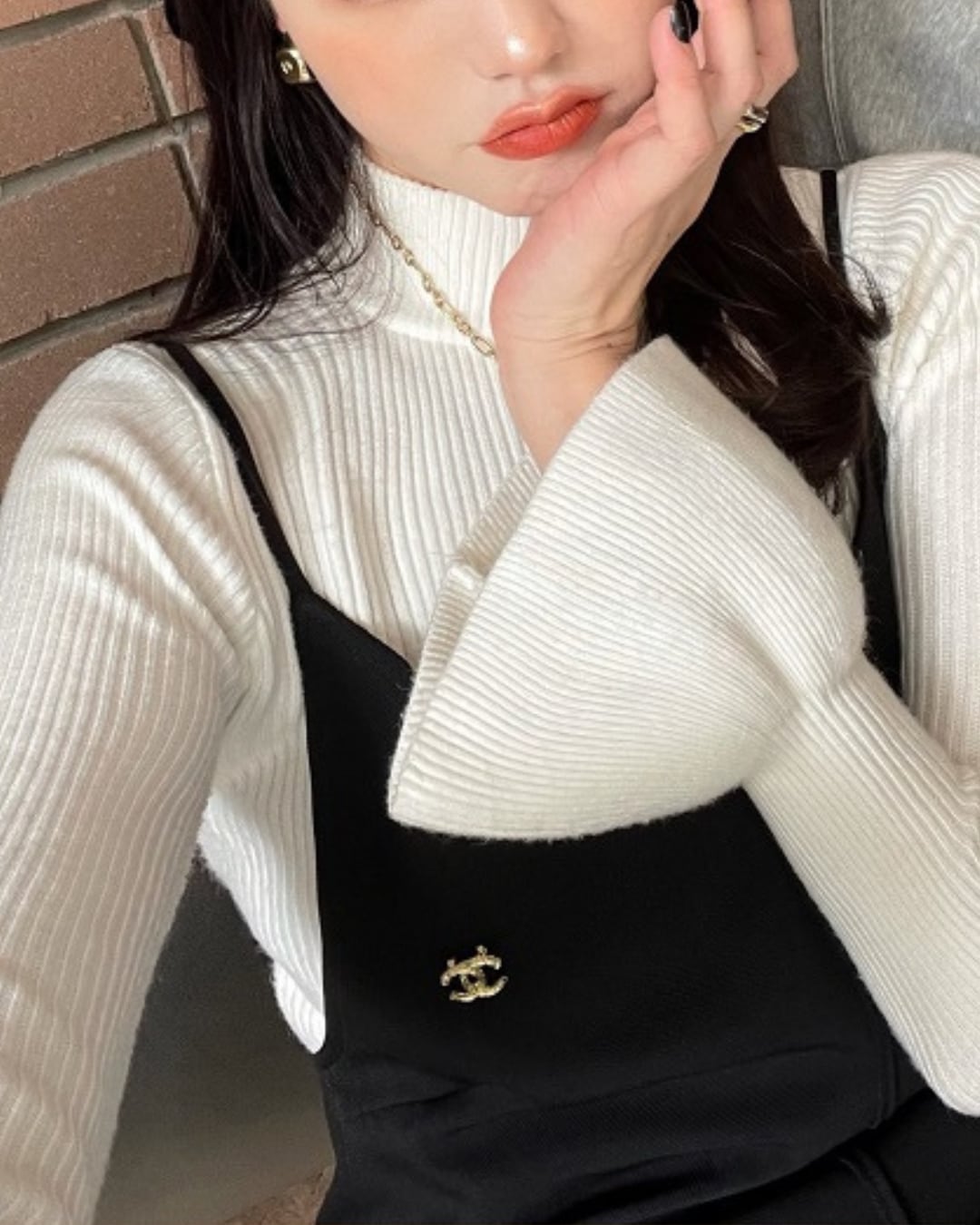 繊細なリブ編みが女性らしさを引き立てるニットトップス。程よくフィットするシルエットに、袖口のフレアデザインがフェミニンなアクセントを添えます。ジャンスカやキャミワンピのインナーとしても着回ししやすく、大人ガーリースタイルにぴったりの1枚です。