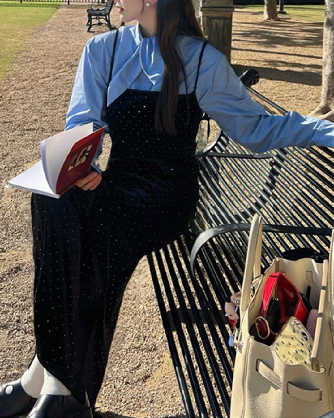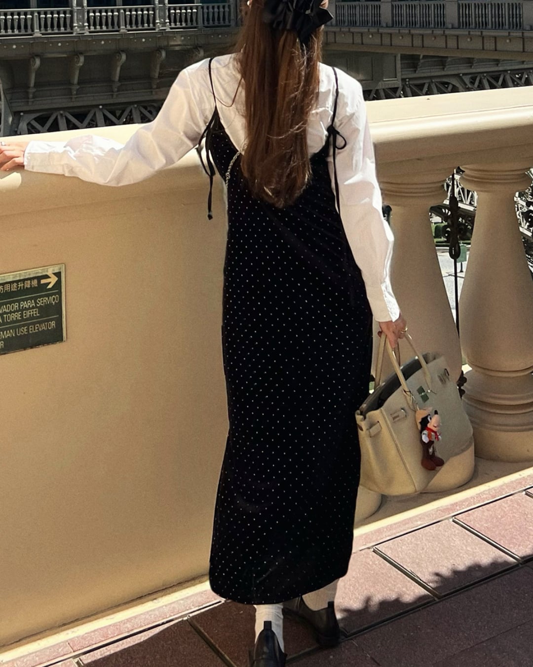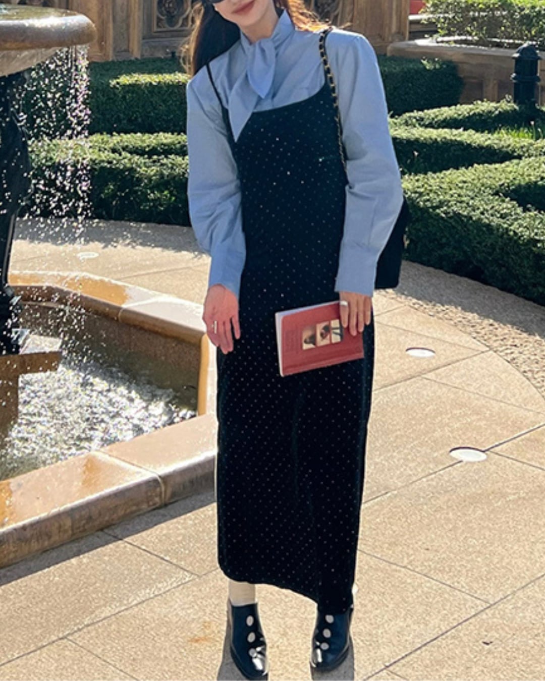 光沢感のあるブラックベルベットに小さなドットを散りばめた、大人ガーリーなロングキャミワンピース。程よいフレアシルエットが体のラインを優しく包み、歩くたびに揺れる裾が女性らしさを引き立てます。ブラウスやリブニットとのレイヤードで、上品なデートコーデや旅行スタイルにもぴったりです。
