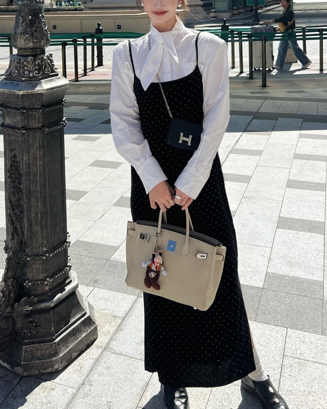 #ドットワンピース #ベルベット #キャミワンピース #レイヤードコーデ #大人ガーリー #ロングワンピース