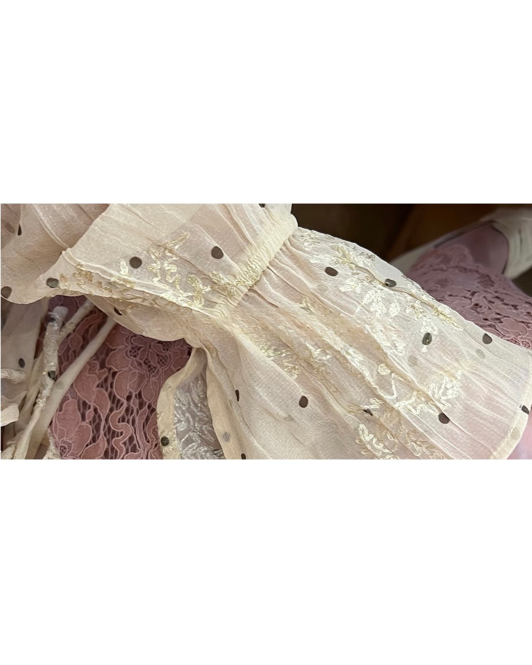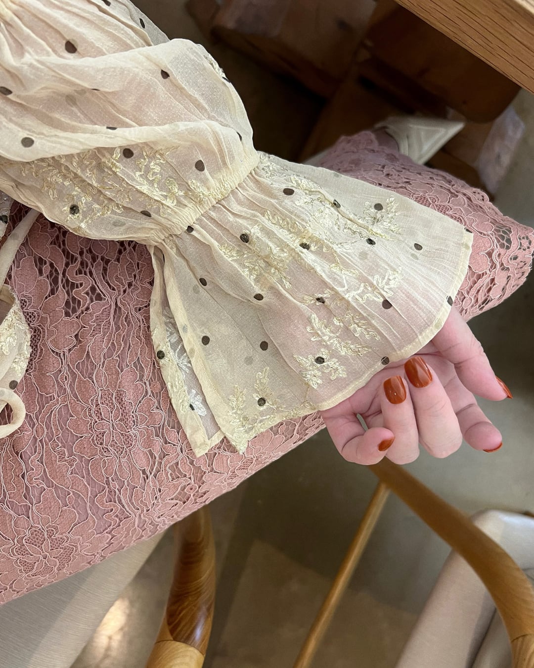 #刺繍レース #ドットチュール #フロントリボン #ウエストマーク #フェミニンブラウス #大人ガーリー #デートコーデ