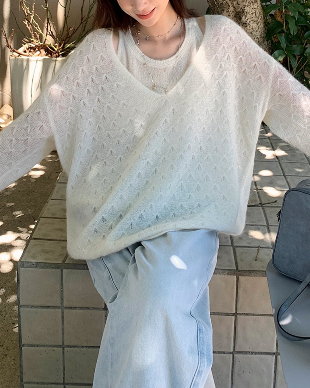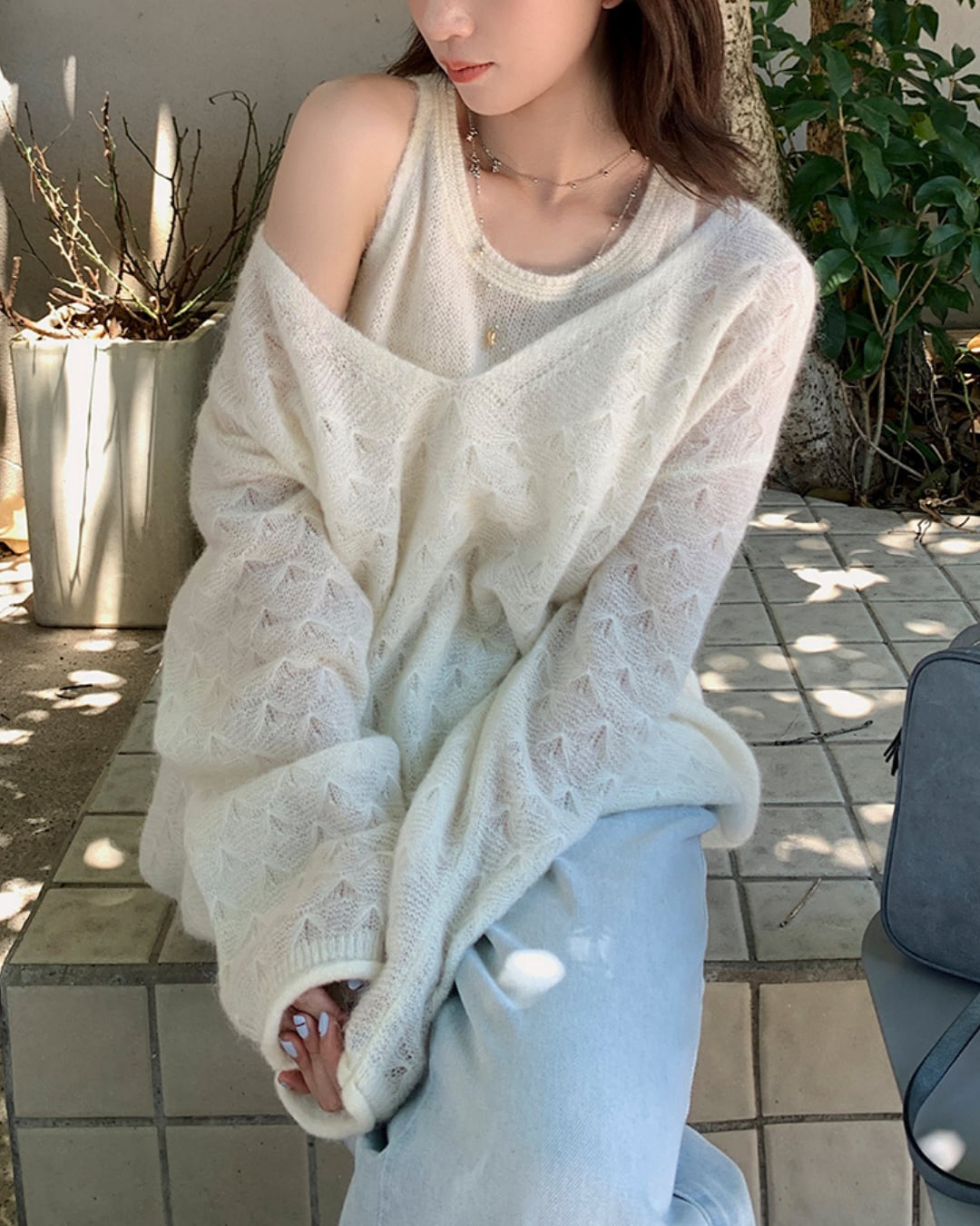 ふわふわとした毛足が可愛い、透かし編みのプルオーバーニットとインナーキャミの2点セット。ゆるやかなVネックとドロップショルダーで抜け感のある大人カジュアルを演出しながら、軽やかなシアー感で抜群の女性らしさをプラス。立体的な編地が表情豊かで、どの角度から見ても柔らかな印象に。インナーはベーシックなラウンドネックのデザインで単品使いも◎カフェコーデからお出かけまで、季節の変わり目にぴったりな一枚です。