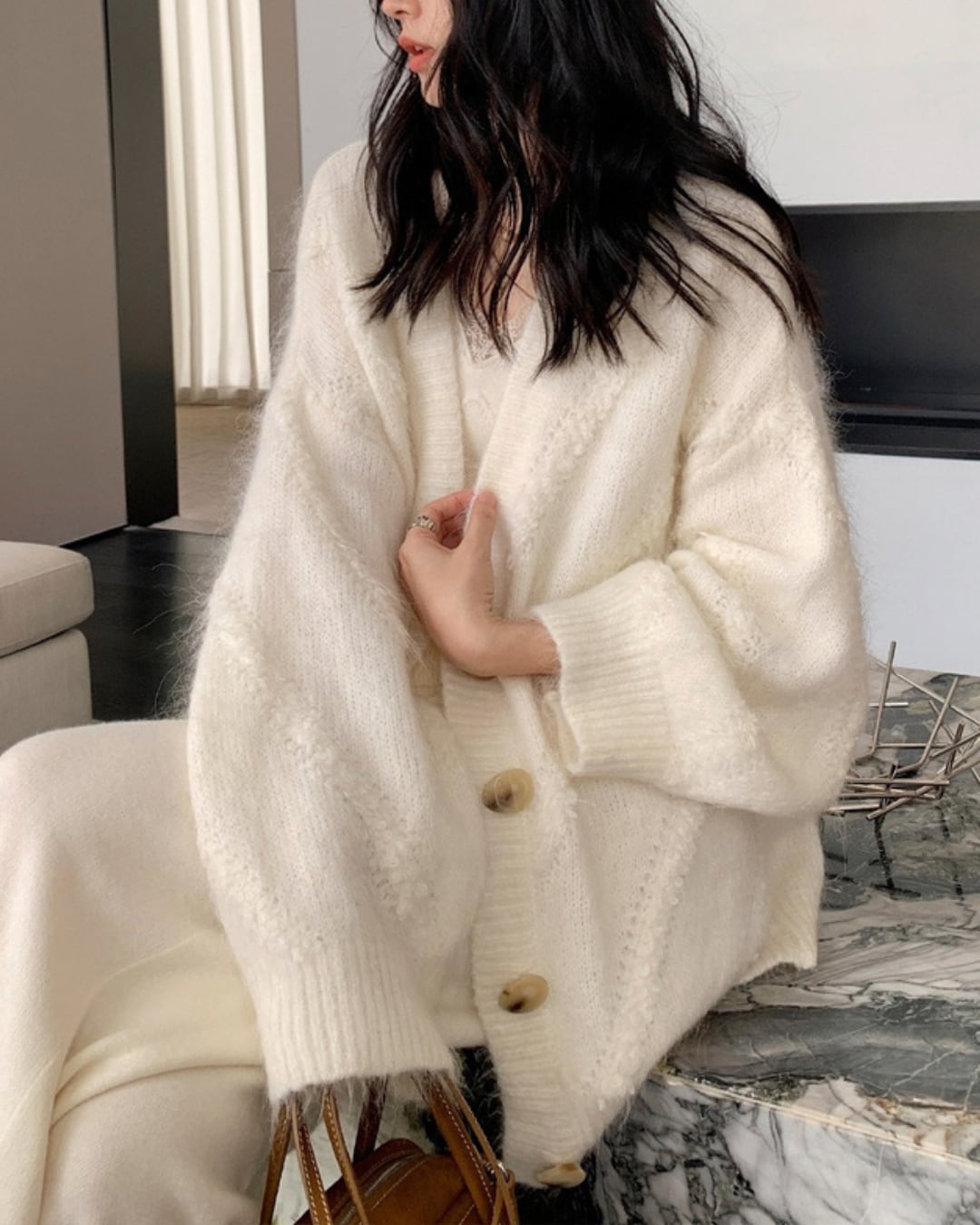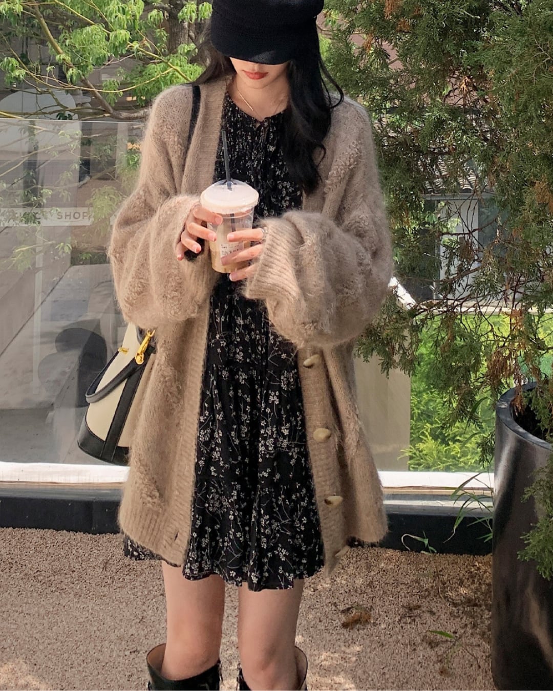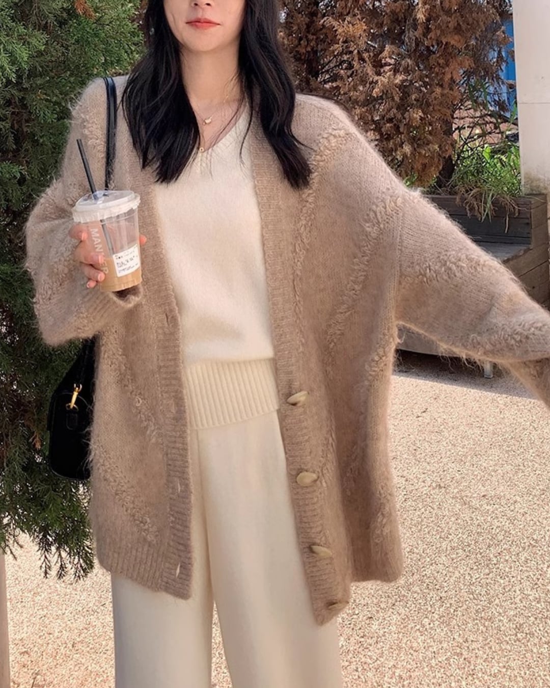 季節を問わず着回せる、柔らかく暖かみのあるシャギーニットカーディガン。ややゆとりあるシルエットで抜け感を演出し、パンツにもスカートにも合わせやすい万能アイテム。大きめボタンとVネックが顔周りをすっきりと見せてくれます。おうち時間からお出かけまで幅広く活躍してくれる1着です。