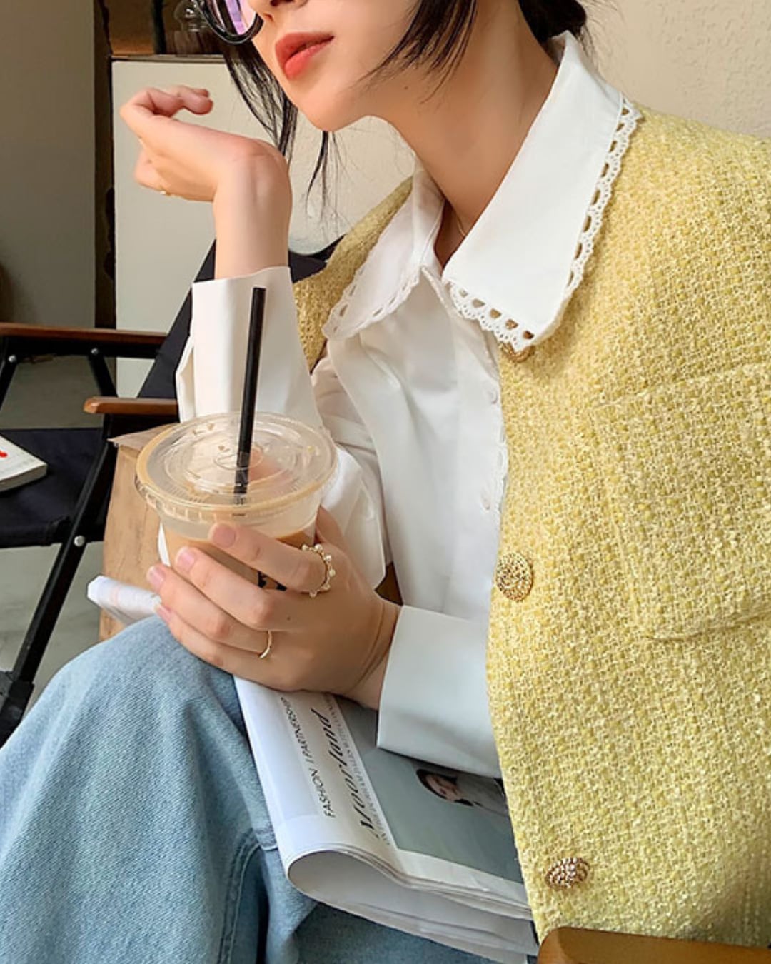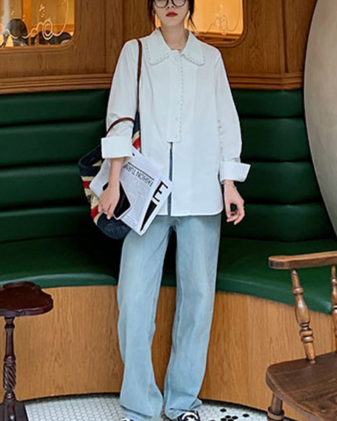 可愛さと上品さを両立したフリル刺繍入りのビッグカラーが目を惹くホワイトブラウス。軽やかな生地感でゆったりとしたシルエットは、抜け感を演出しながらもきちんと感を保ってくれます。袖口や前立てにあしらわれた繊細なデザインが、シンプルながらも華やかさをプラス。一枚で着ても、ベストやニットのインナーとしても着回しの効く万能アイテムです。
