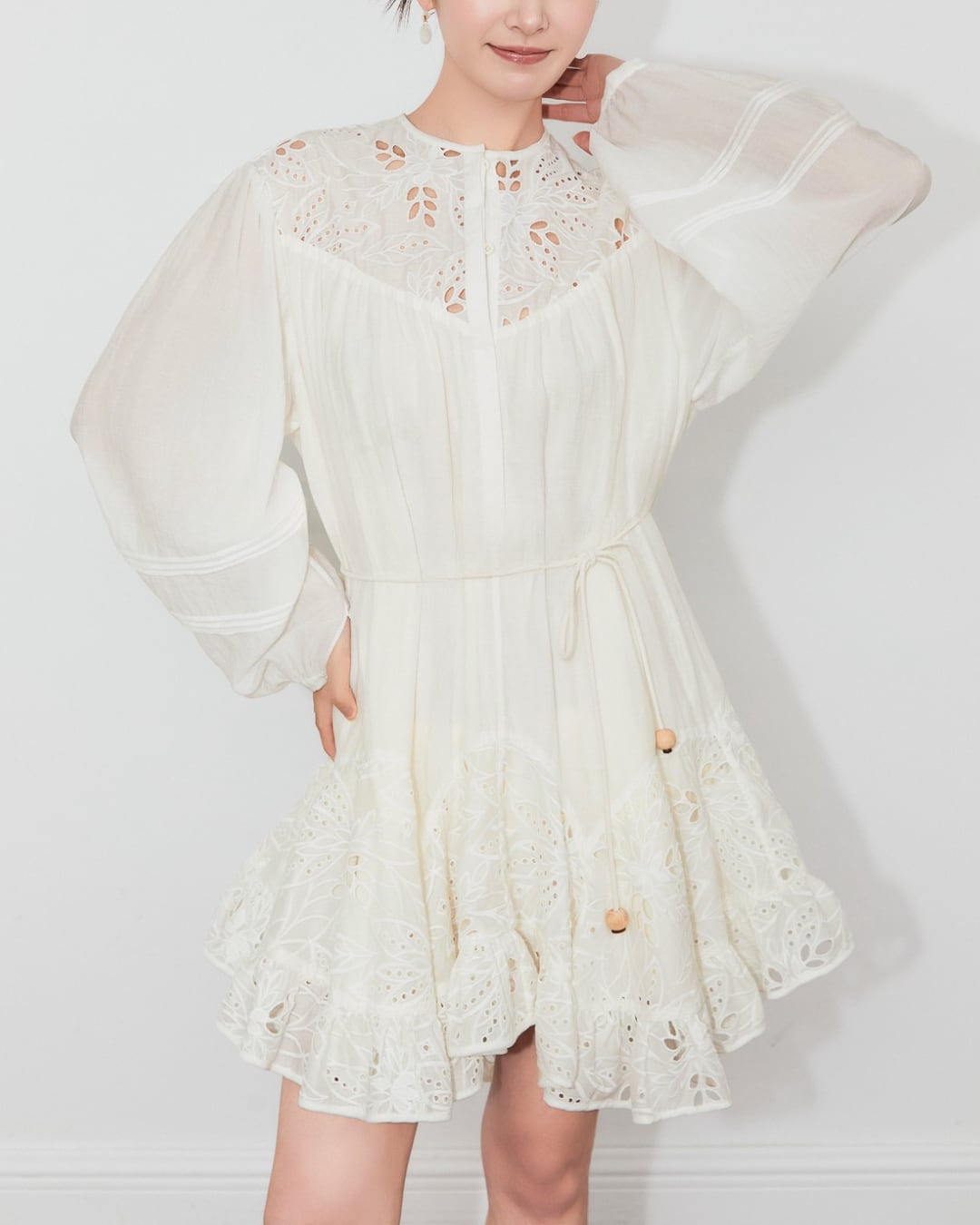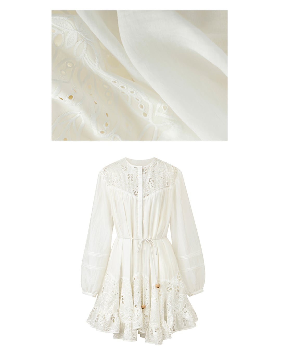 クラシカルなレース刺繍とティアードデザインが魅力のホワイトワンピース。ふんわりと広がるAラインシルエットが、自然にスタイルアップを叶えてくれます。ウエストは紐で調整可能なので、体型に合わせて着用いただけます。デコルテや裾に施された透かしレースは、女性らしさを引き立てる繊細なアクセントに。軽やかな素材感とふんわり袖が、春夏の装いにぴったりの一着です。シンプルなデザインながら、どこかロマンティックな雰囲気を漂わせ、街歩きやお出かけ、リゾートスタイルにも活躍するアイテム。