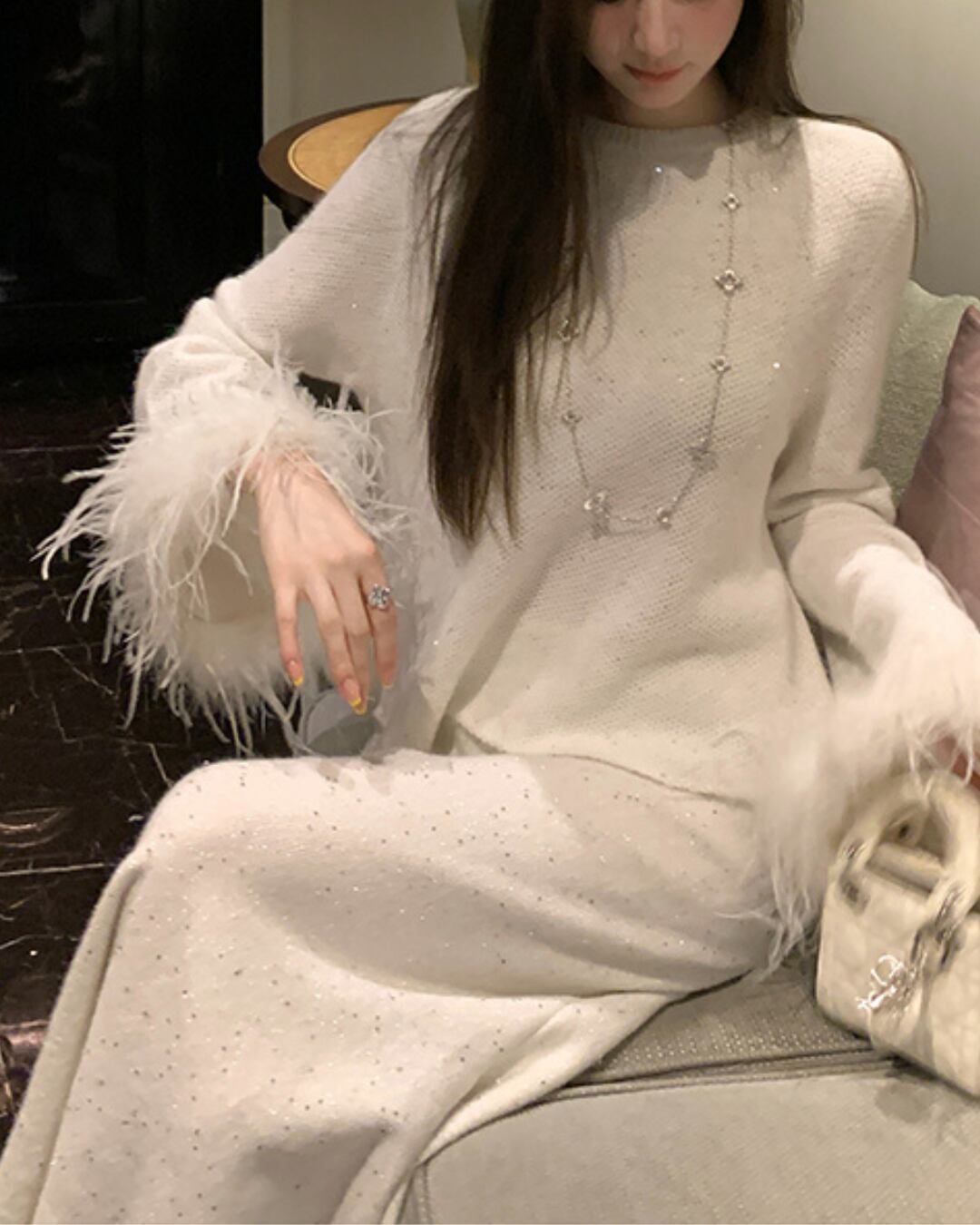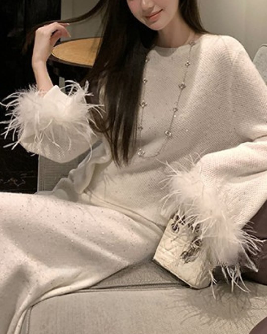 袖口にふわふわのフェザーディテールをあしらった、華やかさと上品さが同居するニットトップス。全体に細かなラメが織り込まれており、さりげないきらめきが動くたびに視線を集めます。シンプルなクルーネックで顔周りはすっきりと見せつつ、袖のボリューム感でメリハリのある大人ガーリースタイルが完成します。セットアップのスカートと合わせれば、ドレスライクな着こなしも叶います。