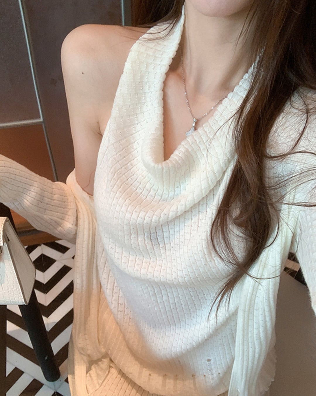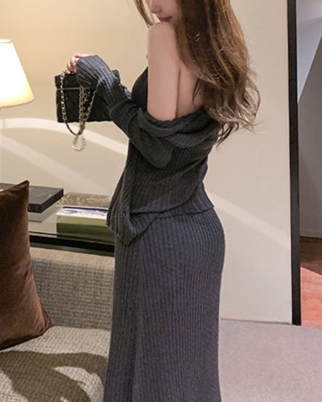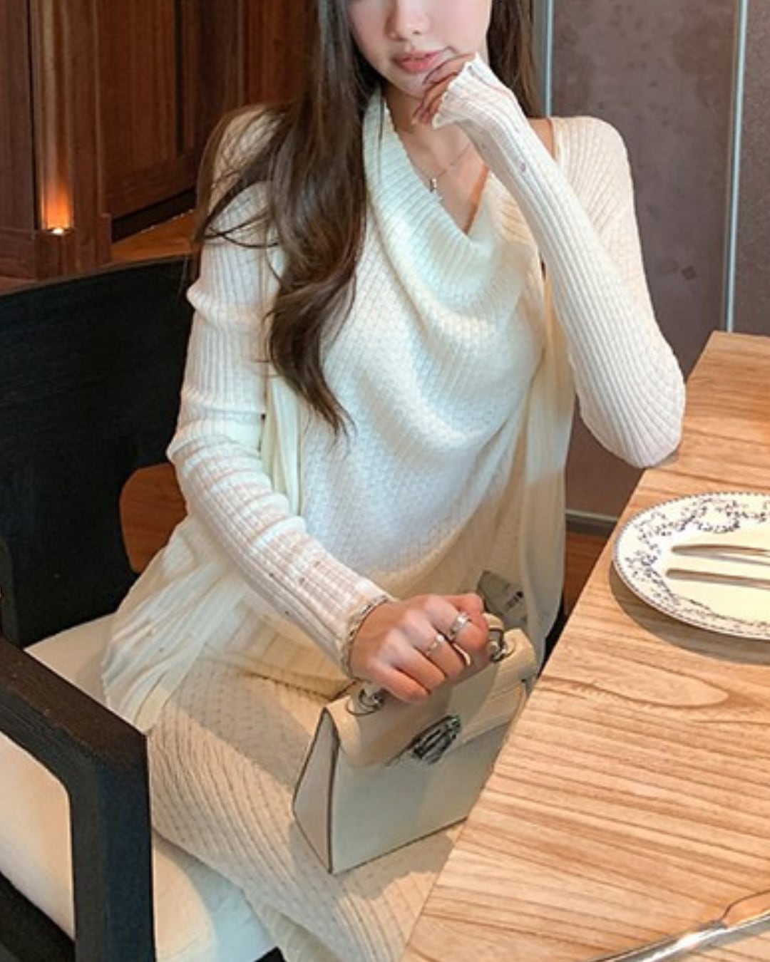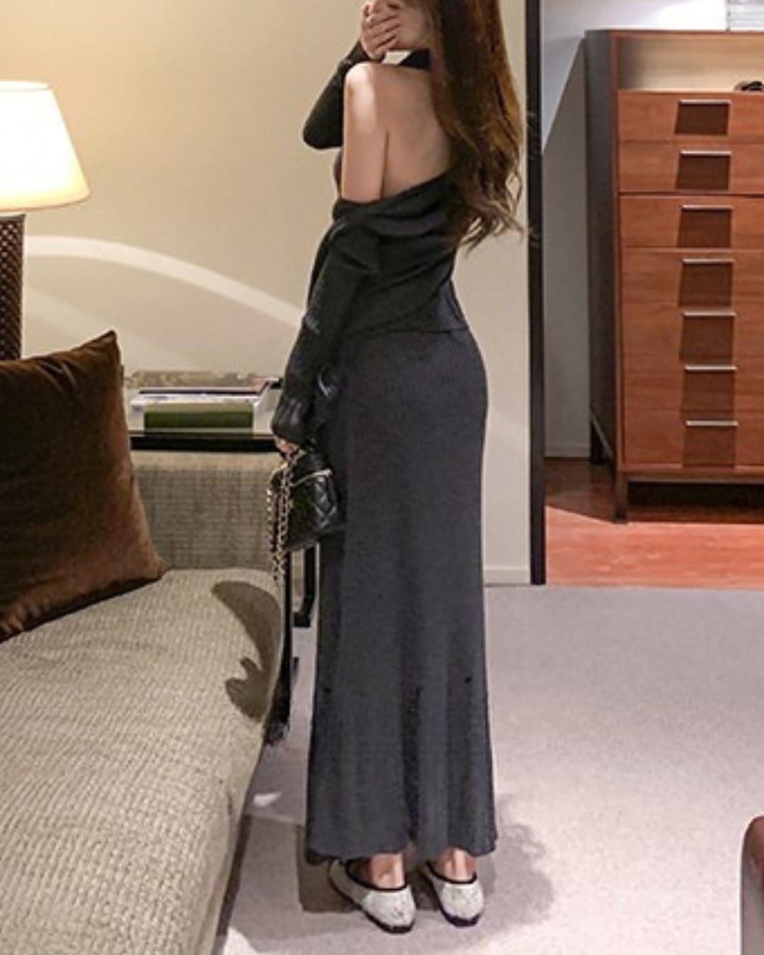 優雅さと抜け感を両立させた、大人のためのリブニットセットアップ。トップスはホルターネックニットとカーディガンのセットで女性らしいデザイン。裾に向かってやや広がるマーメイドシルエットのスカートは、リブニットならではの落ち感で美しい縦ラインを演出します。セットではもちろん、別々でも着まわせる優秀アイテム。休日のカフェデートやオフィスカジュアルにも◎