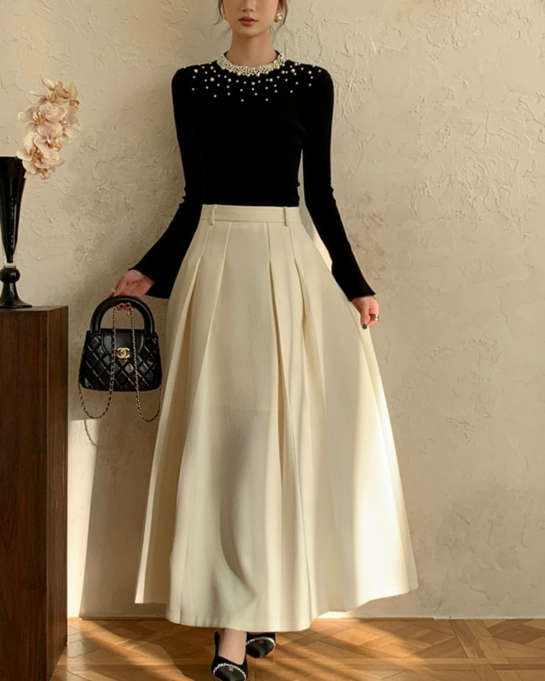 首元に贅沢に散りばめられたパールが、顔まわりを華やかに彩るリブニットトップス。シンプルなシルエットながら、デコラティブなパールの煌めきがアクセサリーいらずで着映え感を演出。袖口はフレアデザインで、女性らしいエレガンスをプラスしました。リブ編みがほどよく体にフィットし、ラインを美しく見せてくれるのも魅力。スカートと合わせればクラシカルに、デニムやパンツと合わせれば大人カジュアルにと、幅広いシーンで活躍する一枚です。