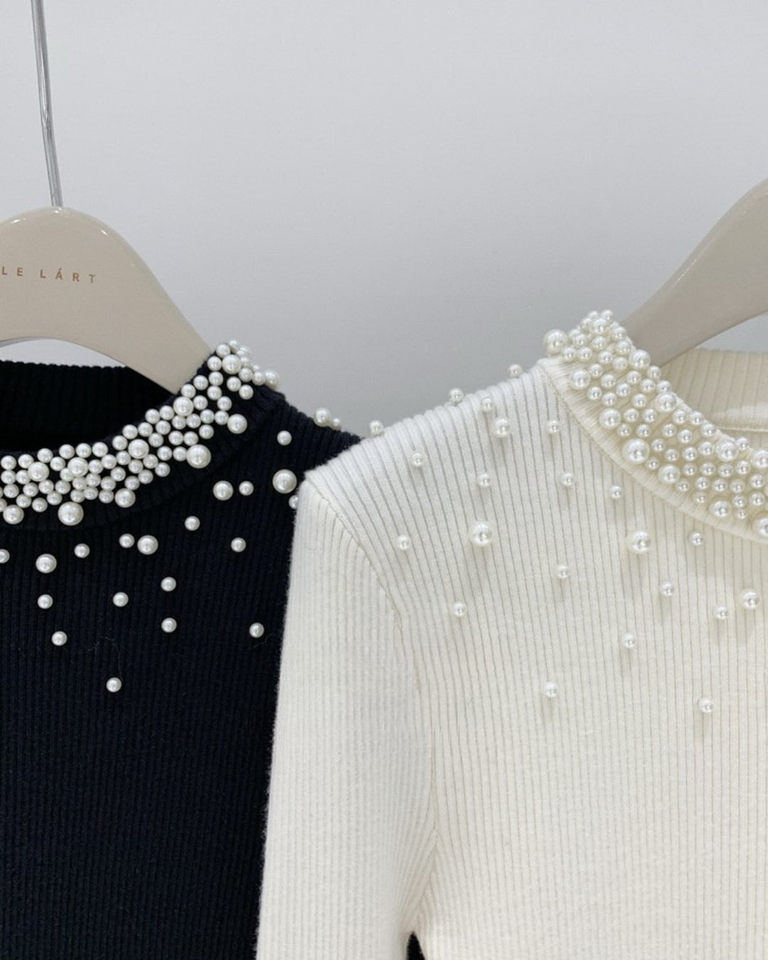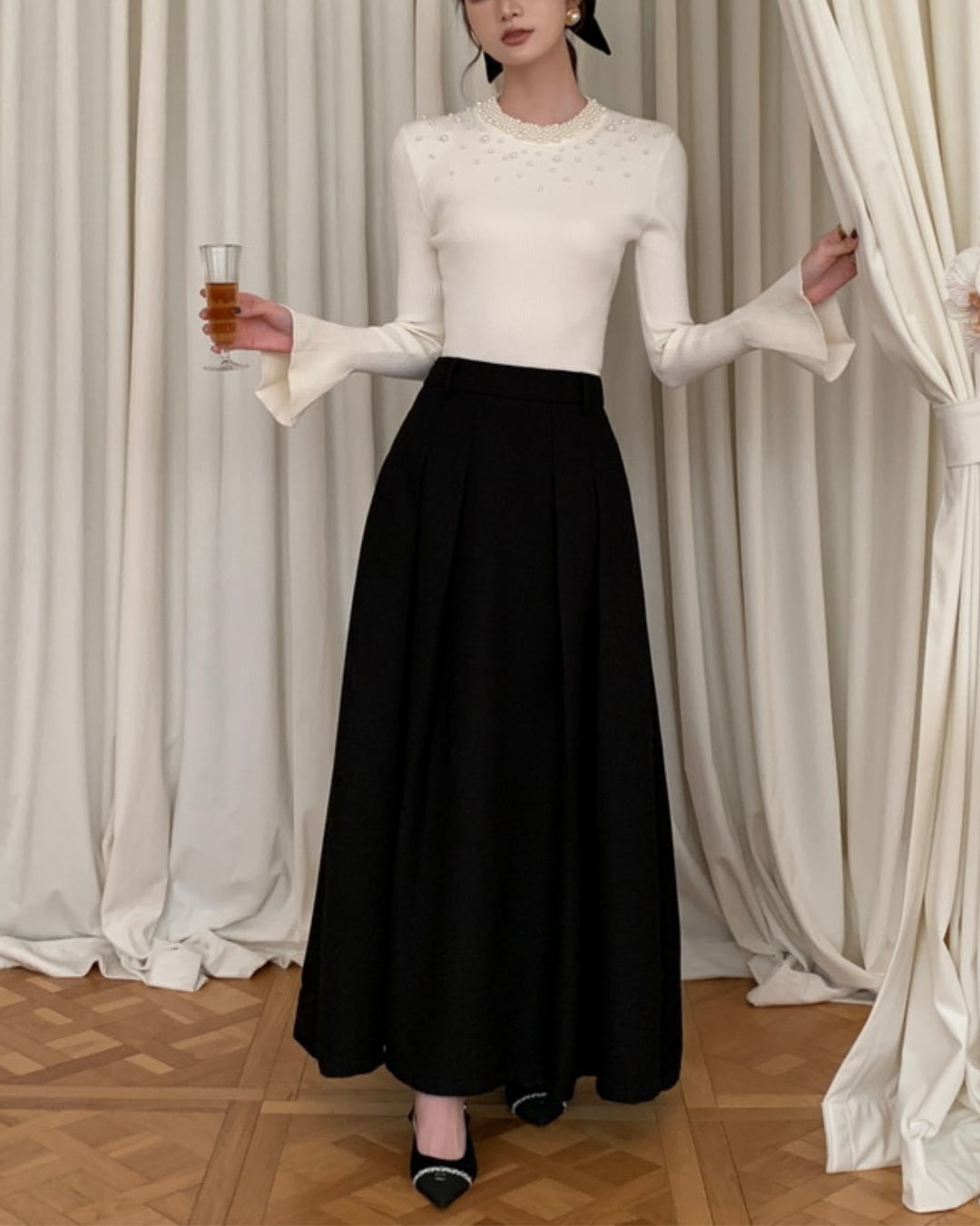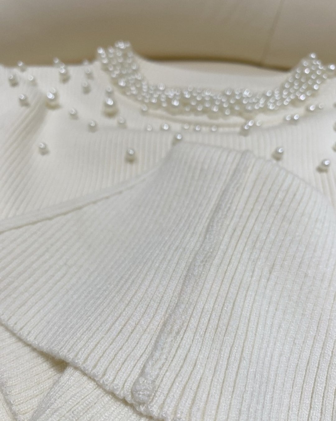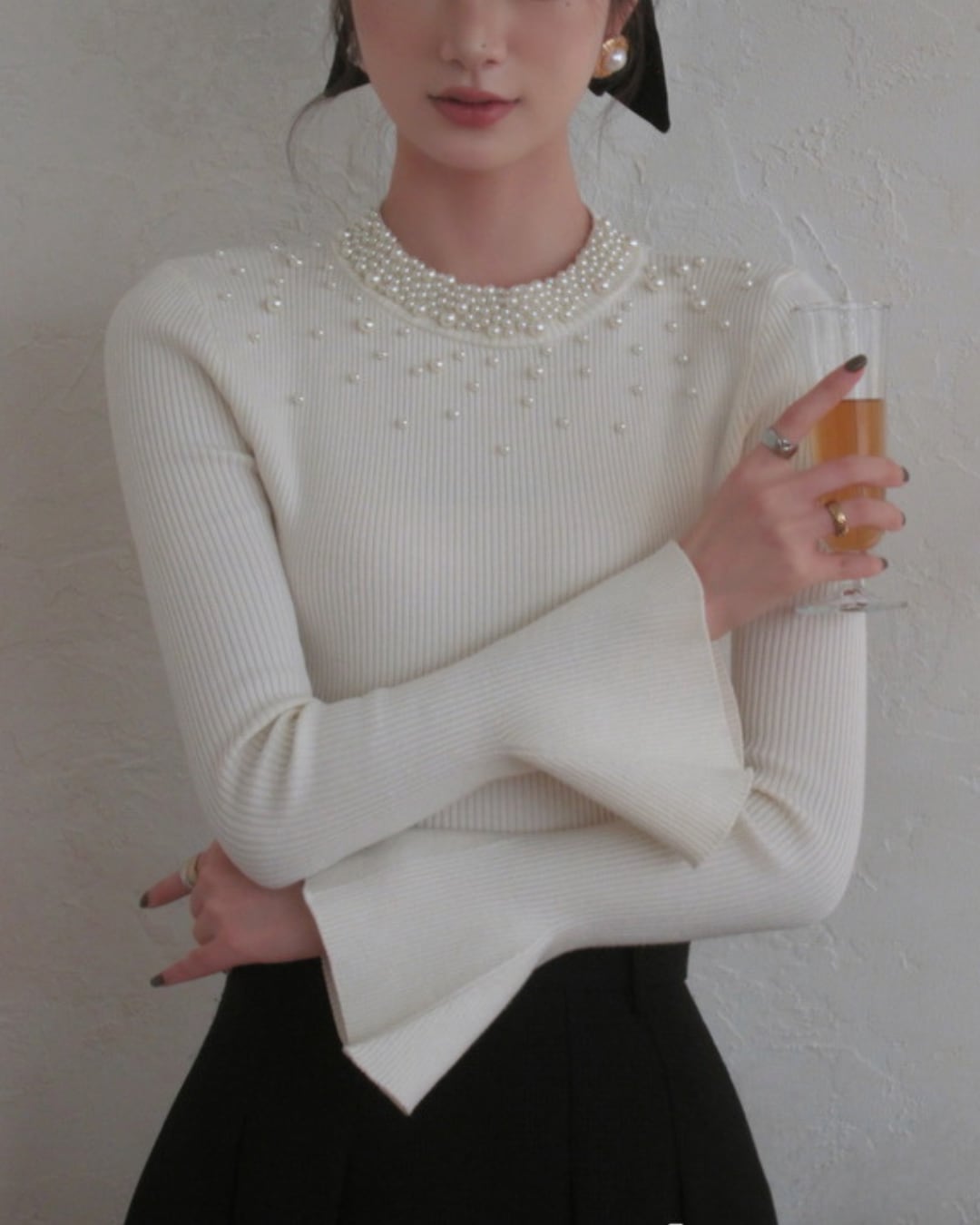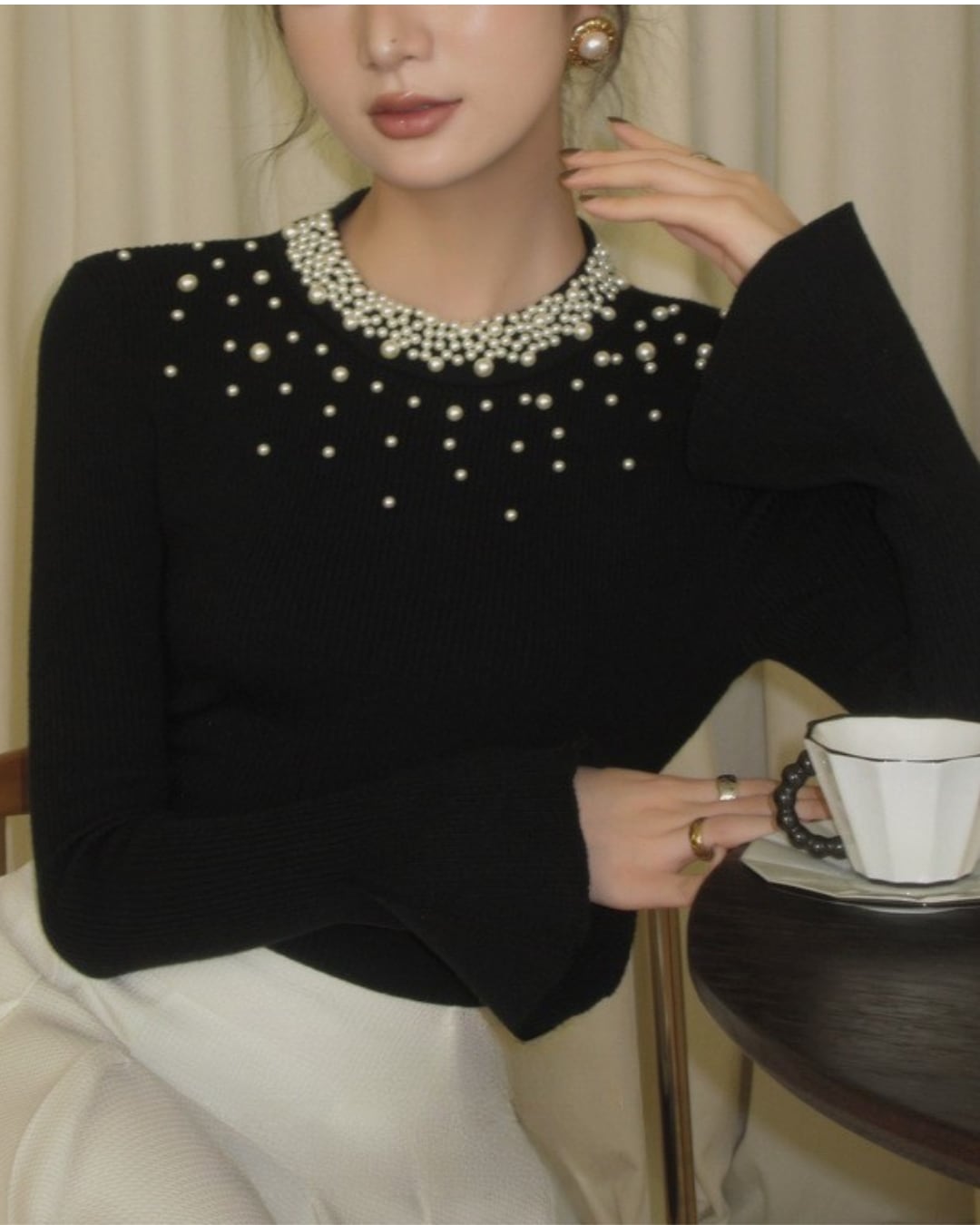 #パールニット #リブトップス #フレアスリーブ #クラシックエレガント #着映えトップス #春ニット #秋冬新作