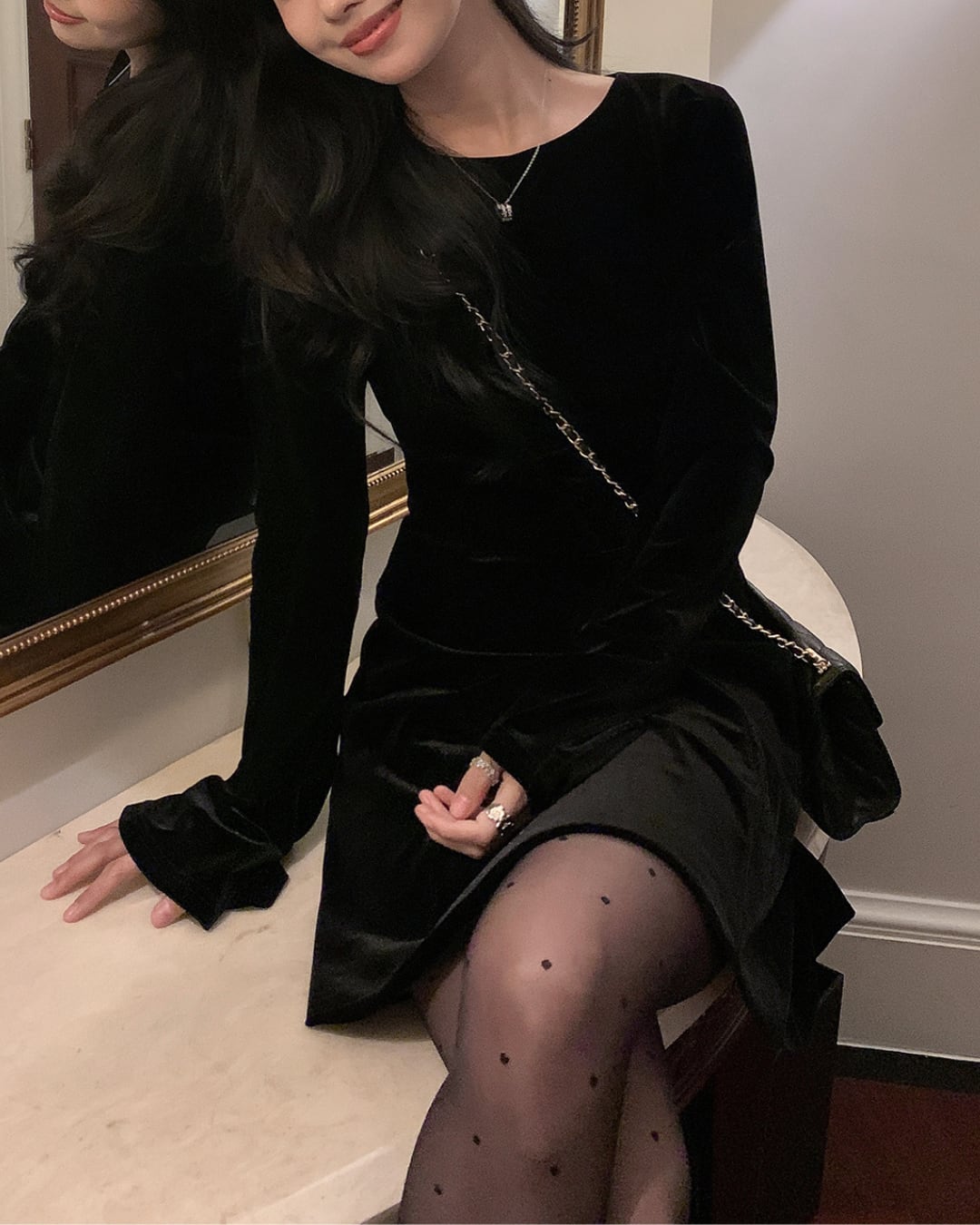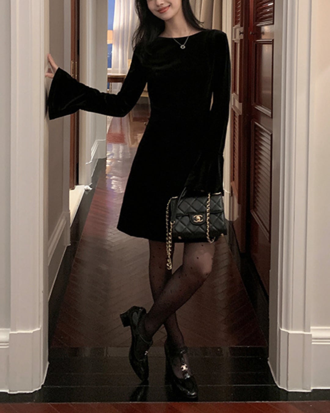 #ベルベットワンピース #フレアスリーブ #ブラックドレス #大人ガーリー #クラシカルワンピ #お呼ばれコーデ #美シルエット