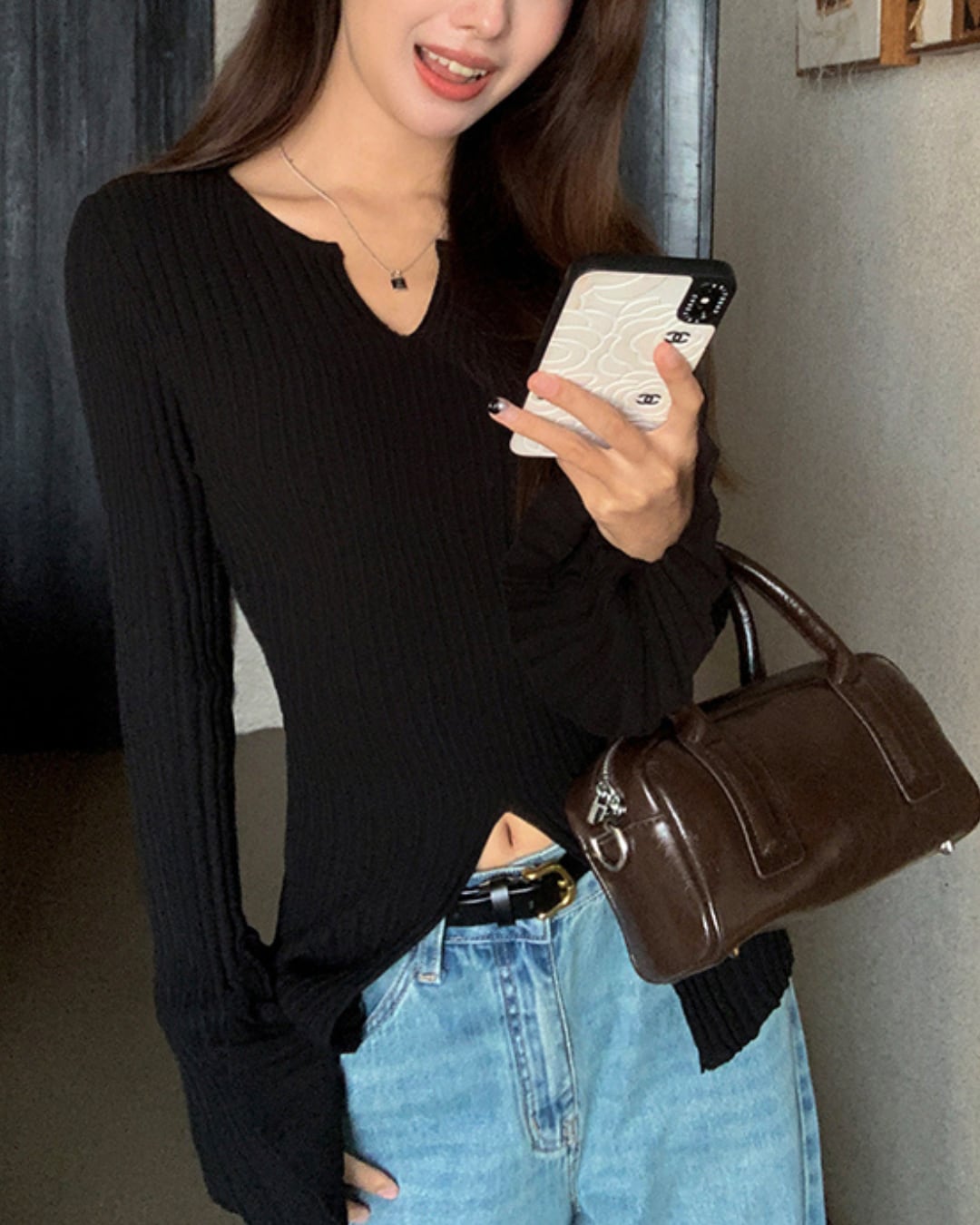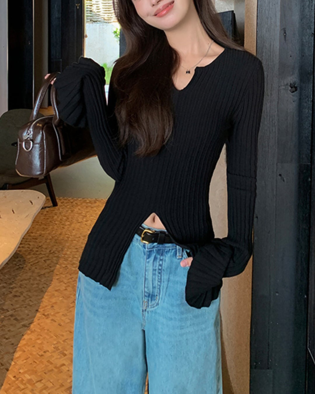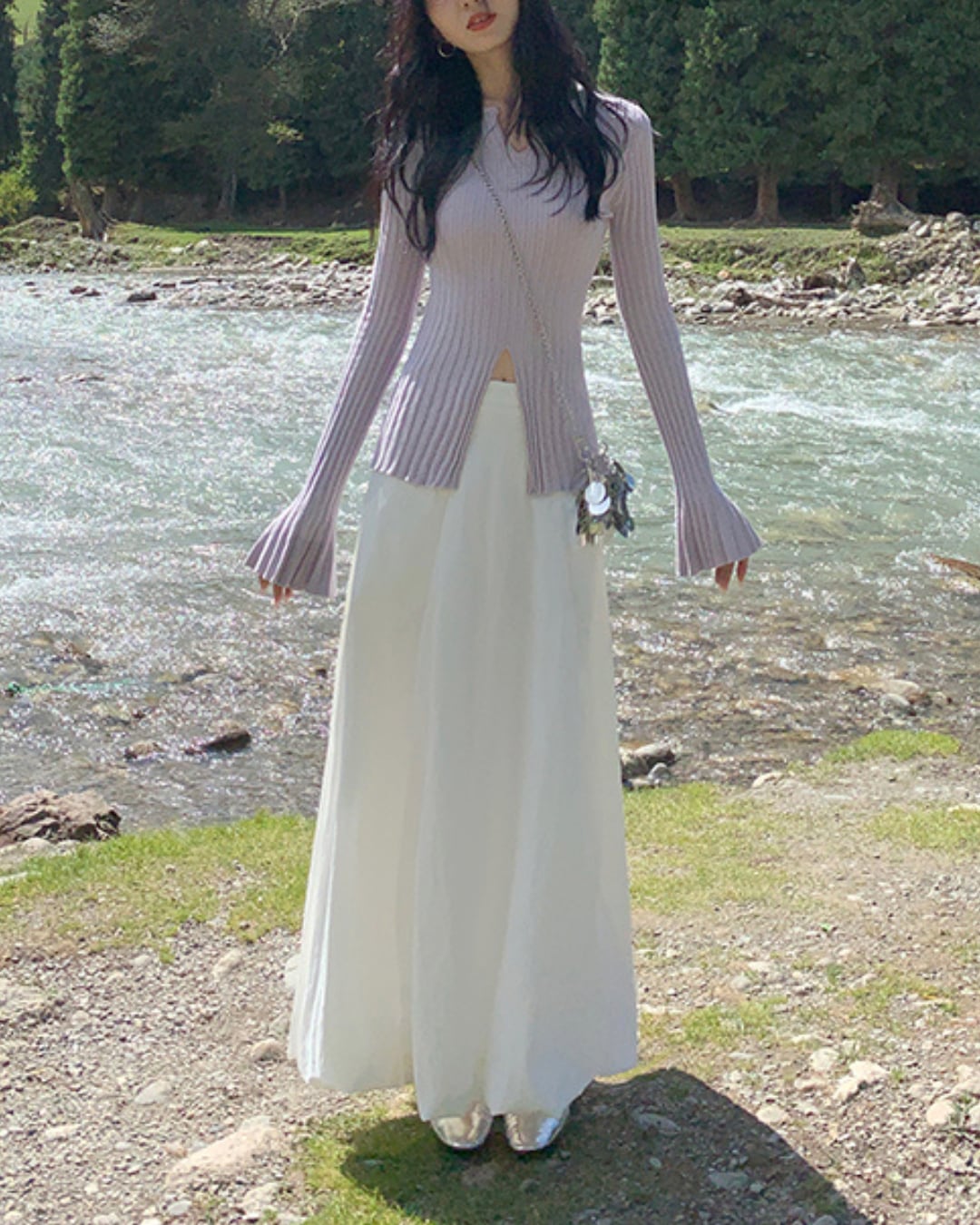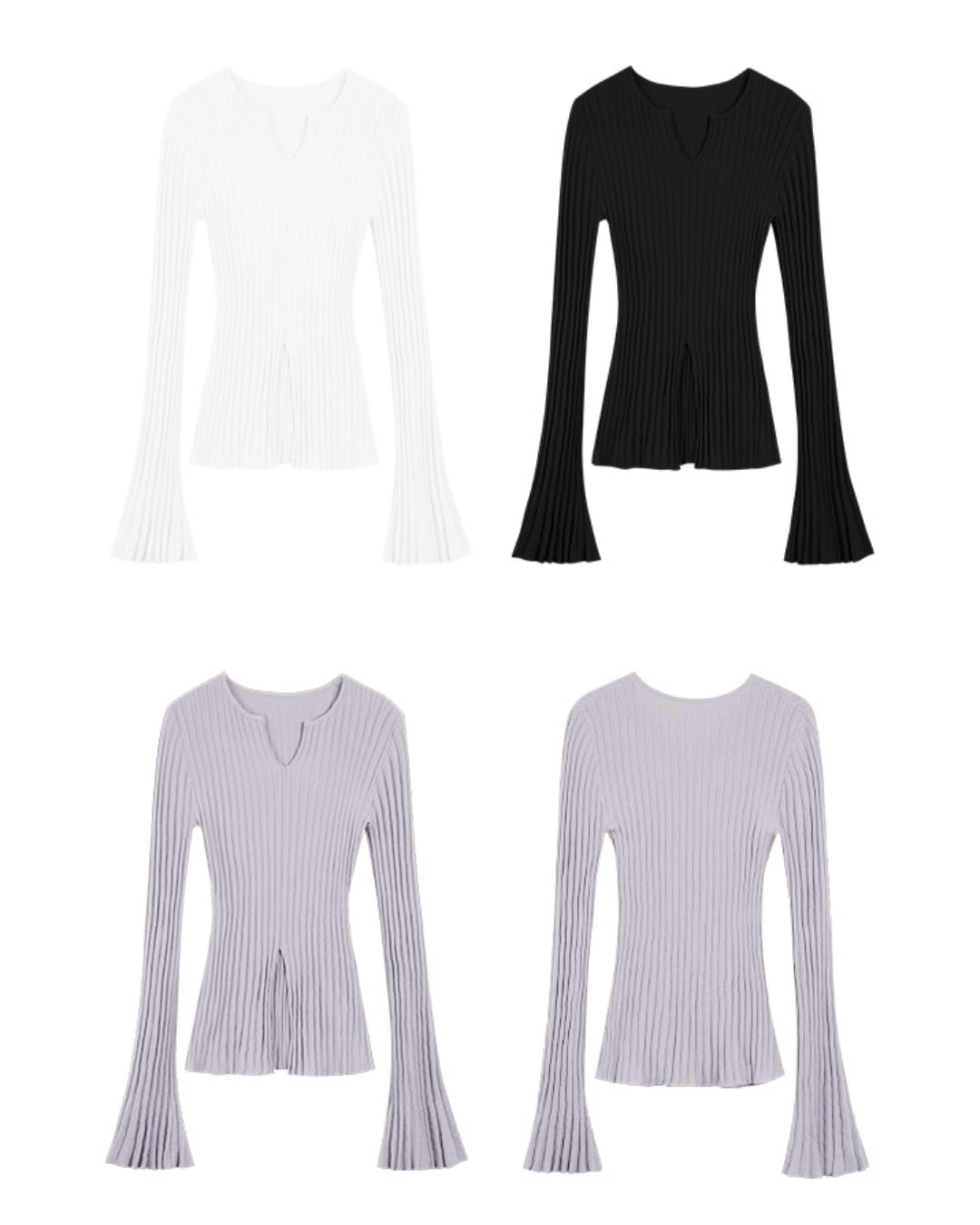 細リブ編みのスリムなシルエットに、フロントのさりげないスリットがポイントのリブニットトップス。裾に向かって広がるベルスリーブがフェミニンで、華奢な手元を演出してくれます。鎖骨がきれいに見えるカッティングのラウンドネックが大人ガーリーな雰囲気を引き立て、1枚で着映えるアイテムです。スカート合わせで甘く、デニム合わせでカジュアルダウンも◎。