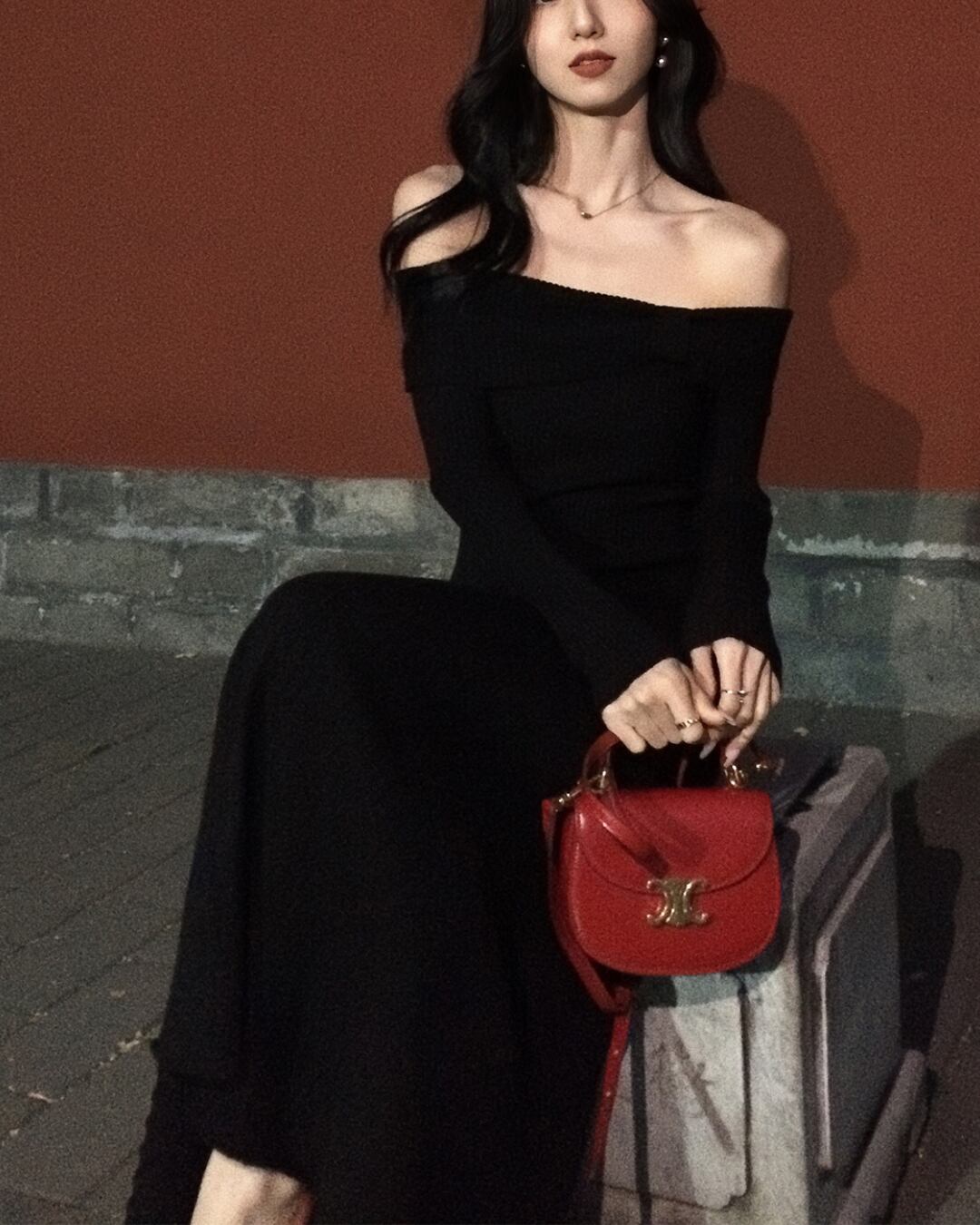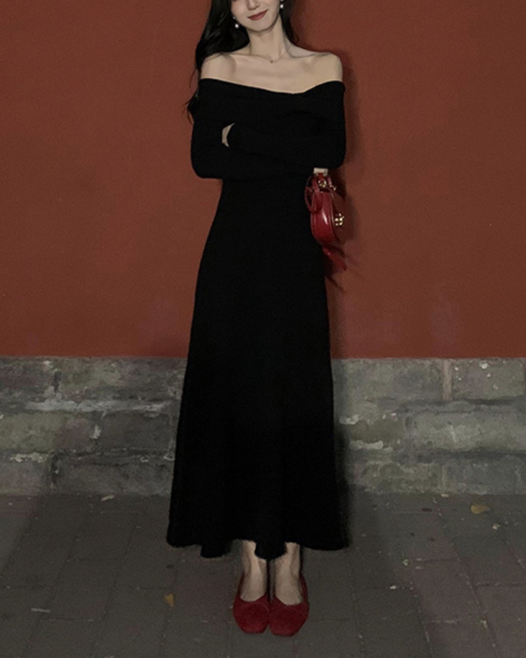 #オフショルワンピース #Aライン #パールボタン #大人ガーリー #リブニット #美シルエット #フェミニンコーデ