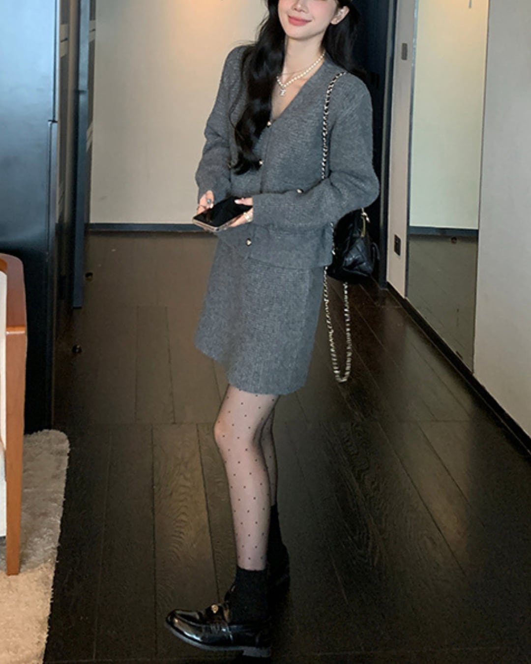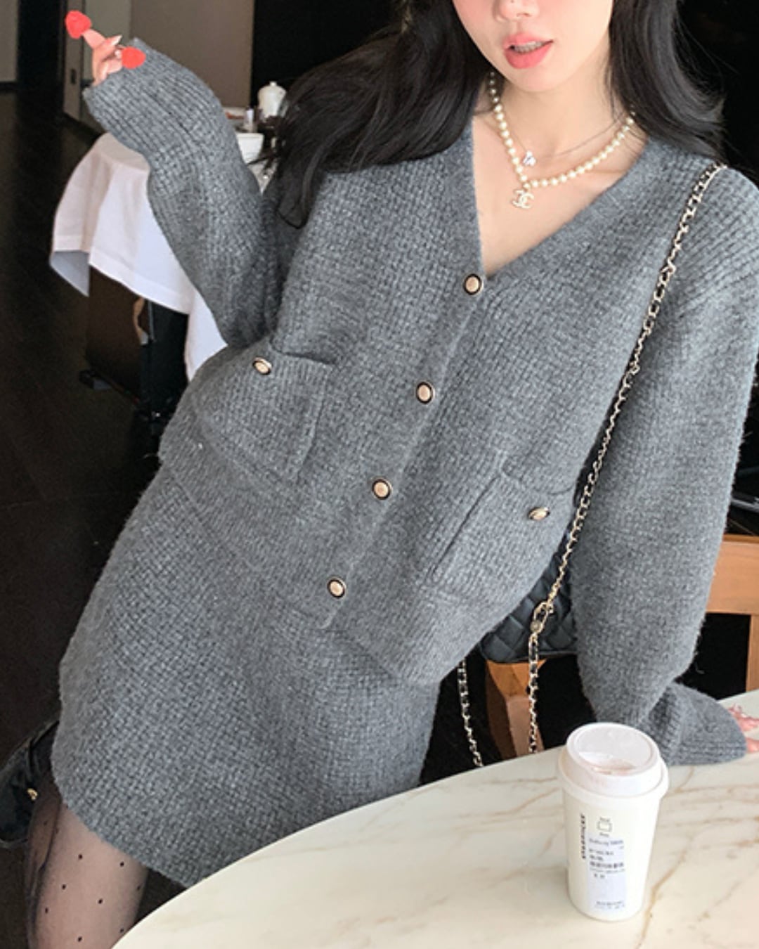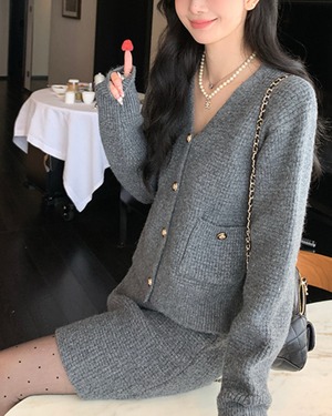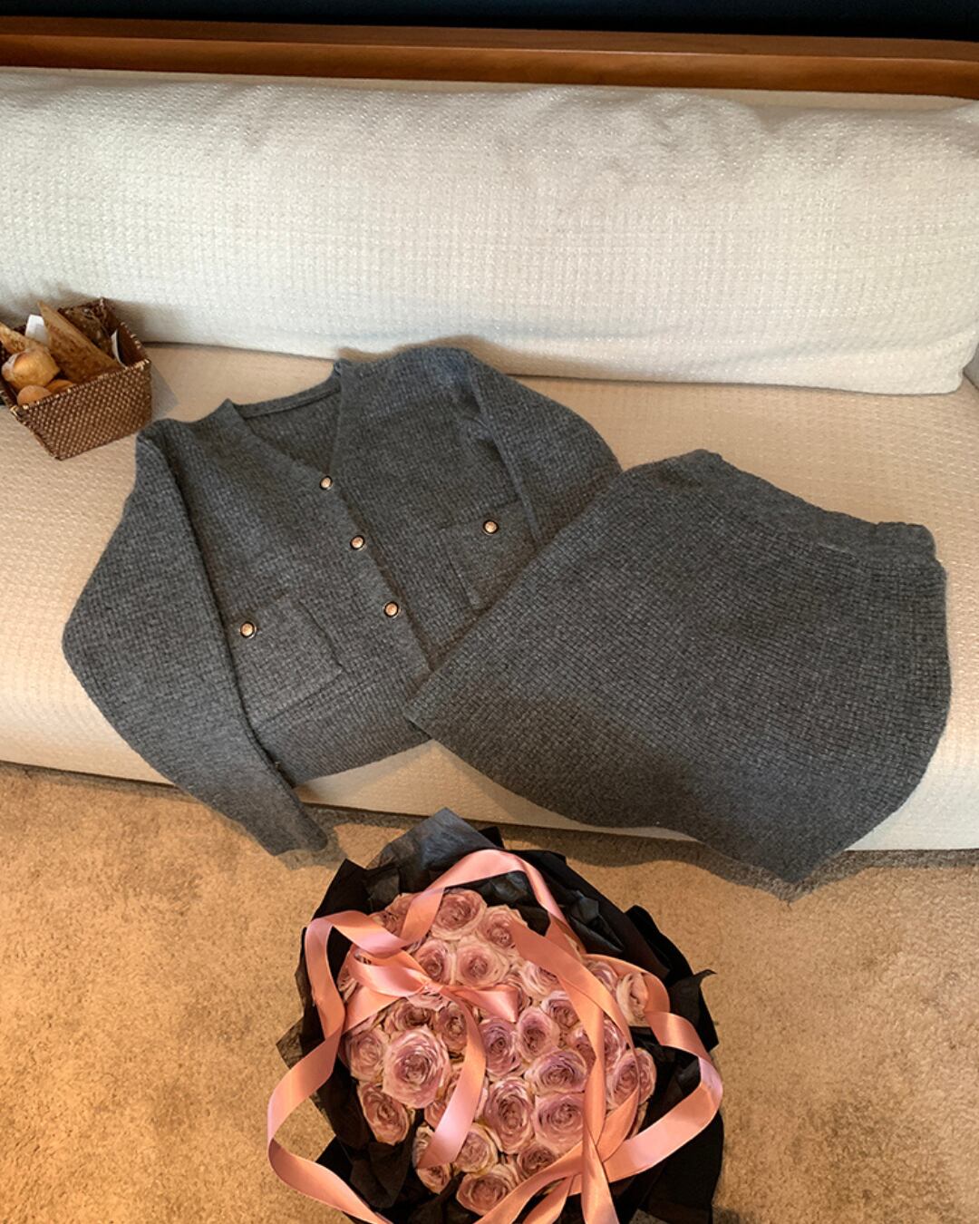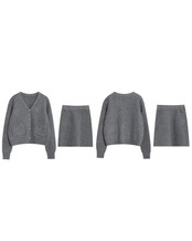 ふんわりとした柔らかなニット素材が魅力のセットアップ。Vネックのカーディガンはゴールドボタンと両サイドポケットが上品なアクセントに。スカートは程よくフィットしながらも締め付け感がなく、女性らしいシルエットを演出します。単品使いも可能なので、着回し力も抜群です。おうちコーデからデートスタイルまで、幅広いシーンに活躍します。
