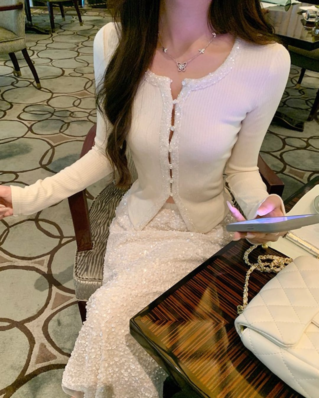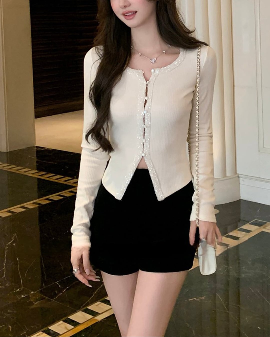 #ビジューカーディガン #ショート丈トップス #ラメボタン #ガーリーコーデ #デートコーデ #フェミニン #韓国ファッション #春夏コーデ