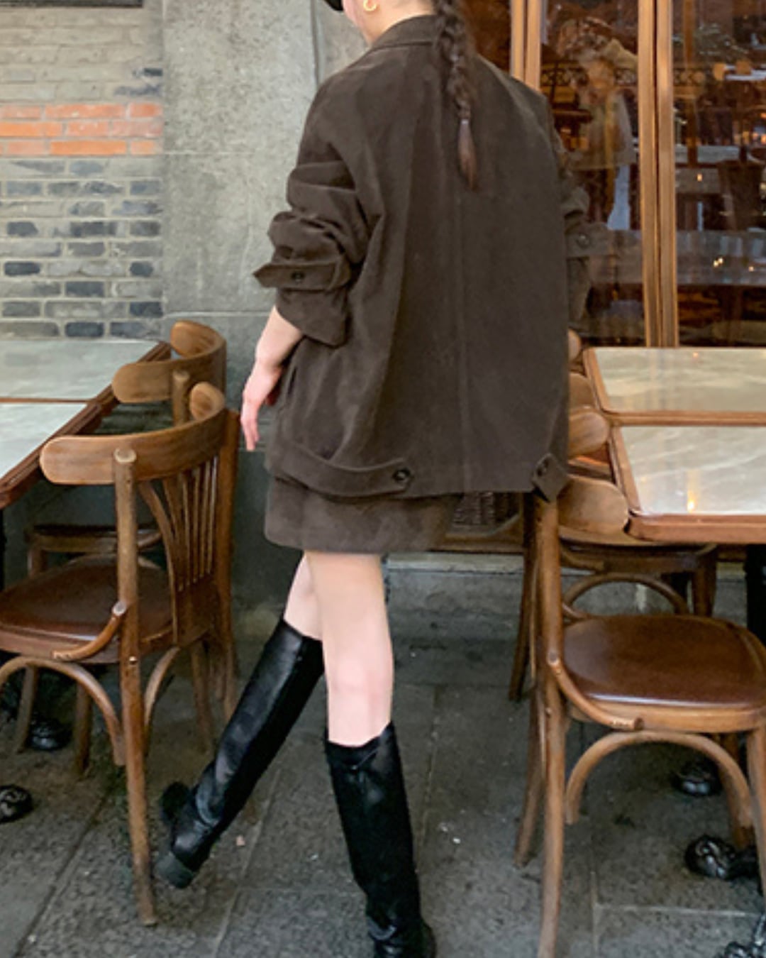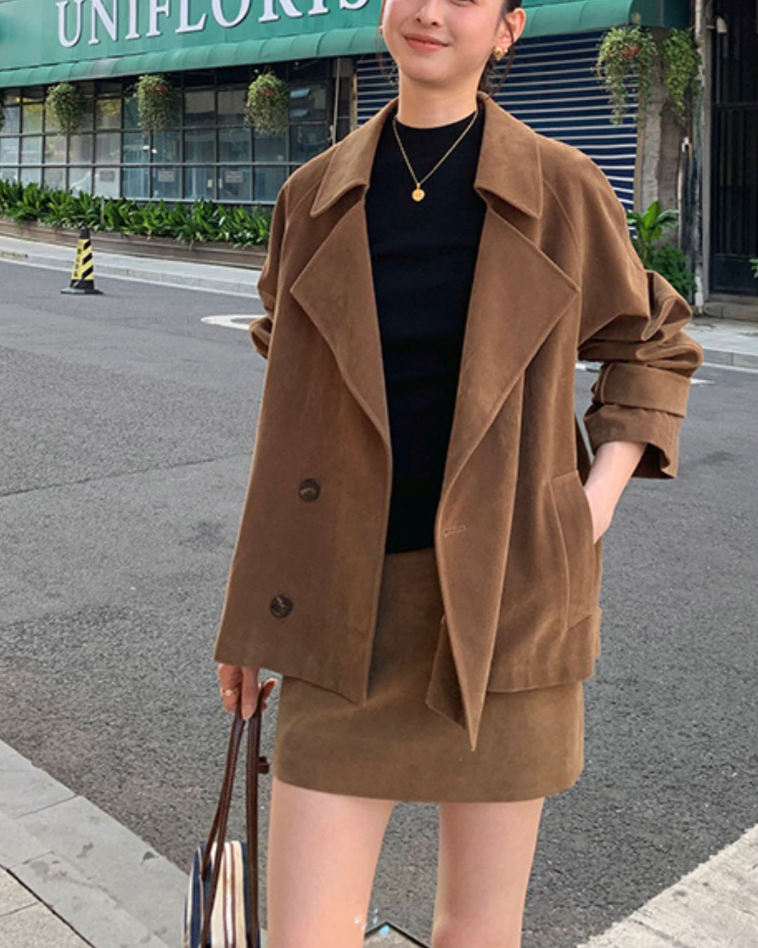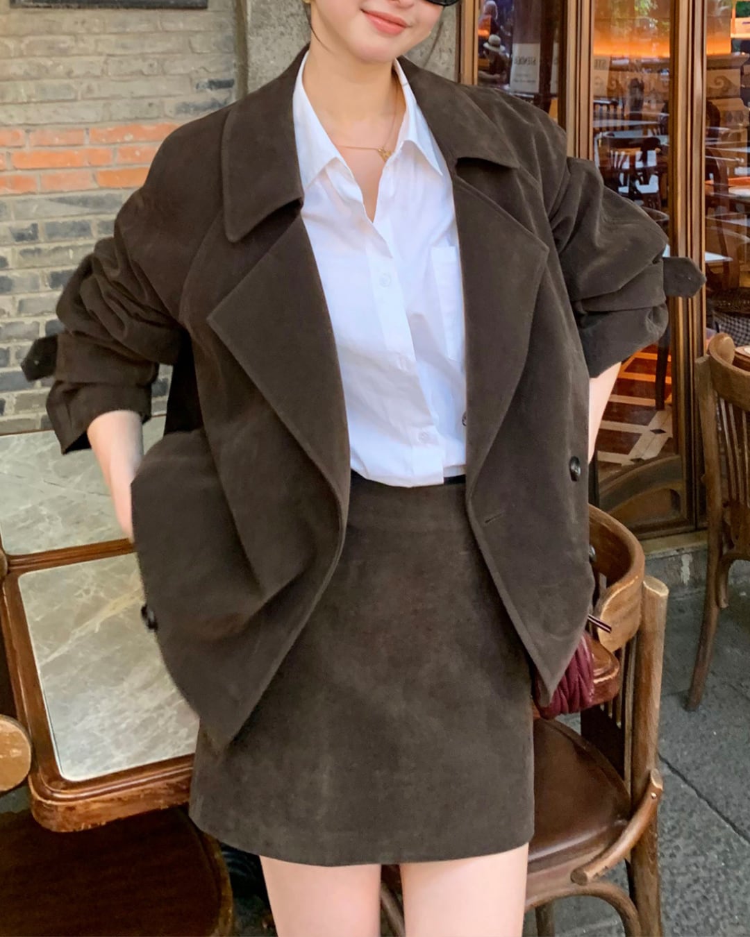 洗練された印象を与えるフェイクスエードのショートジャケットとスカートのセットアップ。柔らかな風合いのスエード調素材を使用し、肌触りはなめらかで着心地も抜群。ジャケットは大きめの襟元とダブルボタンの配置で、クラシカルな雰囲気とトレンド感を両立。ヒップラインにかけてゆるやかに広がるショートスカートは、美しいシルエットをキープしつつ体型カバーも叶えてくれます。セットアップでの着用はもちろん、単品使いでもコーディネートの幅が広がる万能アイテムです。