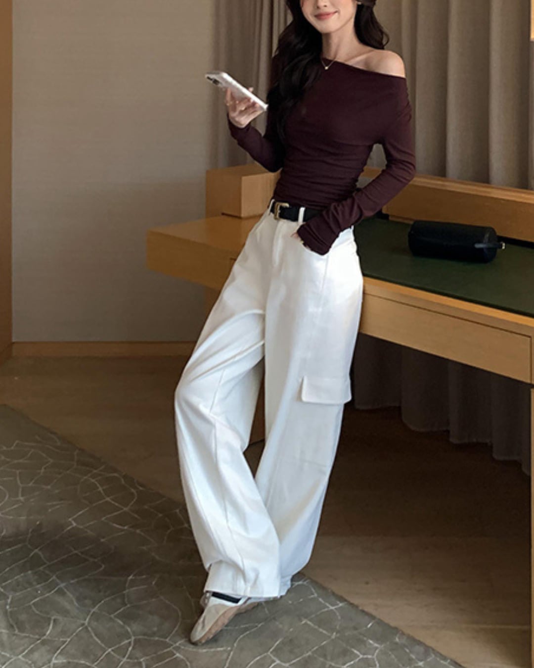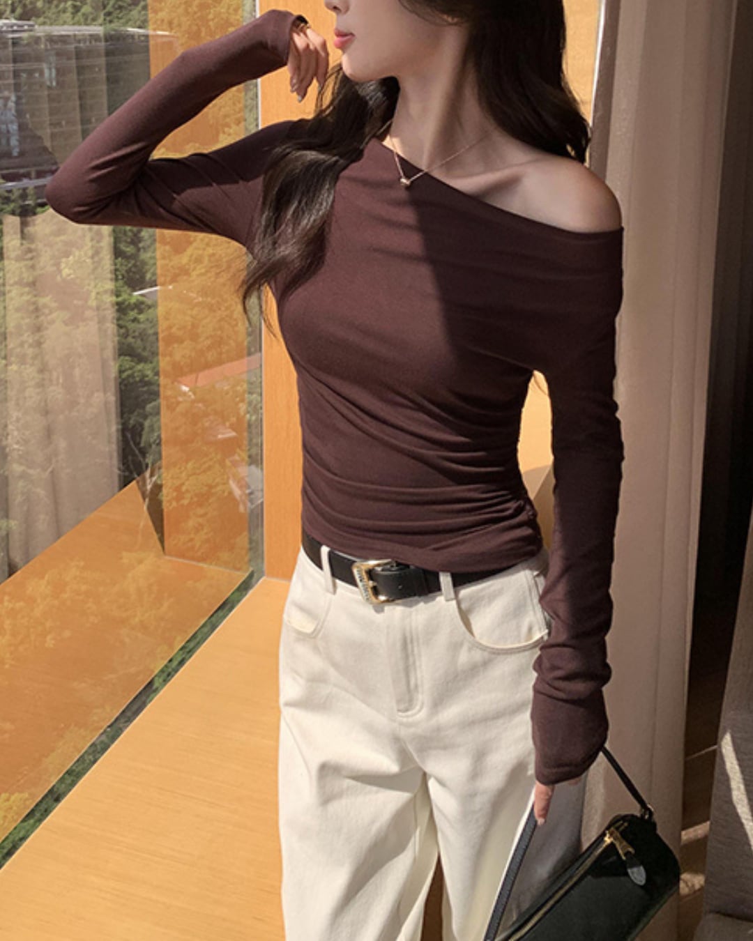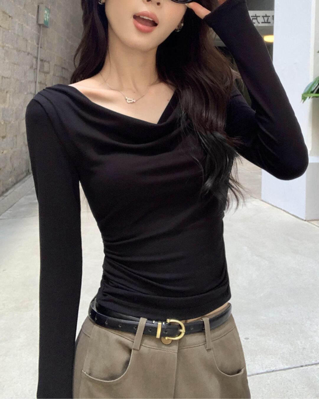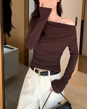 #ドレープネック #オフショルダー #大人ガーリー #美デコルテ #長袖トップス #きれいめカジュアル #細見え効果 #シンプルモード #抜け感コーデ