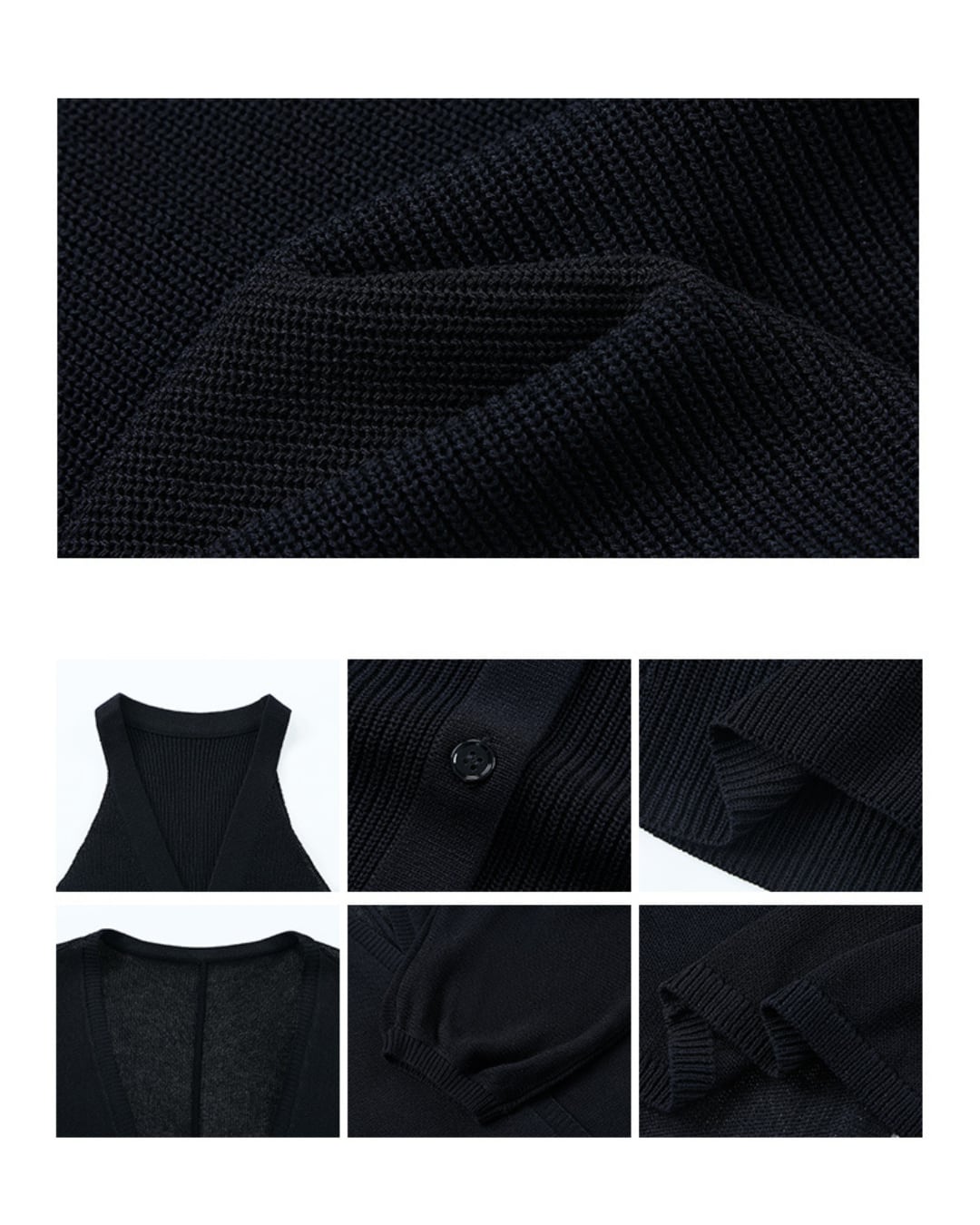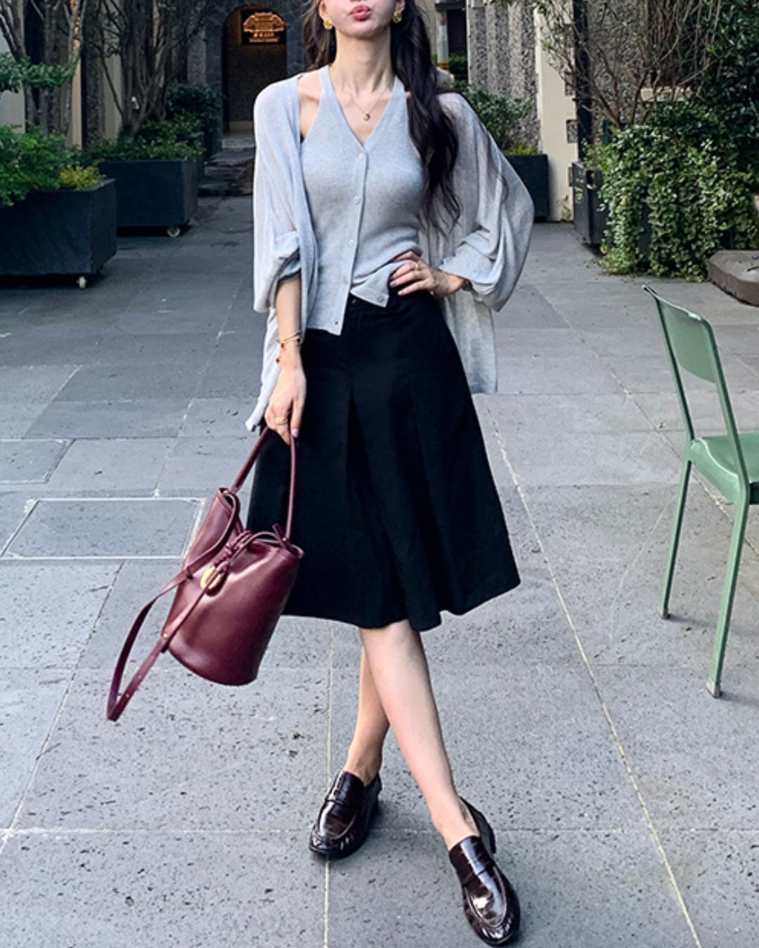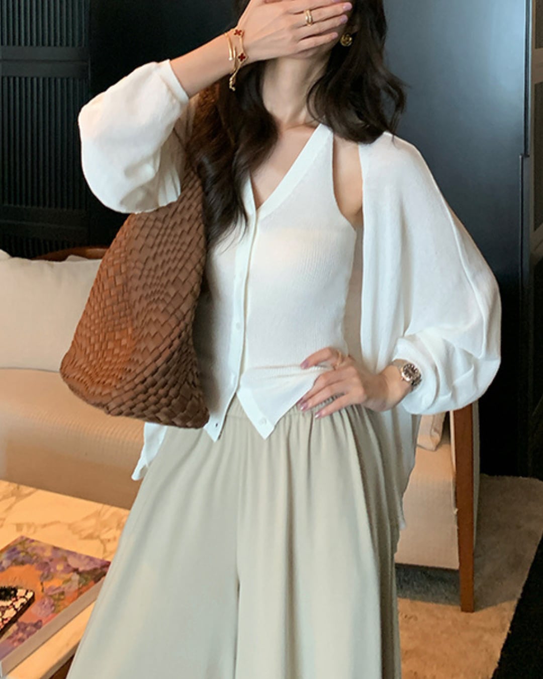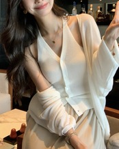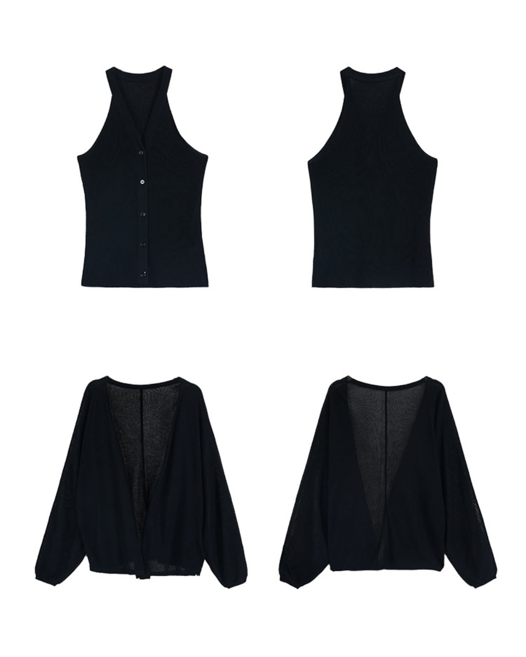 ほんのり透け感のある軽やかなサマーニット素材のカーディガンと、ヘルシーな肌見せが叶うホルターニットトップスの2点セット。Vネックのシンプルなラインがデコルテをすっきり見せ、ゆるめのシルエットが抜け感と品さを演出します。インナーと同色のセットなので、これ1つで簡単に大人ガーリーなスタイリングが完成。セットでも単品でも着回しできる、今季マストなアイテムです。