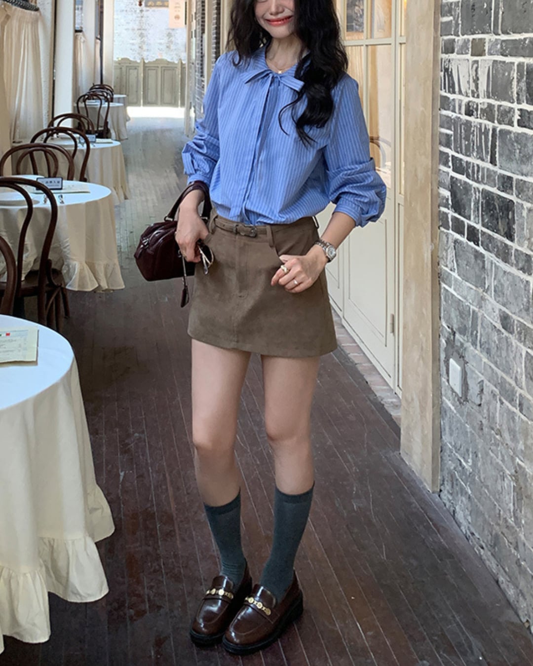 首元に施されたリボンタイが大人可愛い印象を演出してくれるストライプブラウス。爽やかなブルーベースに繊細なストライプ柄が清楚で上品な雰囲気を与えてくれます。軽やかな素材感で、春夏は1枚で、秋冬はレイヤードにもぴったり。通勤スタイルから休日のお出かけまで幅広く活躍するアイテムです。