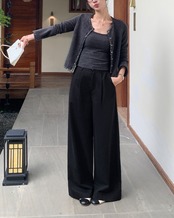 ラメ入りのトリムが上品な華やかさを演出する、カーディガンとキャミソールの2点セット。落ち着いたチャコールグレーに繊細なラメ装飾がきらりと光り、大人ガーリーなムードをプラス。肌触りの良い柔らかなニット素材で、快適な着心地も魅力。セットでも単品でも着回し力抜群のアイテムです。