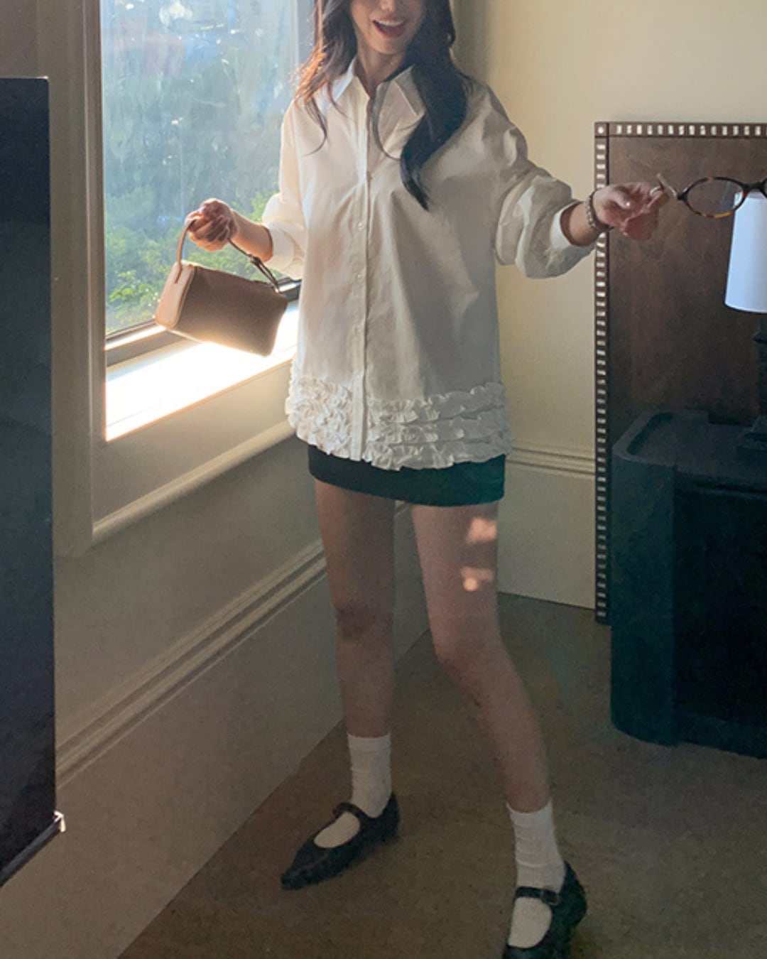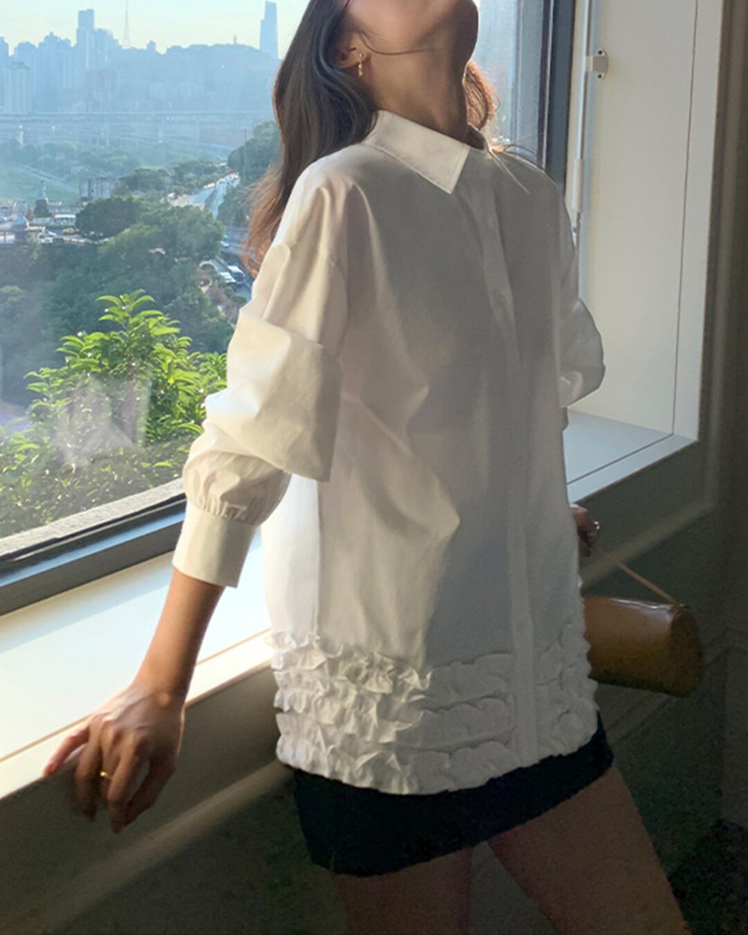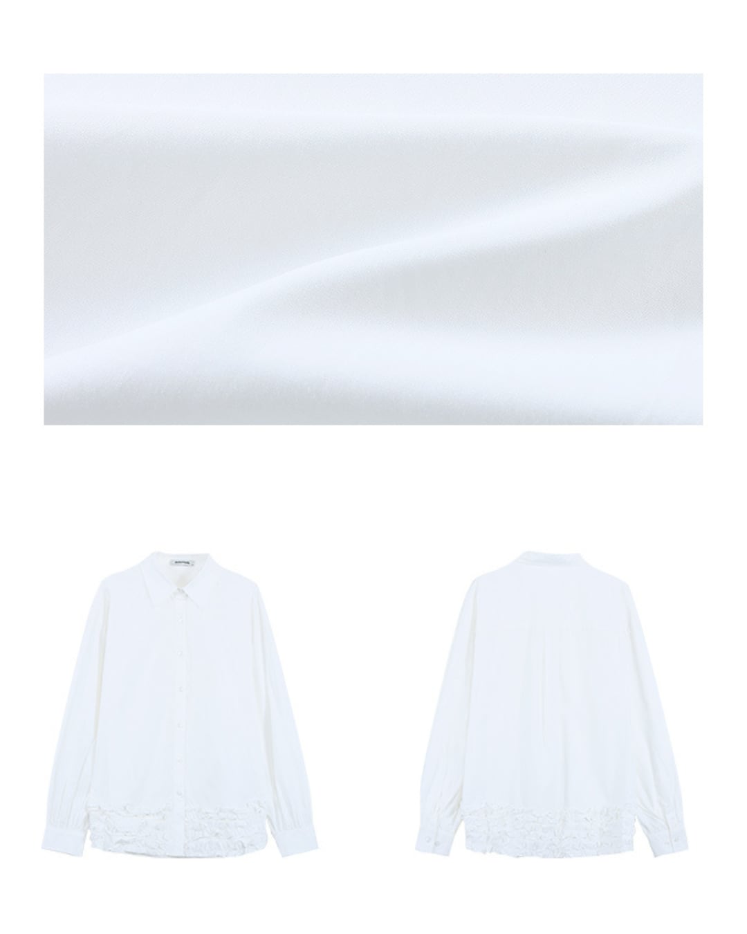 裾にあしらわれたふんわりフリルが目を惹く、クラシカルでロマンティックな長袖シャツ。シンプルな白シャツに華やかさをプラスし、甘すぎず大人可愛い印象に。上質なコットン素材で、肌触りも抜群。1枚で着映えするデザインは、ミニスカートやデニムと合わせてトレンド感のあるスタイリングが楽しめます。