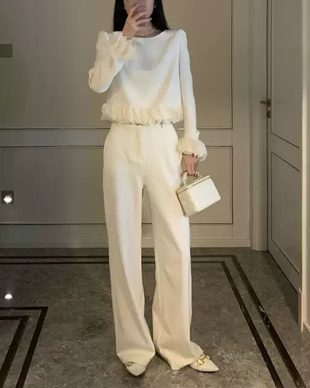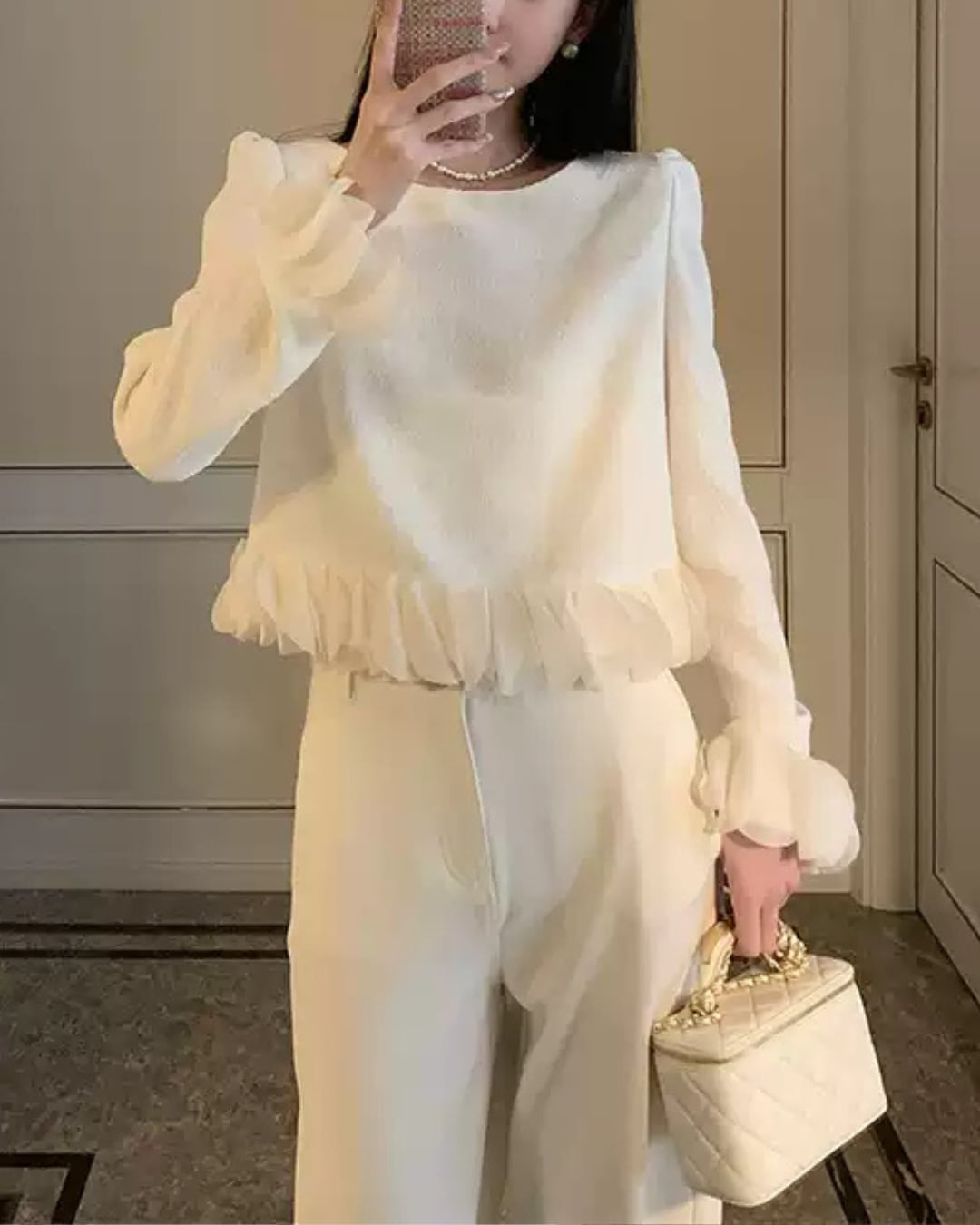 繊細なフリルディテールが印象的なフェミニンブラウス。袖口とウエスト部分に施されたふんわりと広がるフリルが、動くたびに柔らかな雰囲気を演出します。シンプルながらも華やかさがあり、デニムやスカートに合わせても上品に決まる大人ガーリーな1枚です。