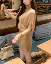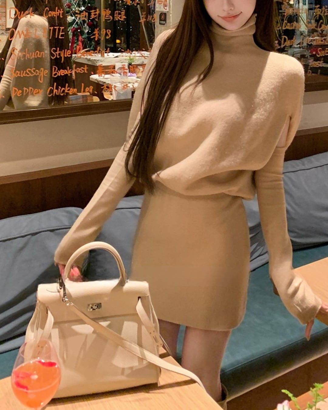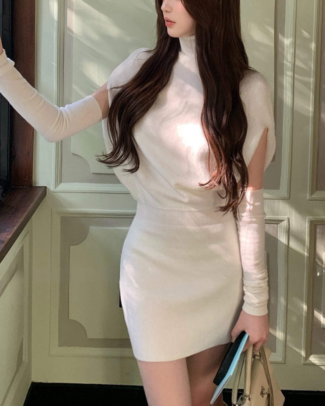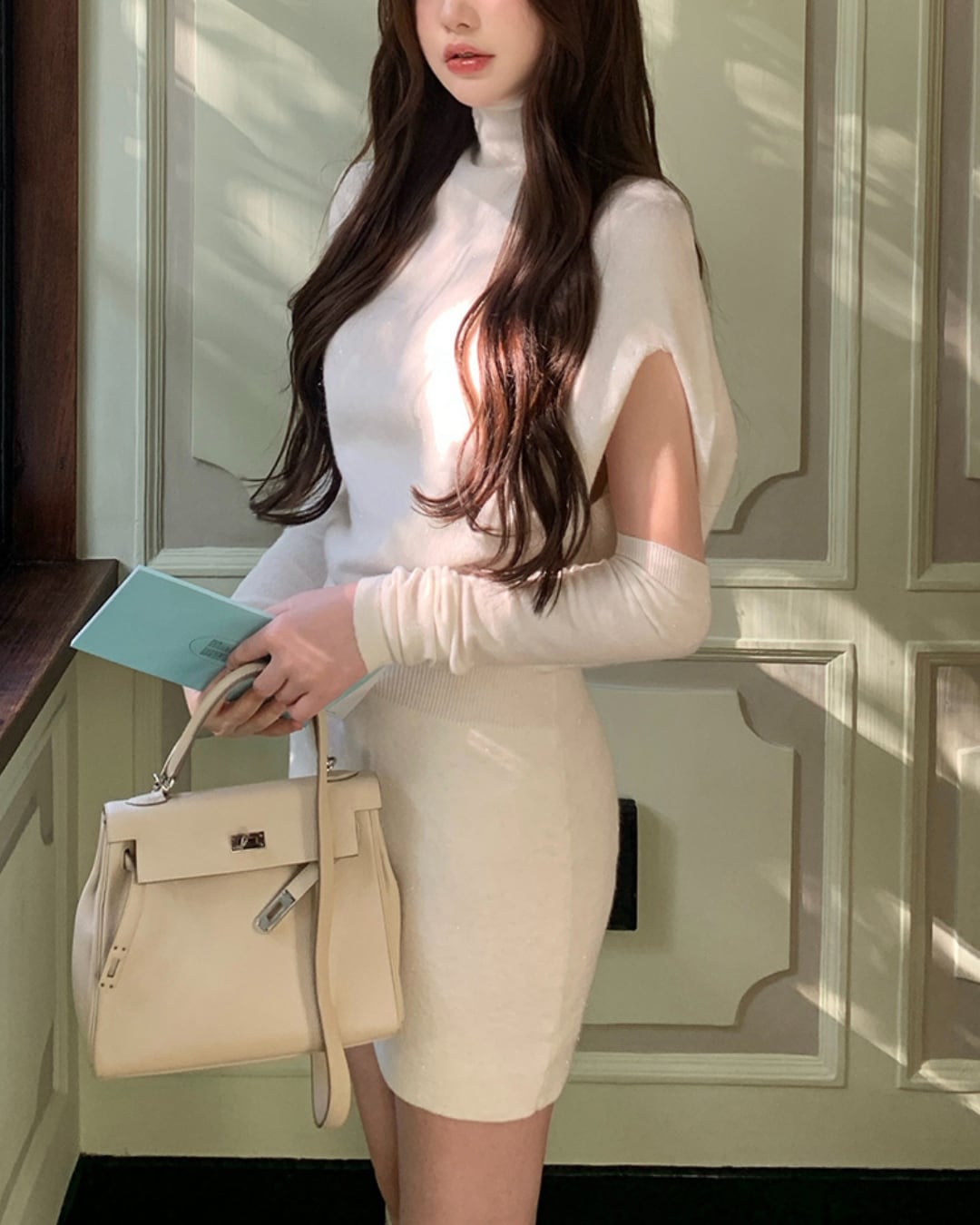 立体感のあるハイネックデザインとタイトめなシルエットで、シンプルながらも洗練された印象を与えるニットワンピース。ノースリーブワンピースにアームカバーがセットになっており、気分やシーンに合わせて着こなしをアレンジできます。伸縮性のある生地でストレスフリーな着心地。ベージュとホワイトの2色展開で、ナチュラルな大人の魅力を引き立てます。