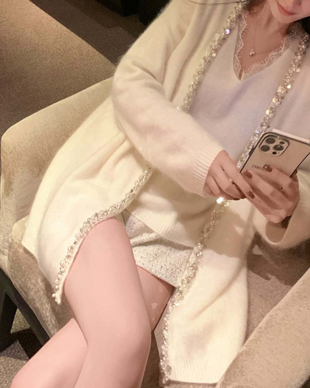 #ビジューカーディガン #ふわもこニット #フェミニンコーデ #大人ガーリー #パール付きトップス