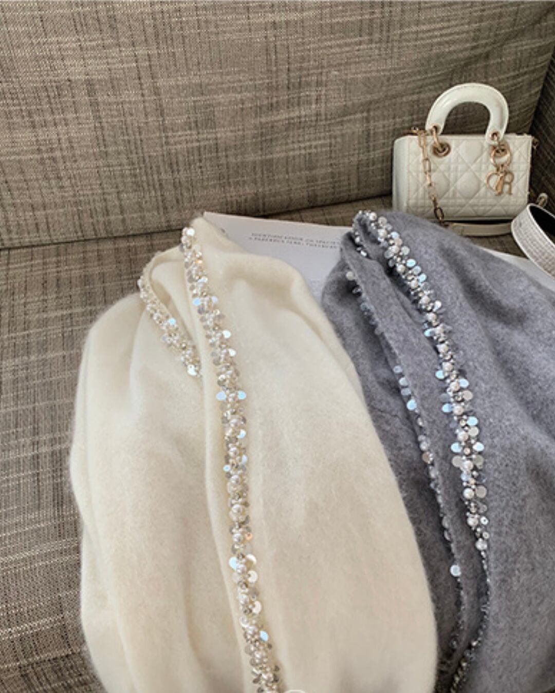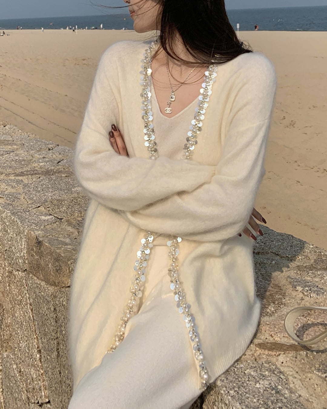華やかなビジューが贅沢に並ぶ、フェミニンムード漂うニットカーディガン。毛足のあるやわらかな美麗ウール素材で、見た目にも暖かく、ふんわりと包み込まれるような優しい着心地が魅力です。襟元からフロントラインにかけて敷き詰められたパールとスパンコールが、まるで夜空の星のようにきらめき、上品さと可憐さを両立。羽織るだけでコーデを格上げしてくれる、秋冬にぴったりの主役アイテムです。