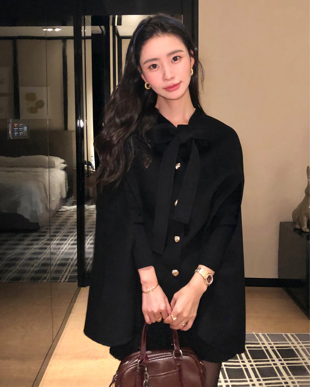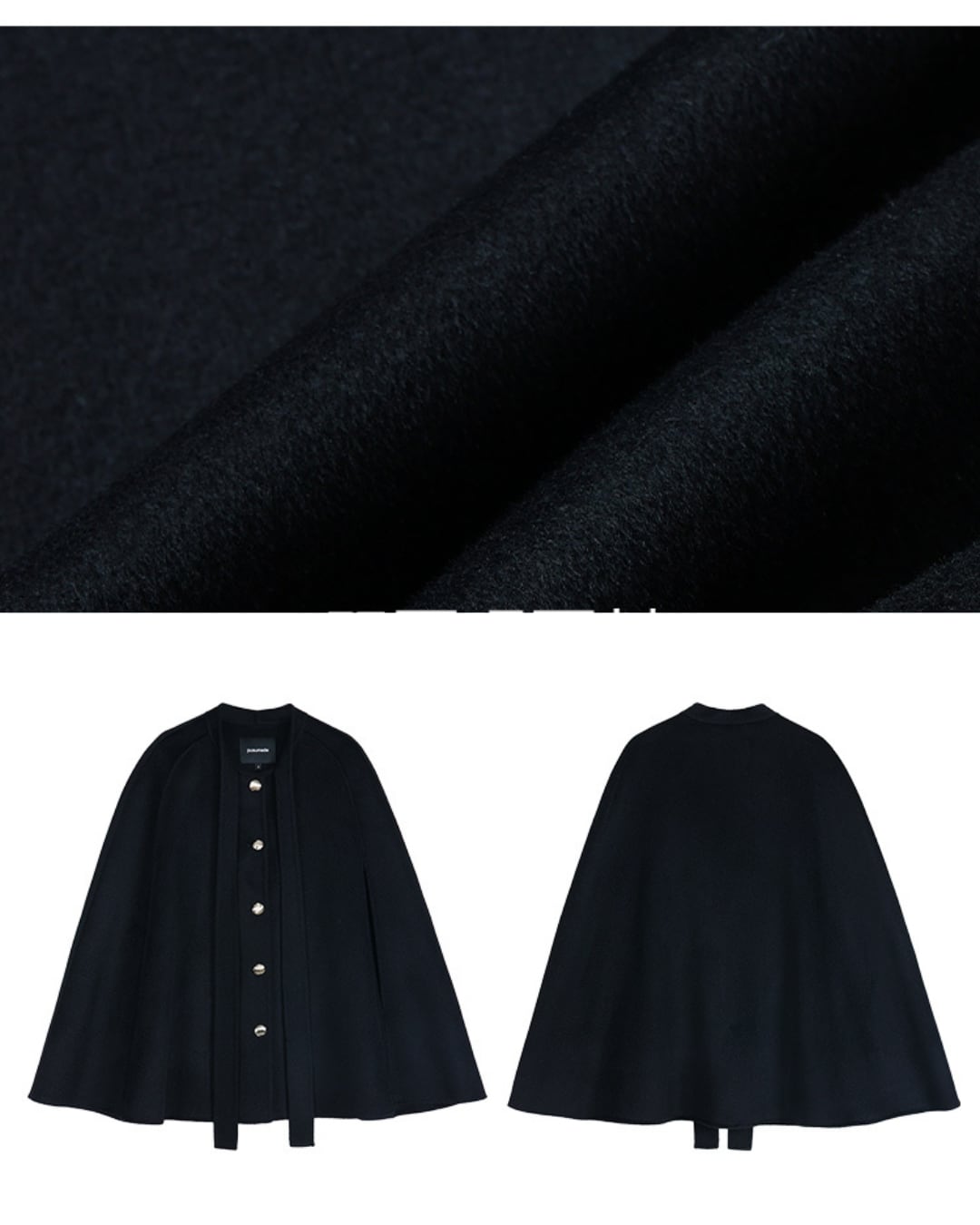 100%ウールのダブルフェイス素材を贅沢に使用した、洗練された印象のケープコート。やわらかなラウンドネックにリボンタイが付いたデザインは、クラシカルで上品なムードを演出しながらも甘すぎず、大人の可愛さを引き立てます。正面のゴールドボタンが程よいアクセントになり、前を開けても閉じても美しいシルエットを保ちます。ドロップショルダー風のゆったりとしたAラインシルエットが、体型を選ばず誰でもバランス良く着こなせる万能アウター。アイボリーはナチュラルな華やかさを、ブラックは落ち着いた高級感を漂わせ、シーンを問わず活躍する一着です。